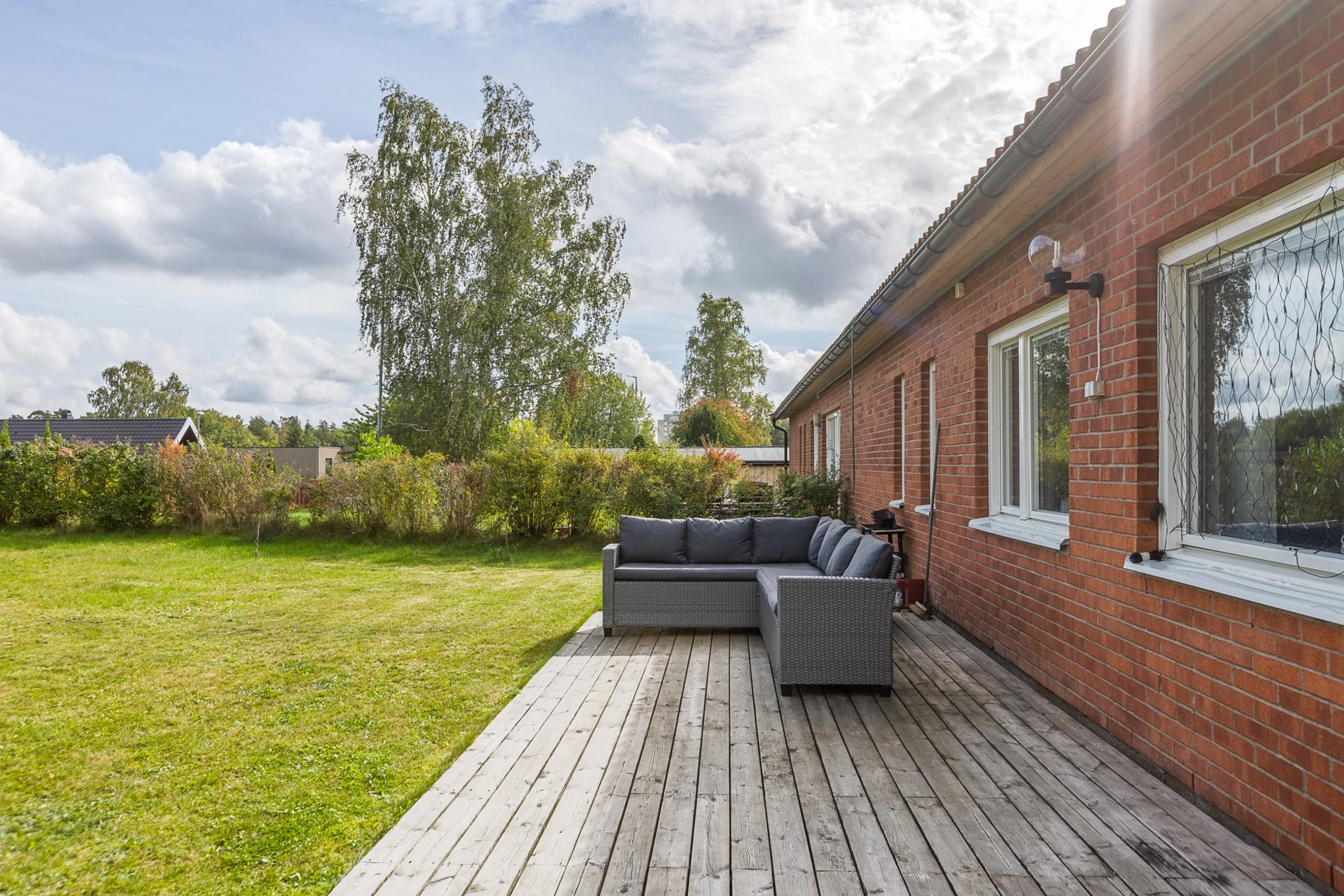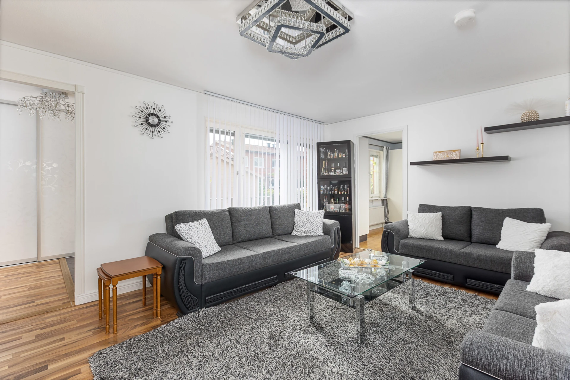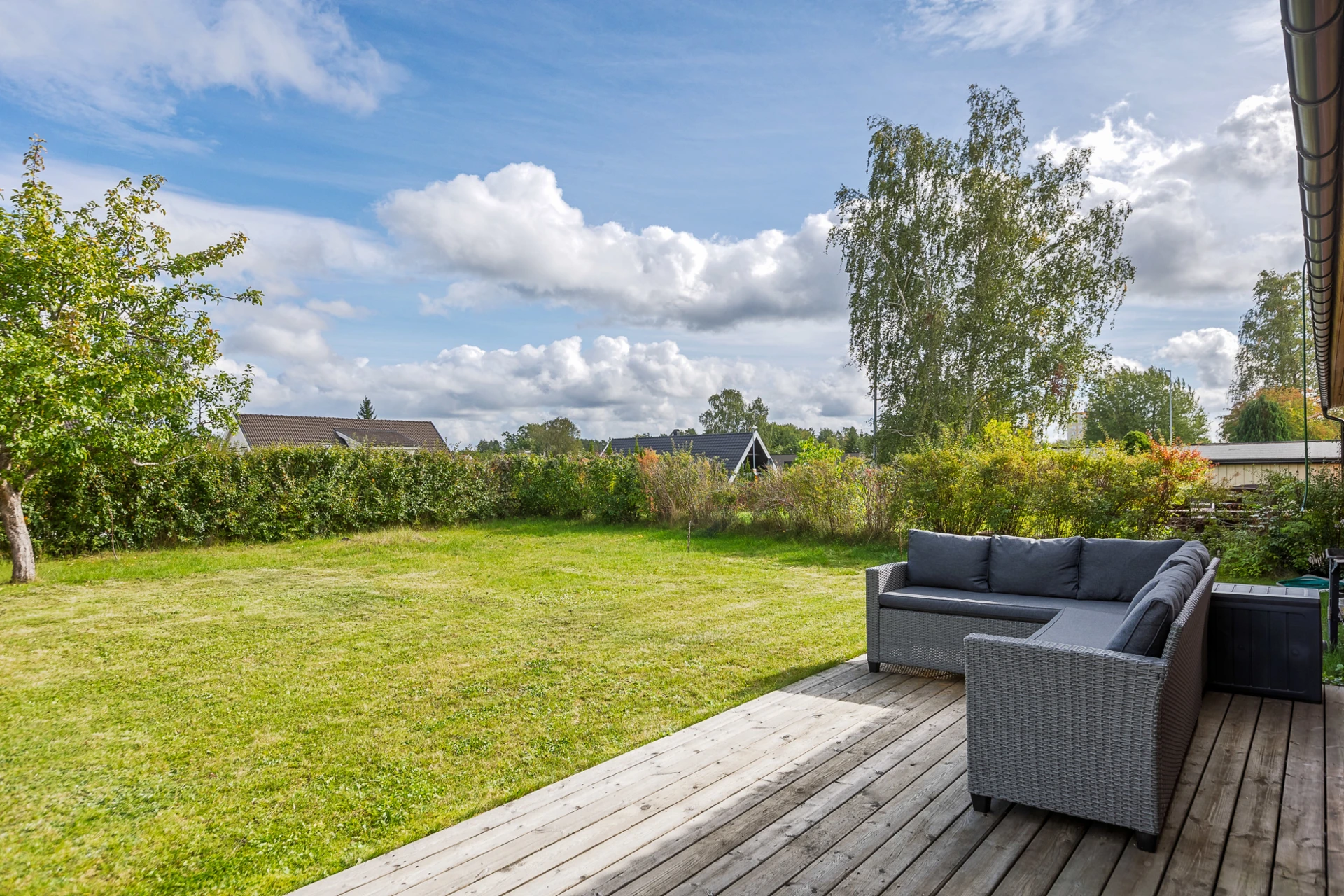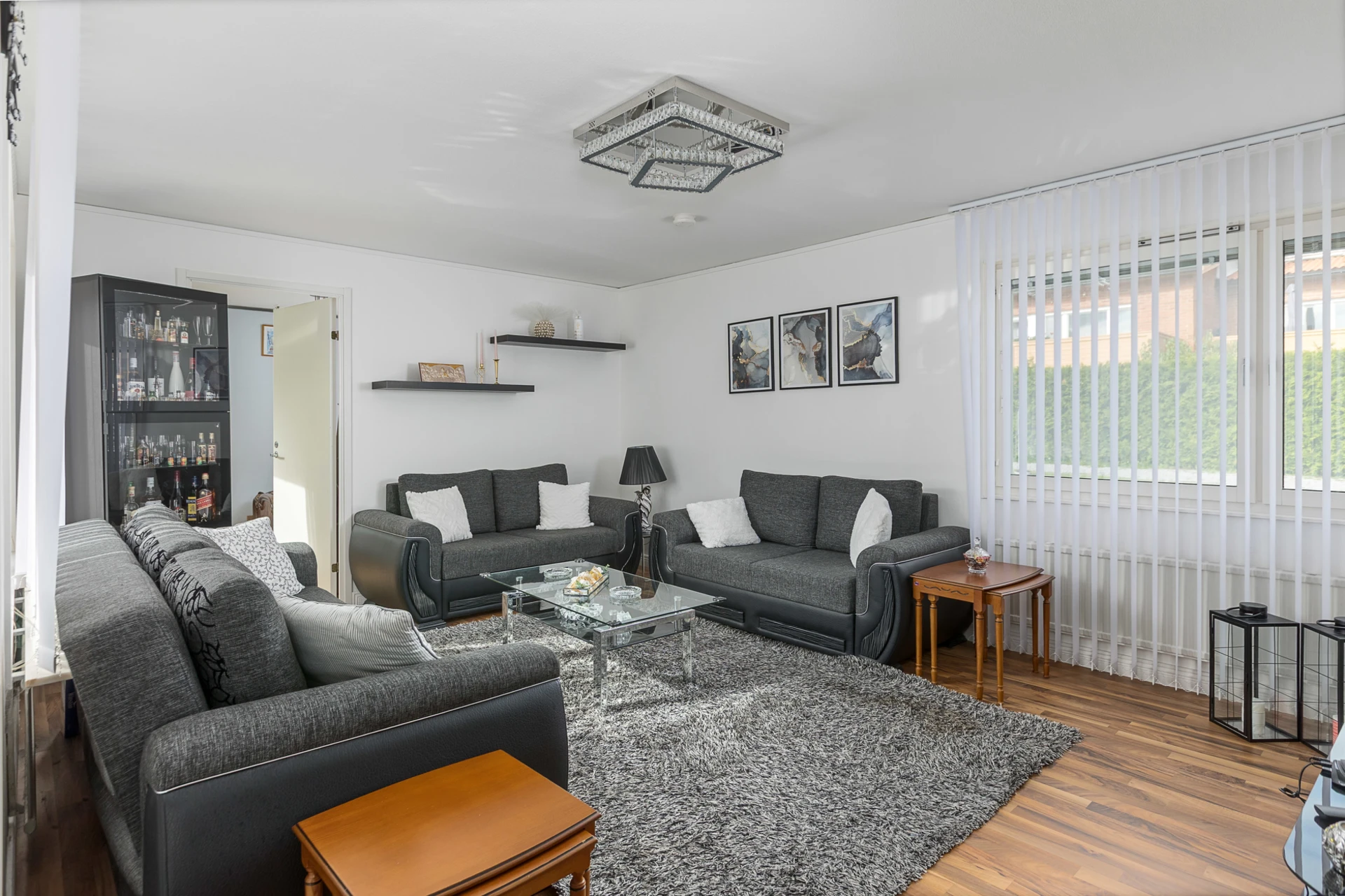 Trivsamt vardagsrum med generösa ytor och plats för både soffgrupp och matsalsmöbel. De stora fönsterpartierna ger ett fint ljusinsläpp och skapar en ljus och inbjudande atmosfär. Ett rum som fungerar lika bra för avkoppling som för umgänge.