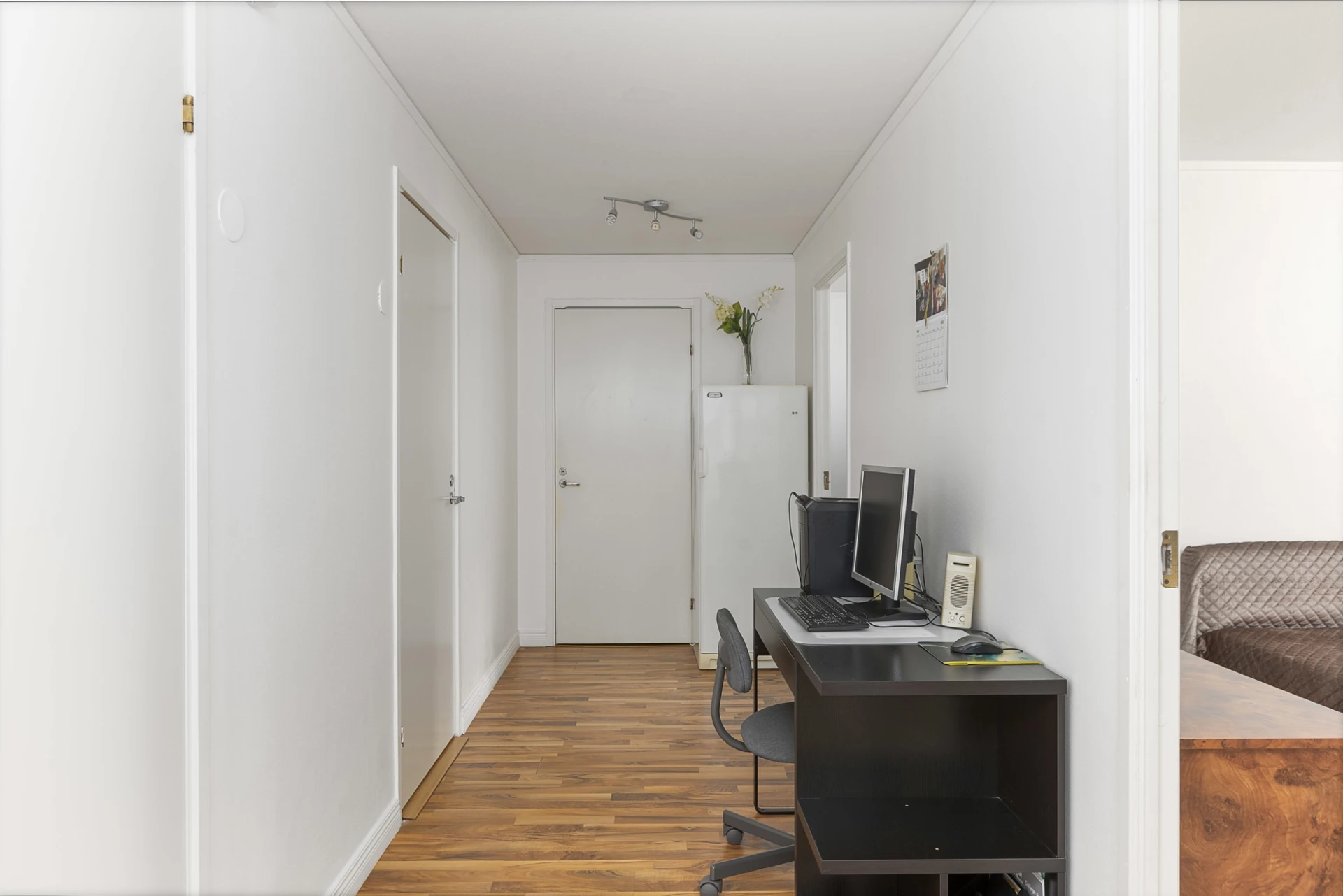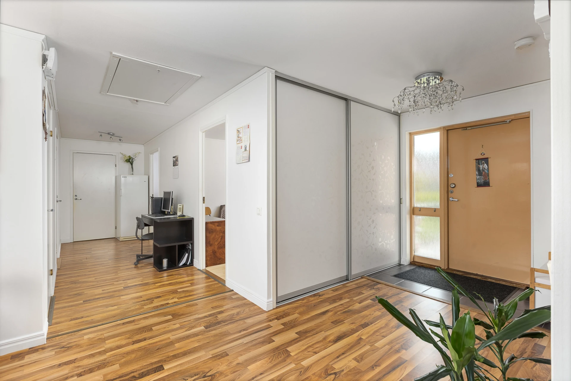 Välkomnande hall med gott om plats för avhängning och förvaring. Här möts du av ljusa ytskikt som ger ett fräscht intryck och en praktisk planlösning som binder samman bostadens rum på ett naturligt sätt.