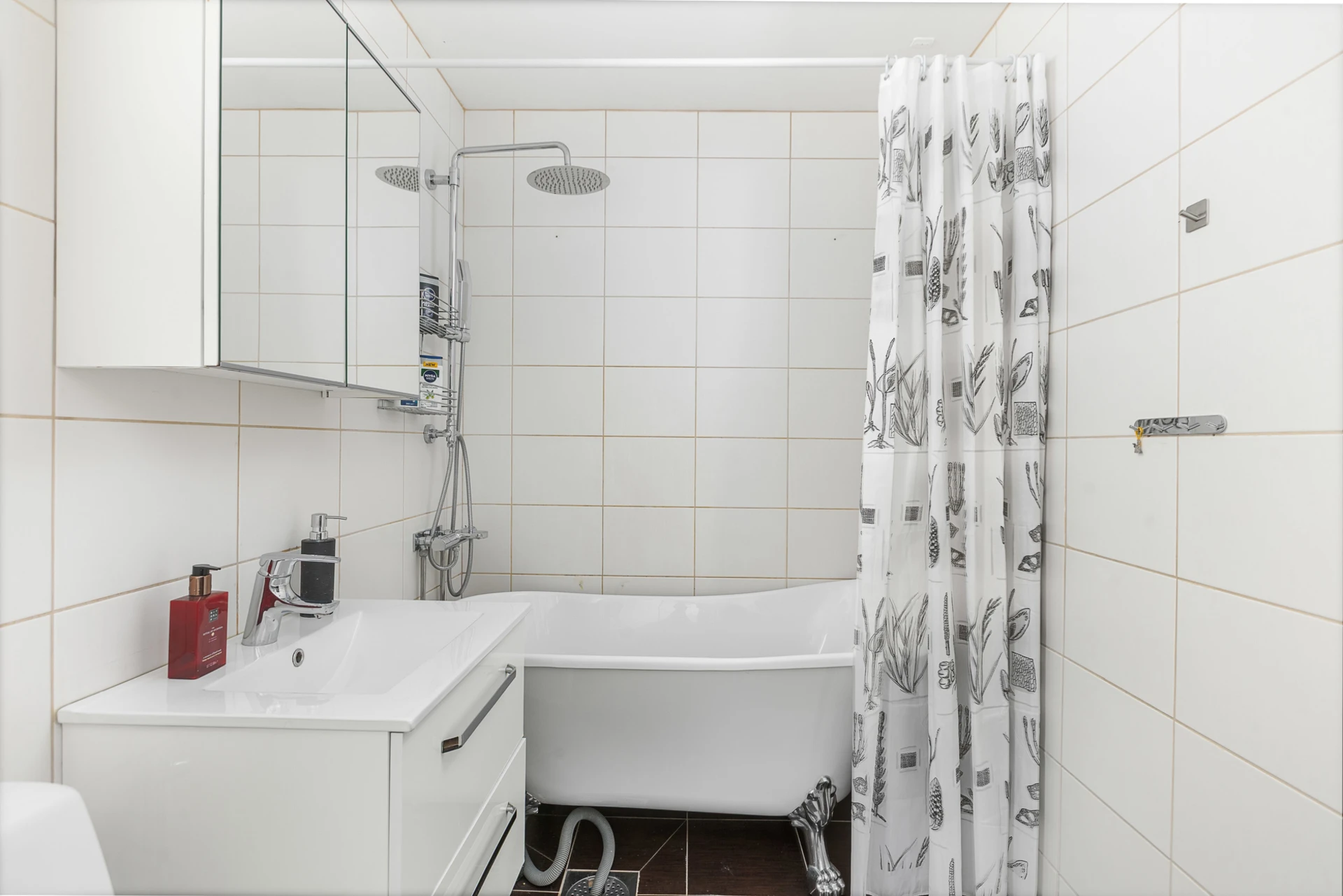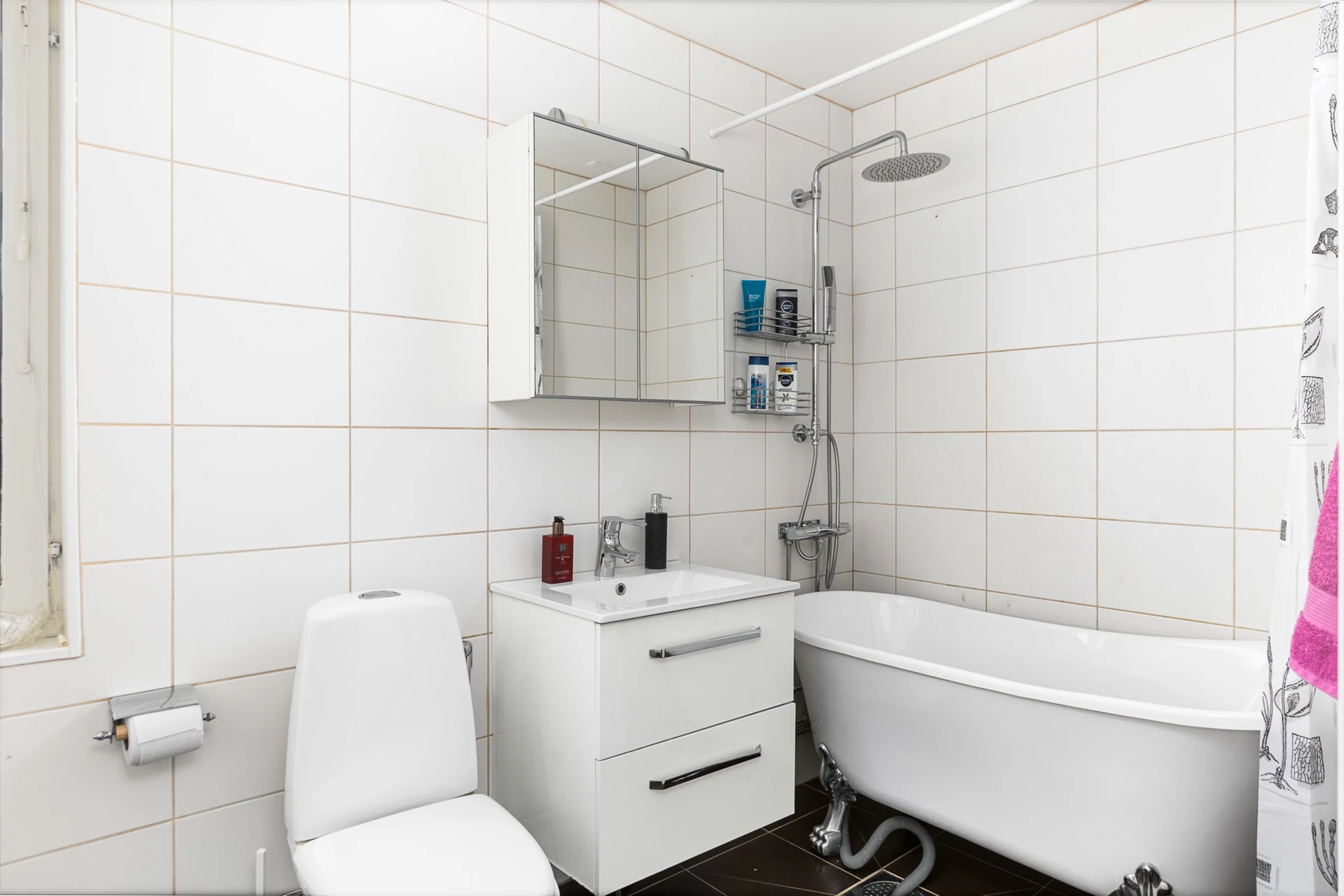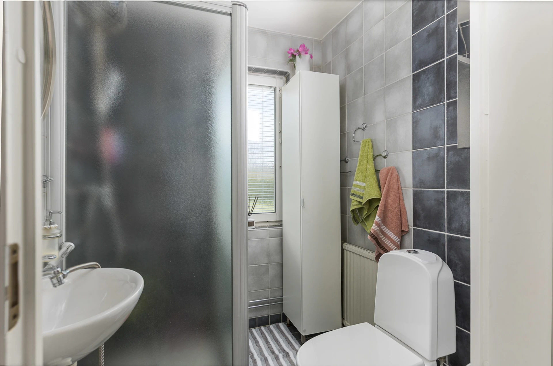 Praktiskt och helkaklat badrum med klinkergolv. Utrustat med wc, handfat med kommod samt duschhörna. Ljusa ytskikt och stilrena materialval ger ett fräscht intryck.