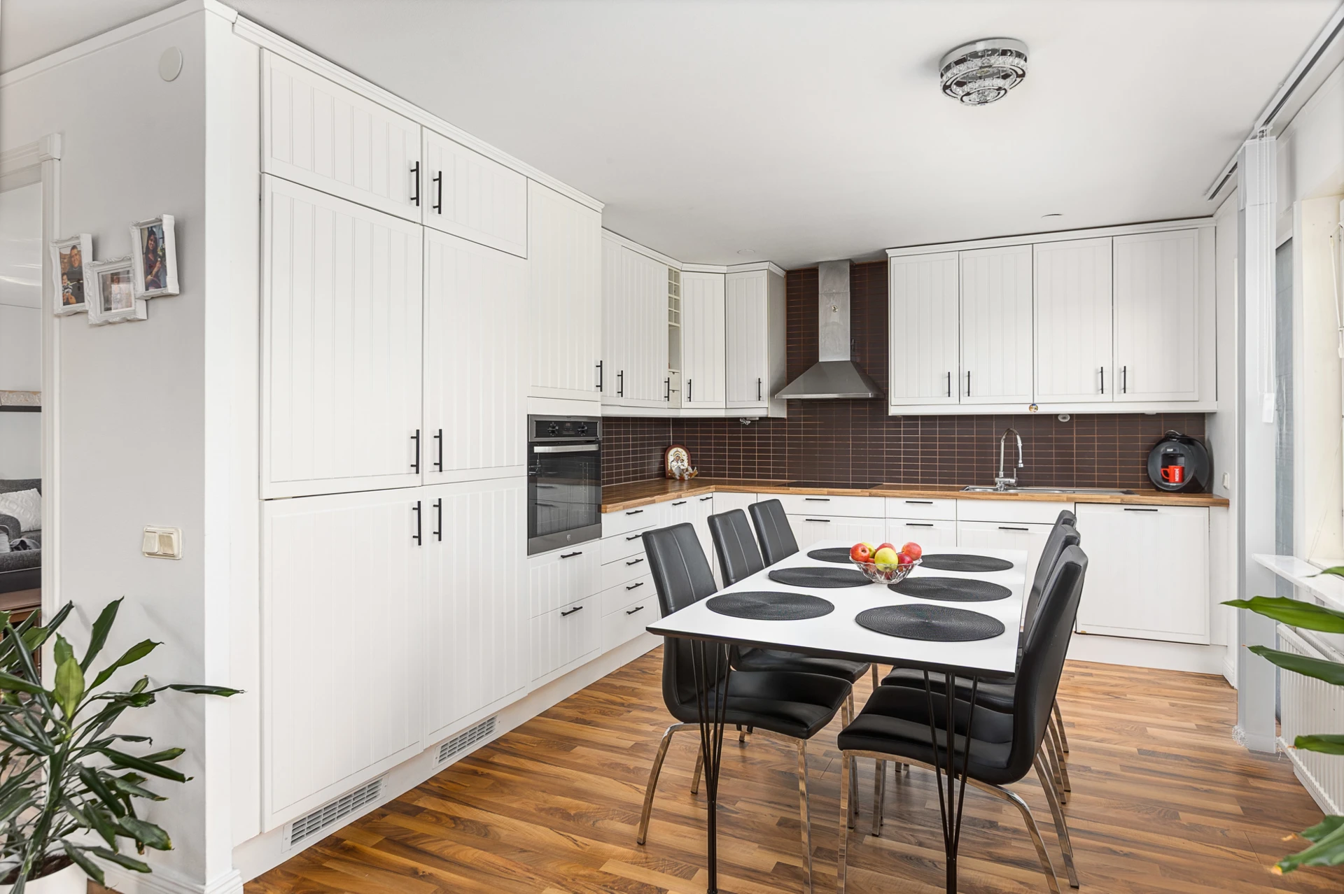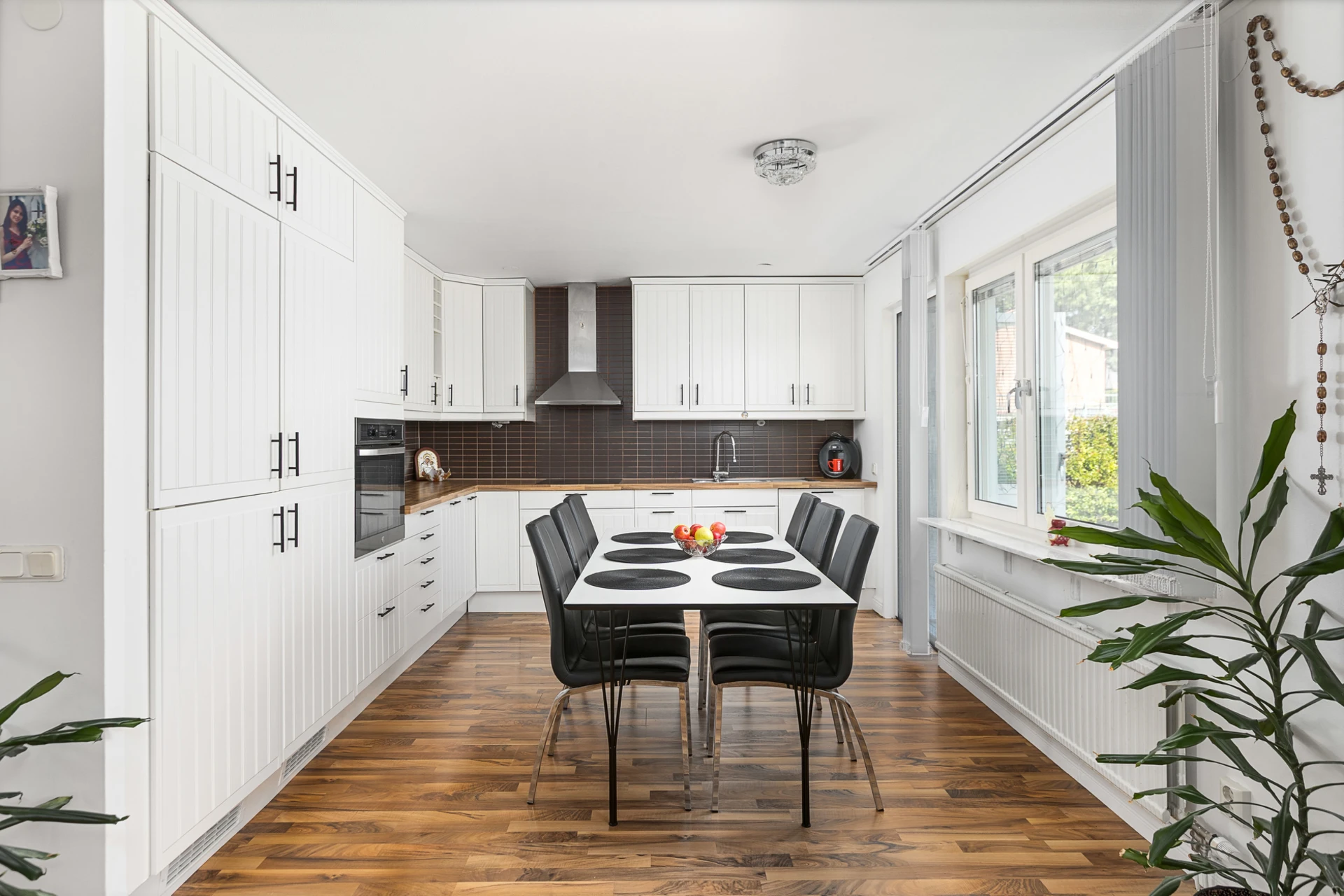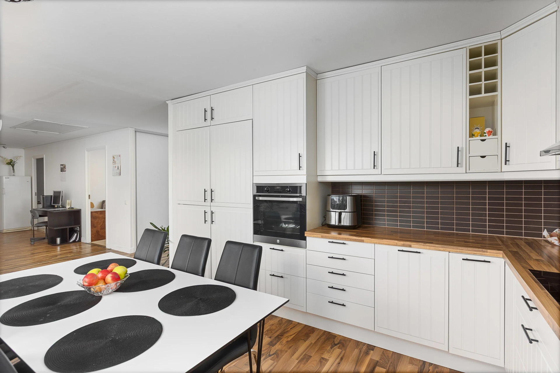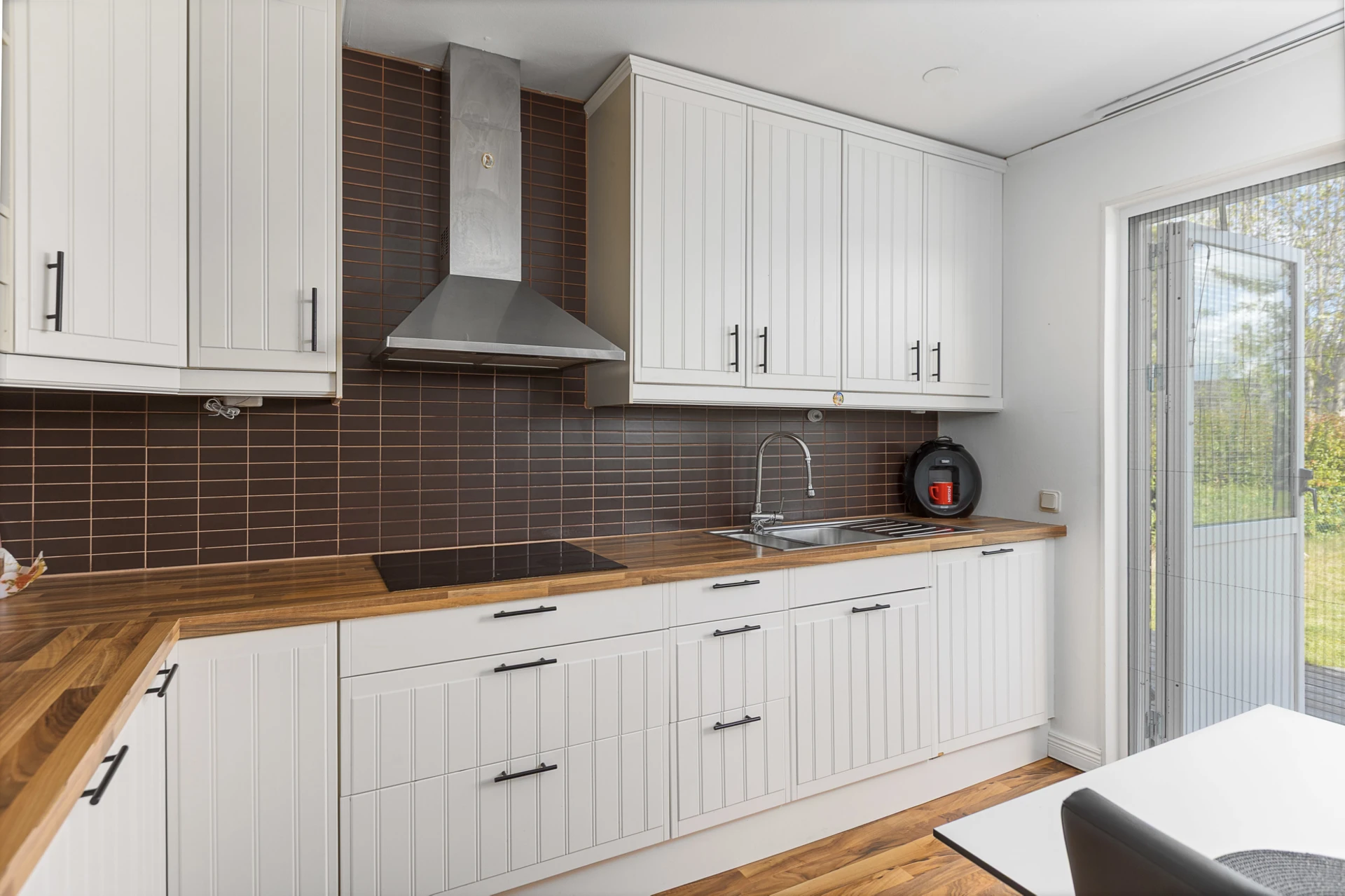 Stilrent och välplanerat kök med vita skåpsluckor, gott om förvaring och arbetsbänk i trä som bryts av med mörkt kakel. Här finns moderna vitvaror, inbyggd ugn och spishäll med fläkt. Intill köket finns en rymlig matplats med stora fönster som ger fint ljusinsläpp och utgång mot trädgården – perfekt för både vardag och umgänge.