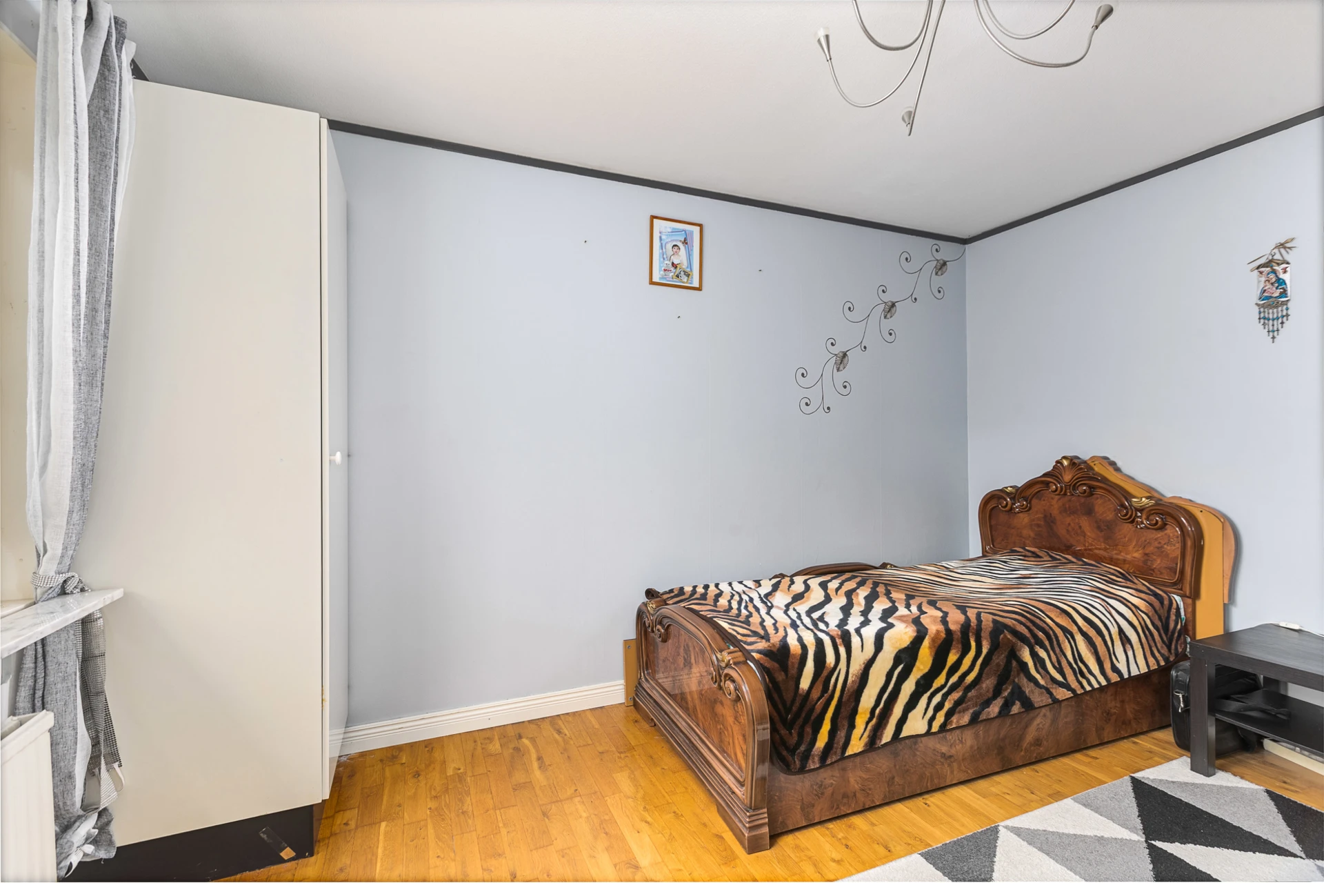 Rymligt master bedroom med stora fönster som släpper in rikligt med ljus. Gott om plats för dubbelsäng och förvaring.