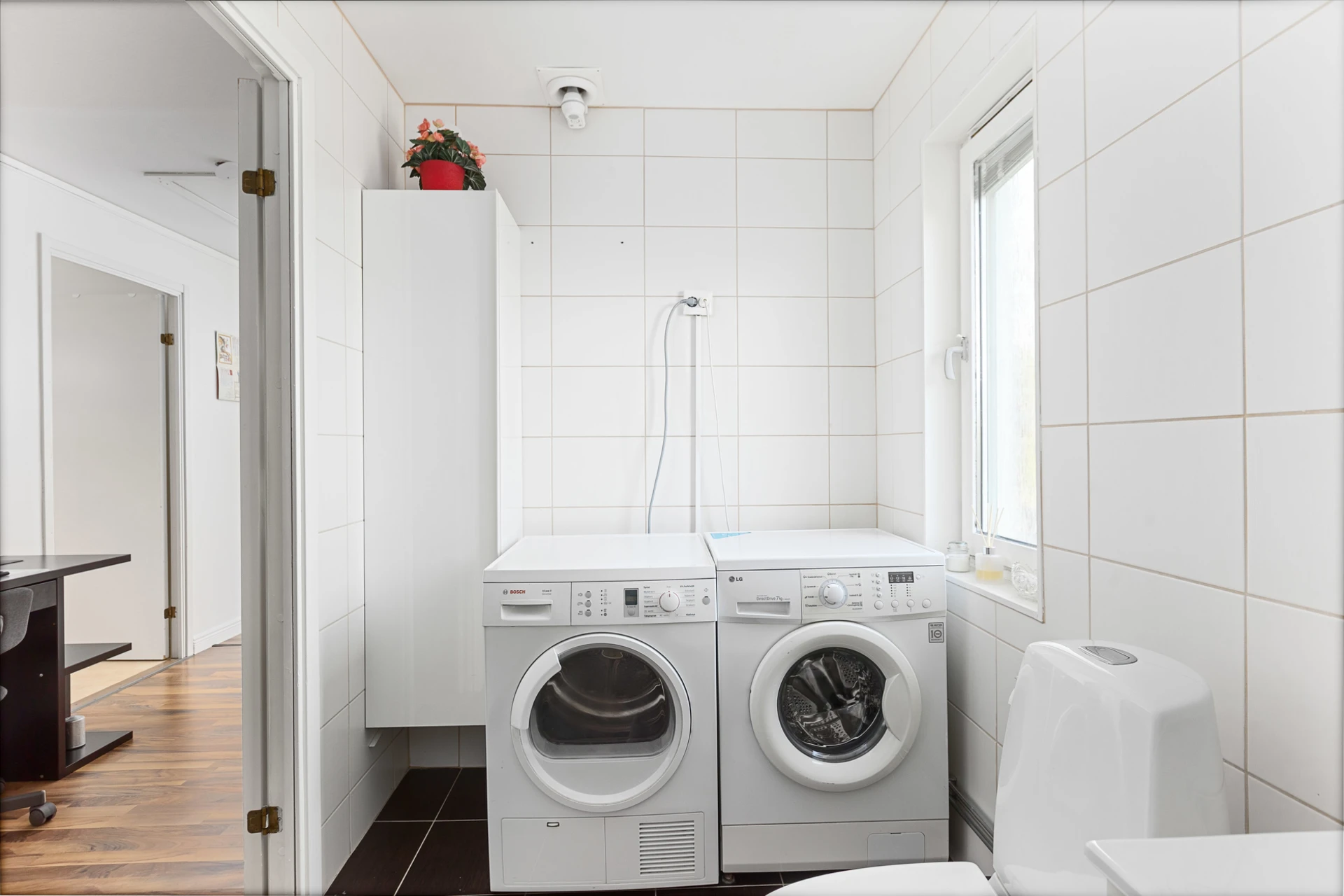 Rymligt och helkaklat badrum med klinkergolv och stilrena materialval. Här finns wc, handfat med kommod, spegelskåp samt dusch. Den smarta tvättdelen är utrustad med både tvättmaskin och torktumlare samt praktisk arbetsbänk och förvaring – en funktionell lösning som underlättar vardagen.