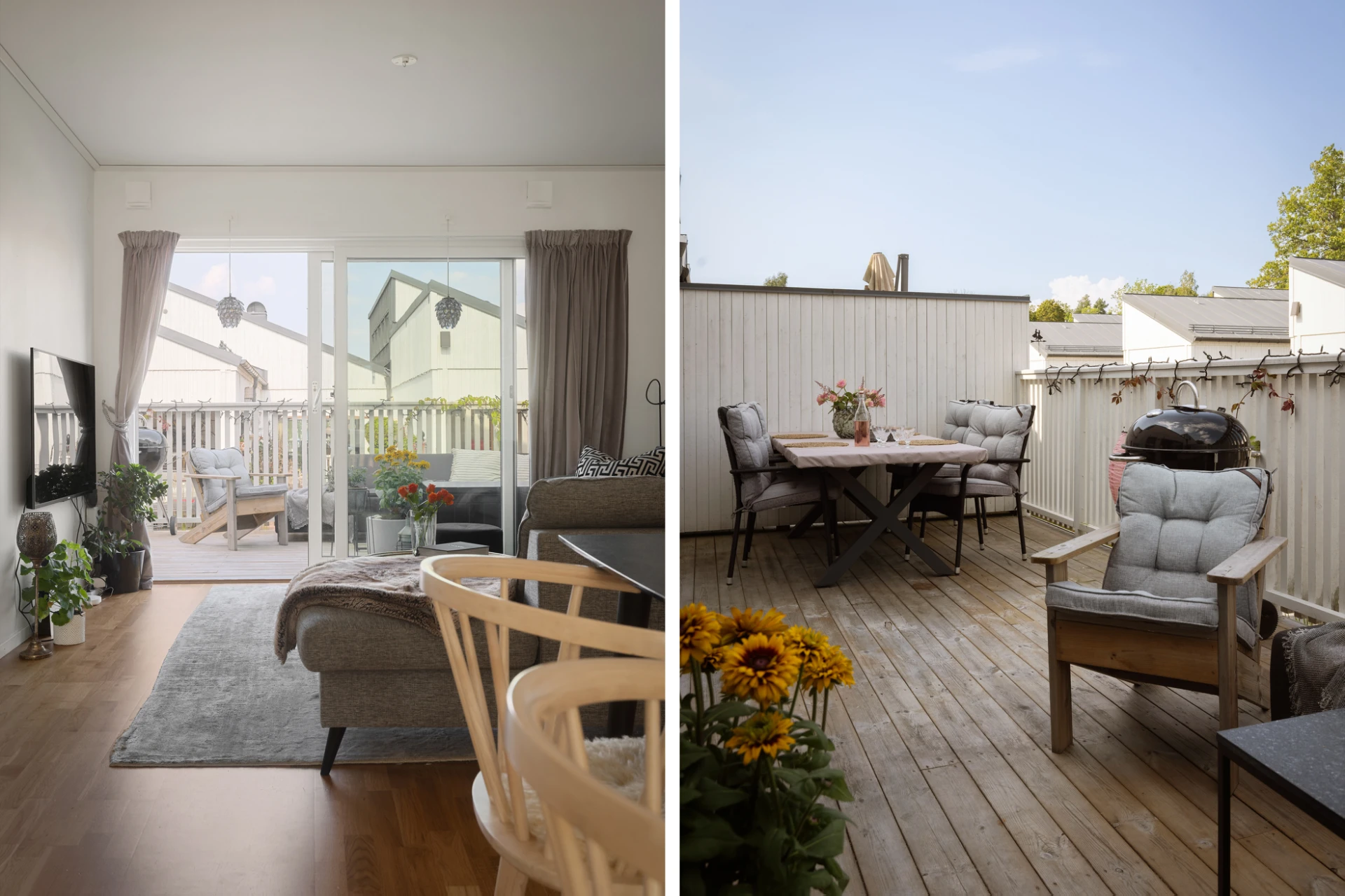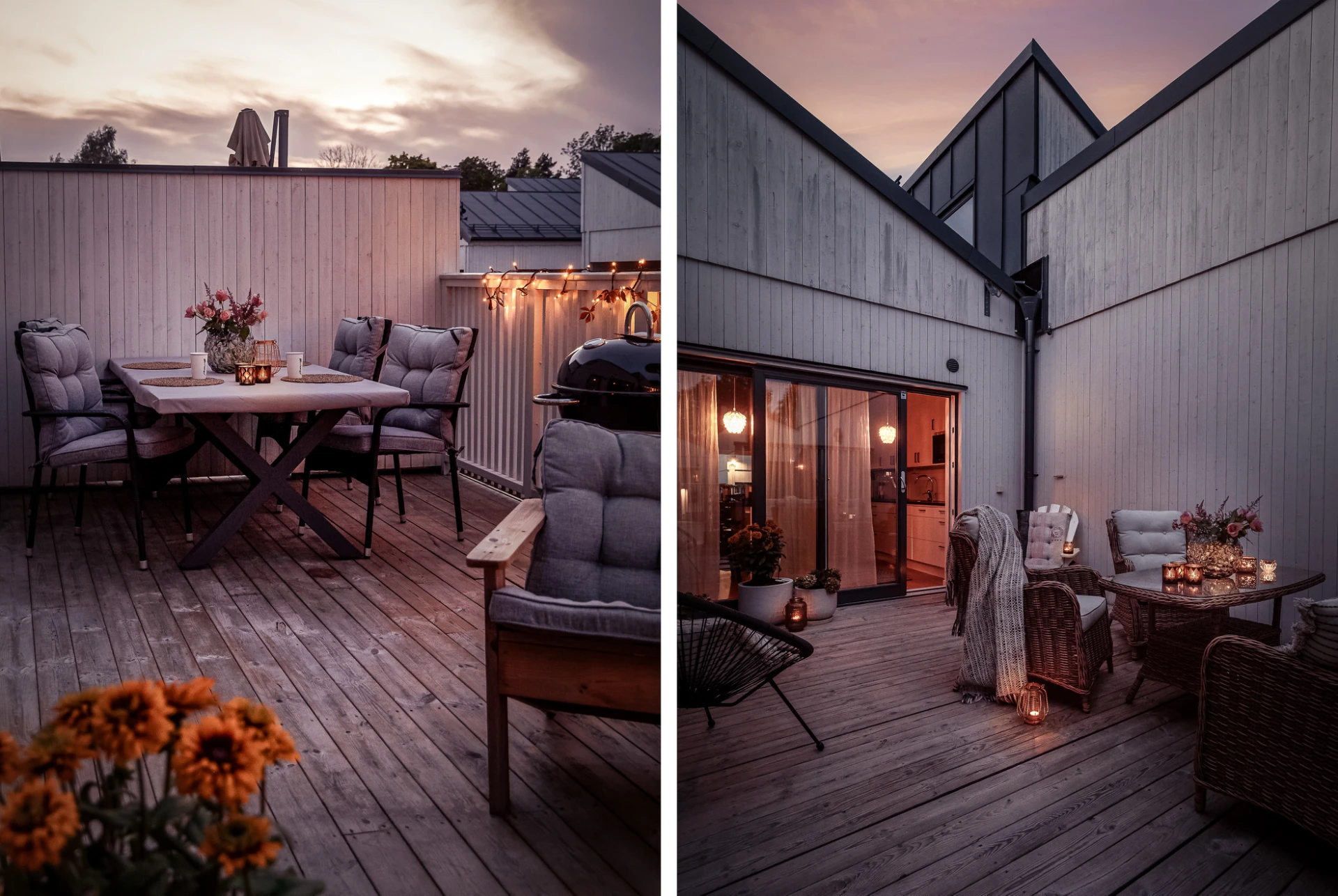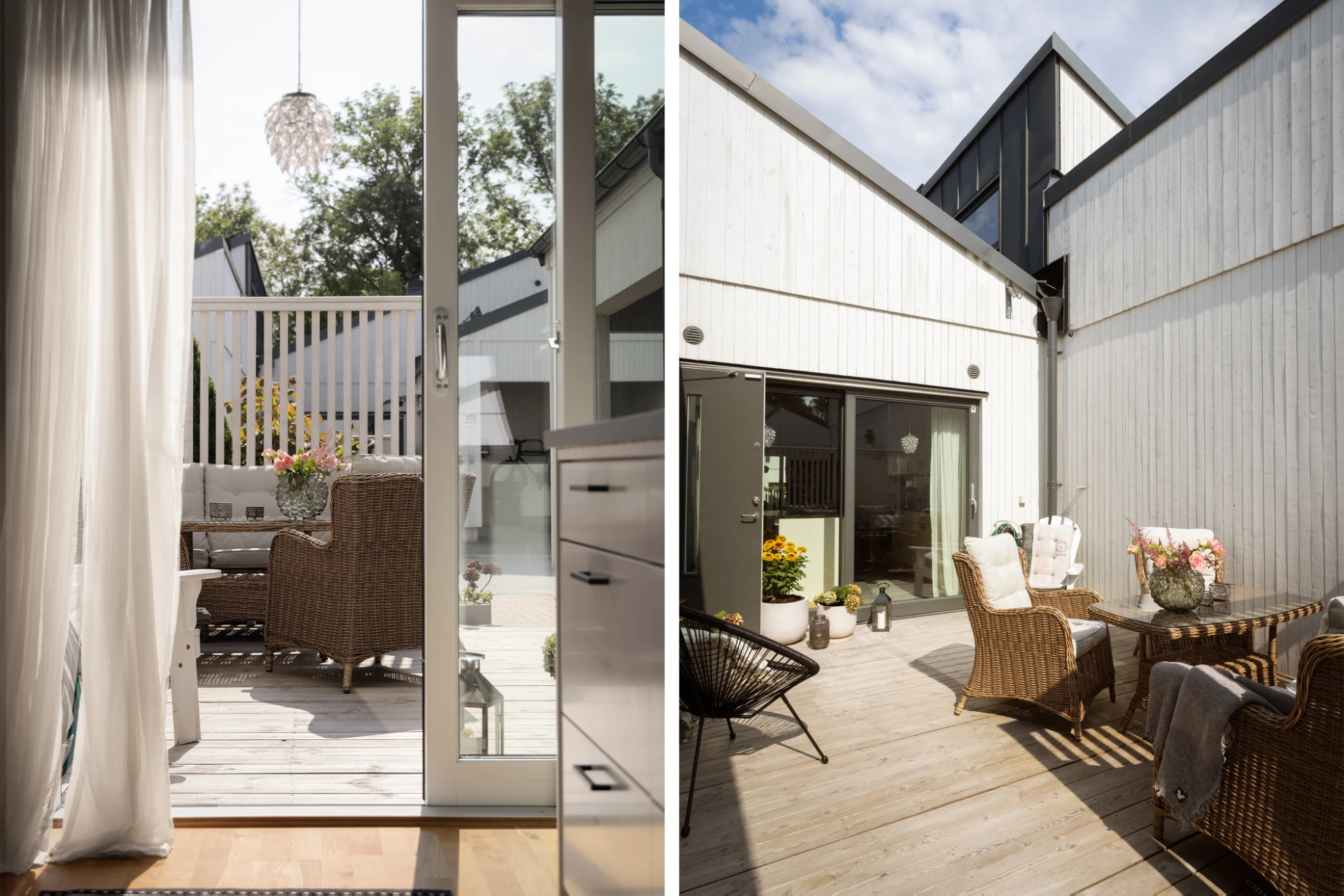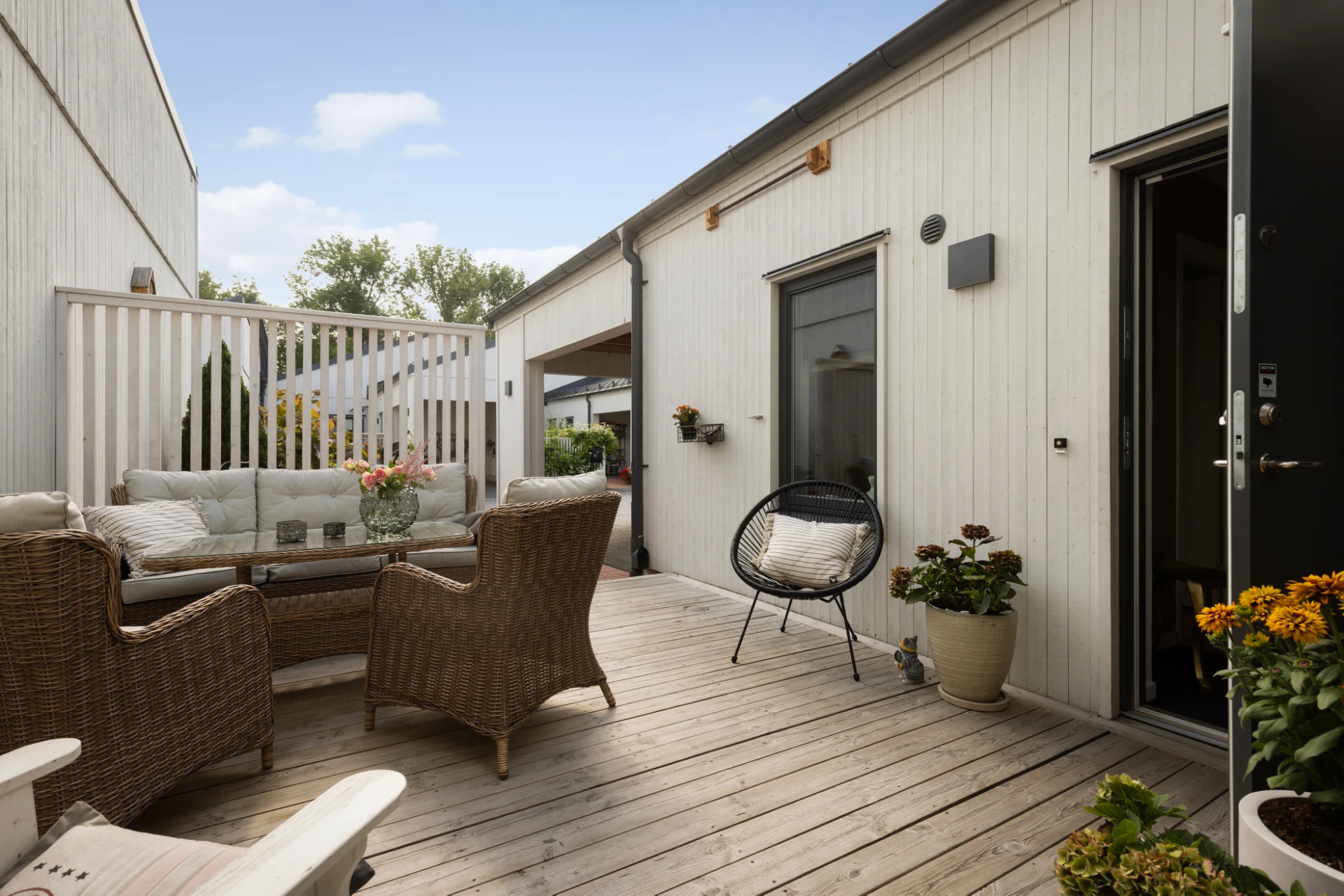 Utemiljön är något utöver det vanliga. På baksidan finner du en stor avskild altan med gott om plats för middagar, grillkvällar och soliga dagar i lugn avskildhet. På framsidan finns dessutom plats för en härlig loungegrupp – perfekt för morgonkaffet eller kvällens sista solstrålar.