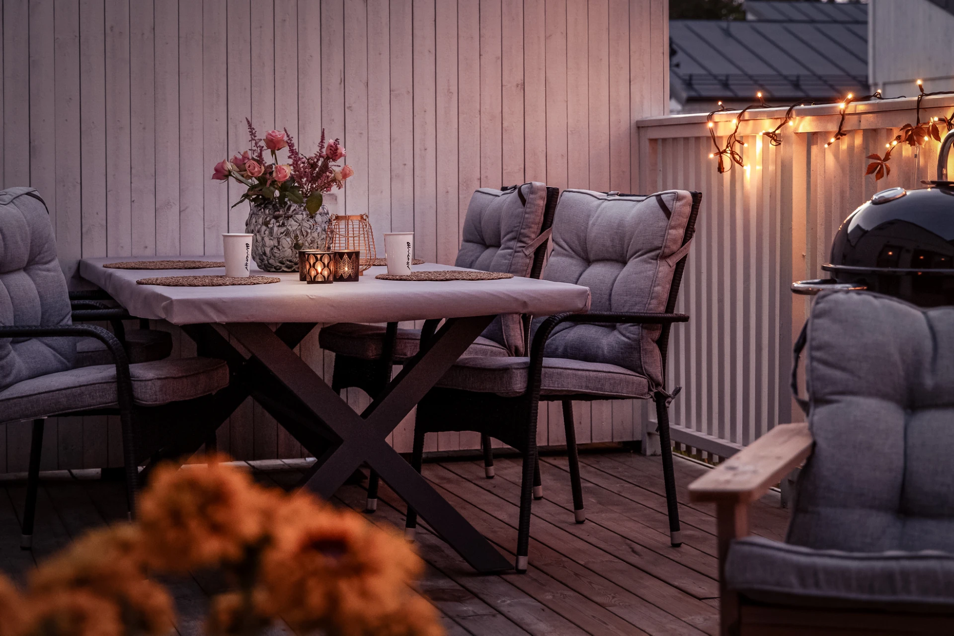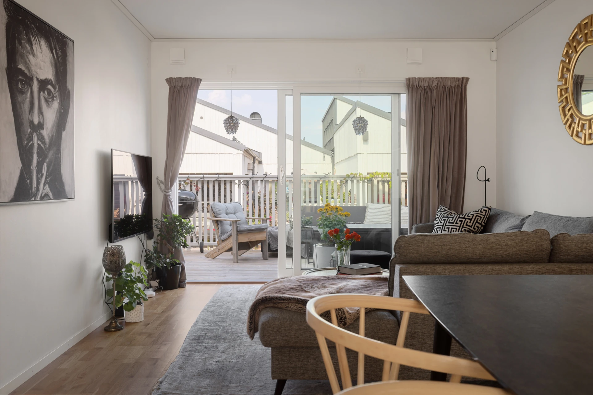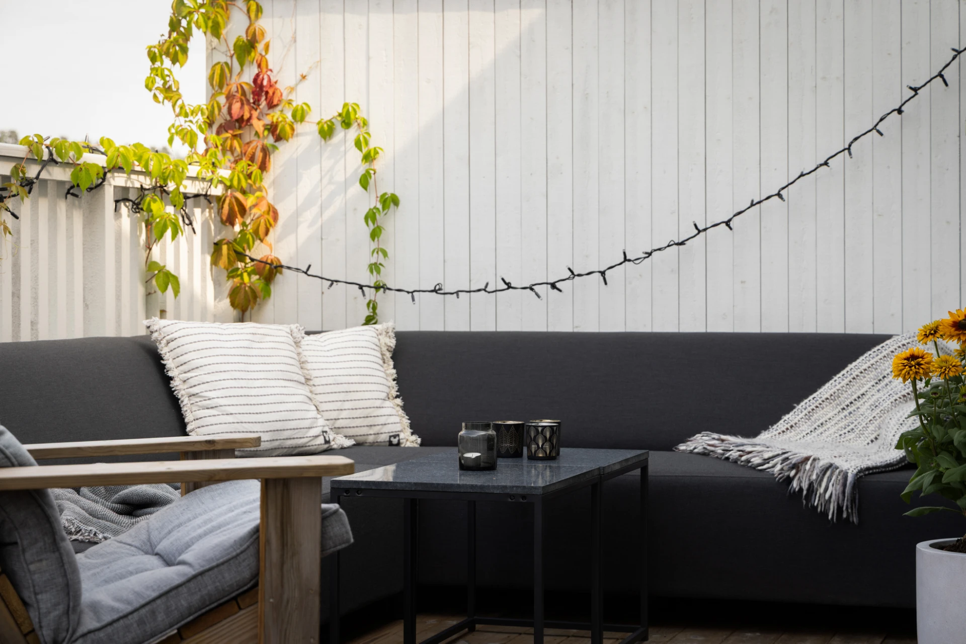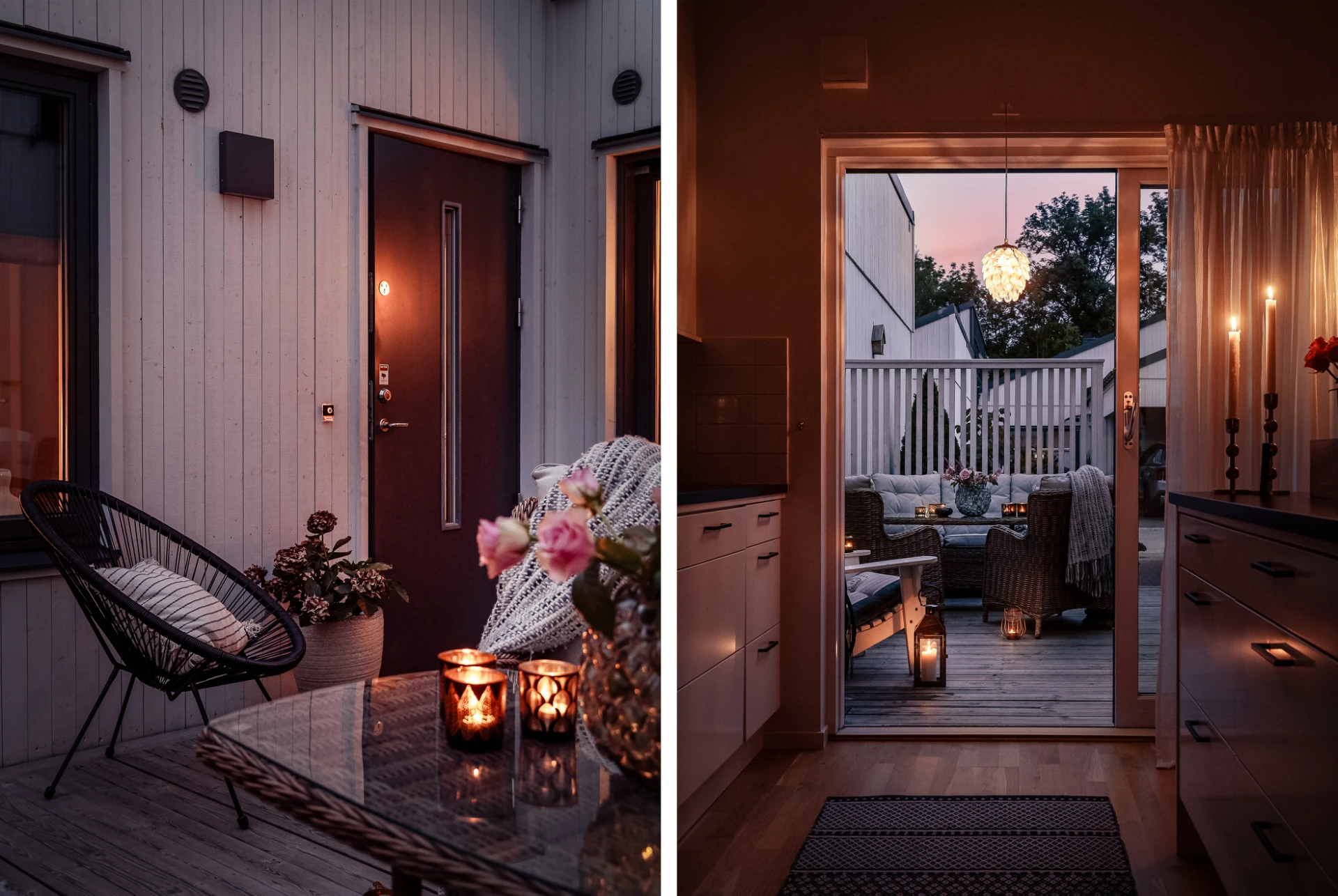 Utemiljön är något utöver det vanliga. På baksidan finner du en stor avskild altan med gott om plats för middagar, grillkvällar och soliga dagar i lugn avskildhet. På framsidan finns dessutom plats för en härlig loungegrupp – perfekt för morgonkaffet eller kvällens sista solstrålar.