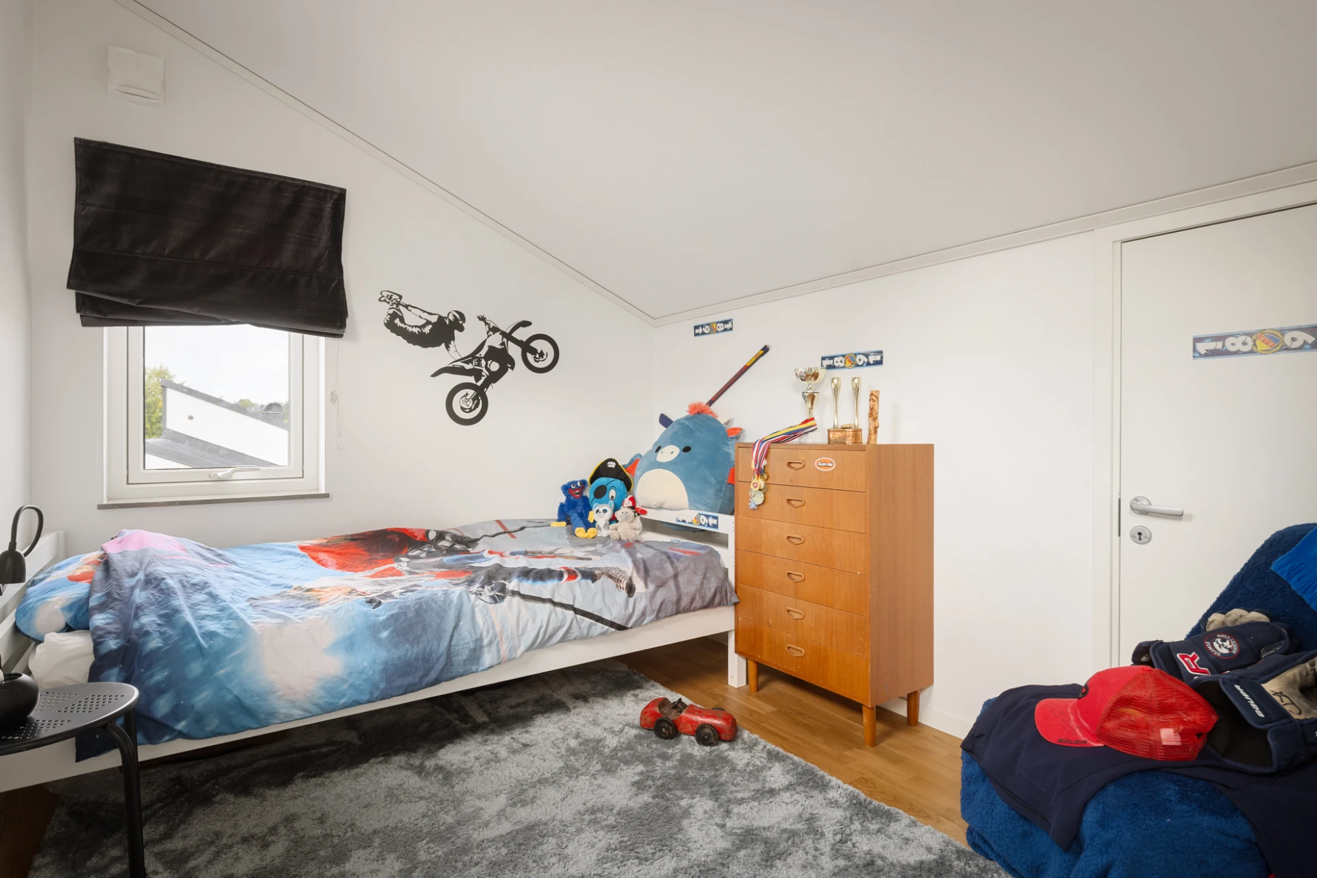 Ljusa väggar och parkettgolv. Ljusinsläpp via fönster. Plats för säng, byrå samt annan valfri möblering.