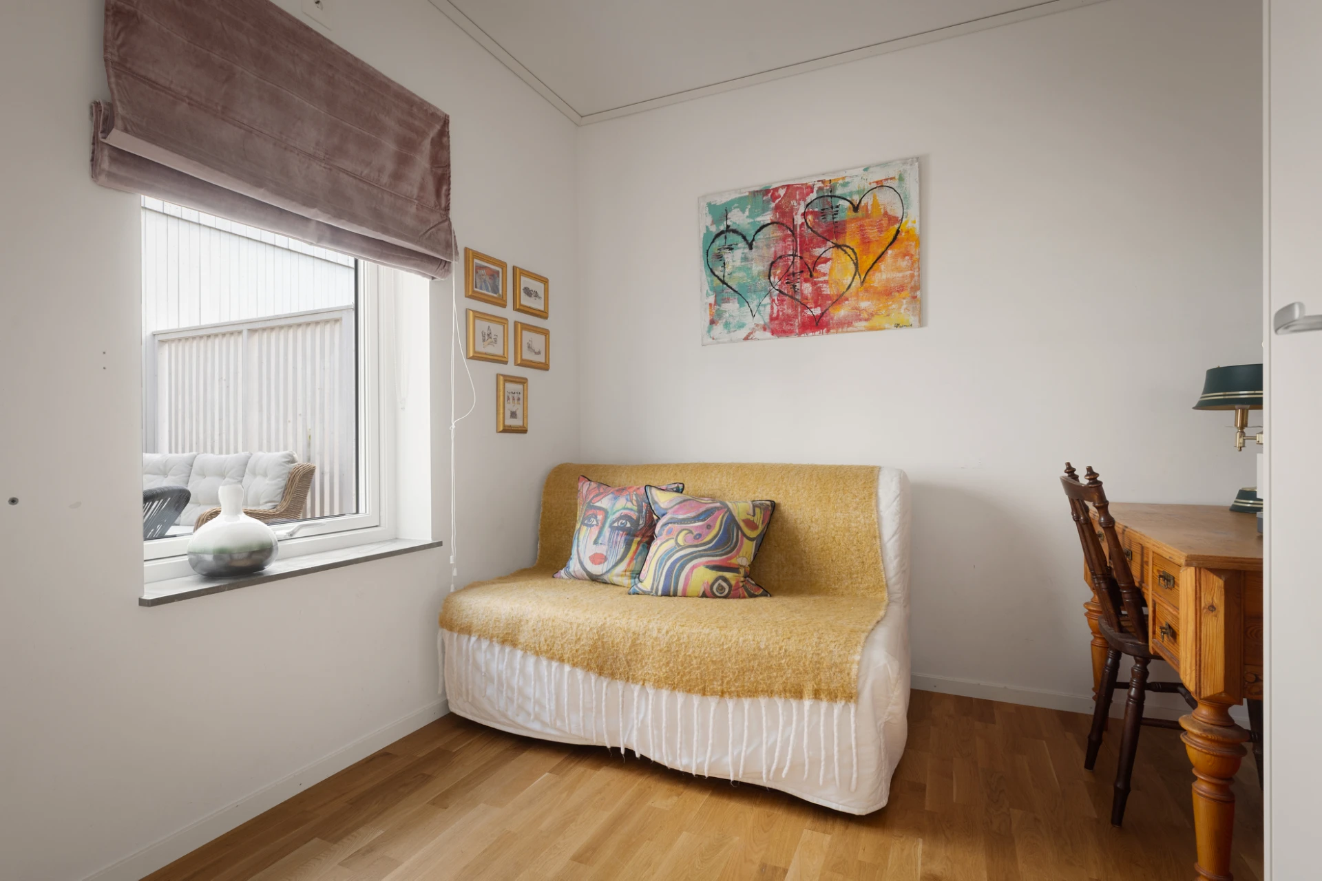 Ljusa väggar och parkettgolv. Vackert ljusinsläpp via glasdörr/fönster mot uteplatsen. Plats för soffa, soffbord eller annat valfritt möblemang.