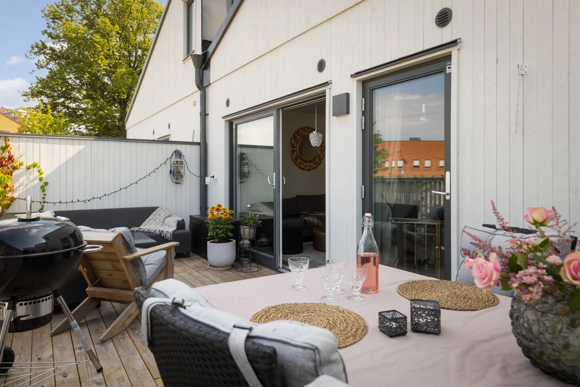 Mysig uteplats med plats för utemöbler och grill.