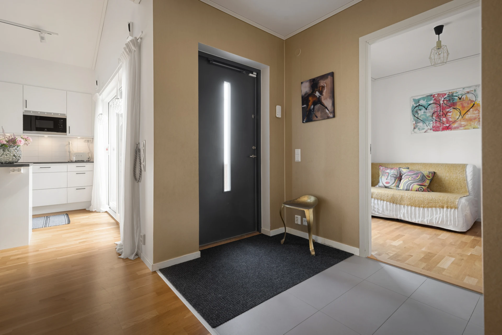 Välkomnande hall med sober färgsättning på väggar och ljust golv.