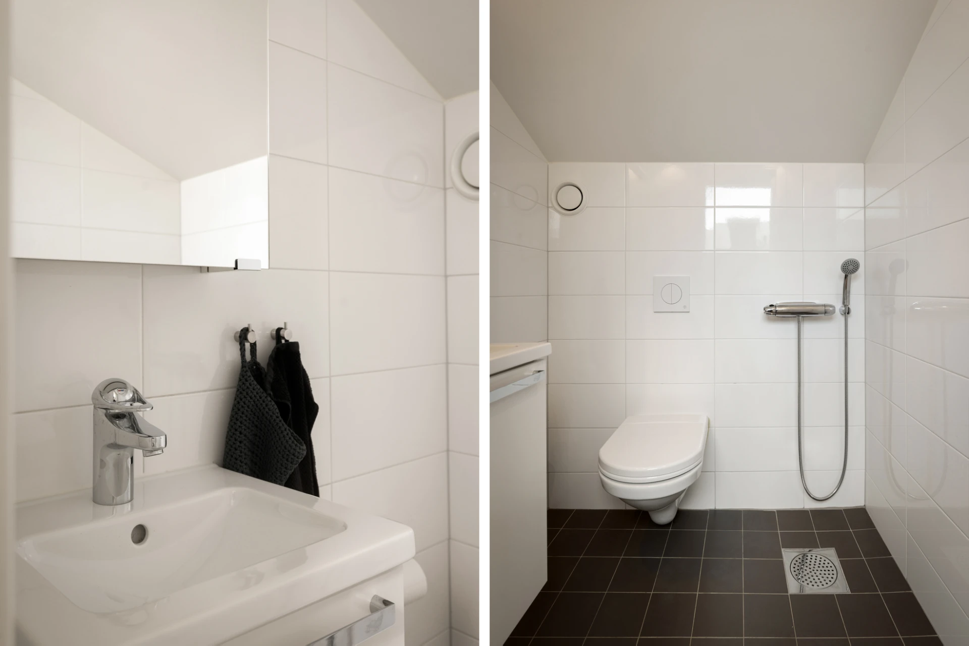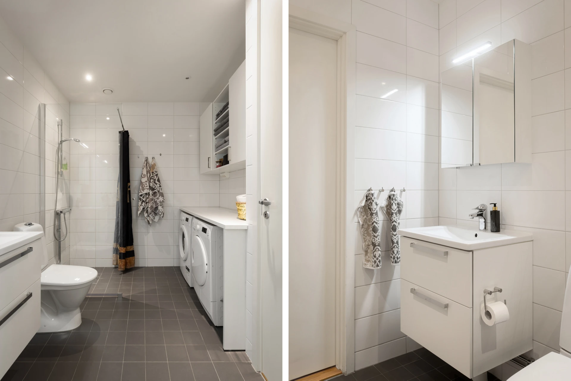 Ljust kakel på väggar och mörka klinkers på golv. Utrustat med wc, handfat med kommod, spegelskåp, dusch med glasvägg, tvätt-och torktumlare samt vägghängt förvaringsskåp.