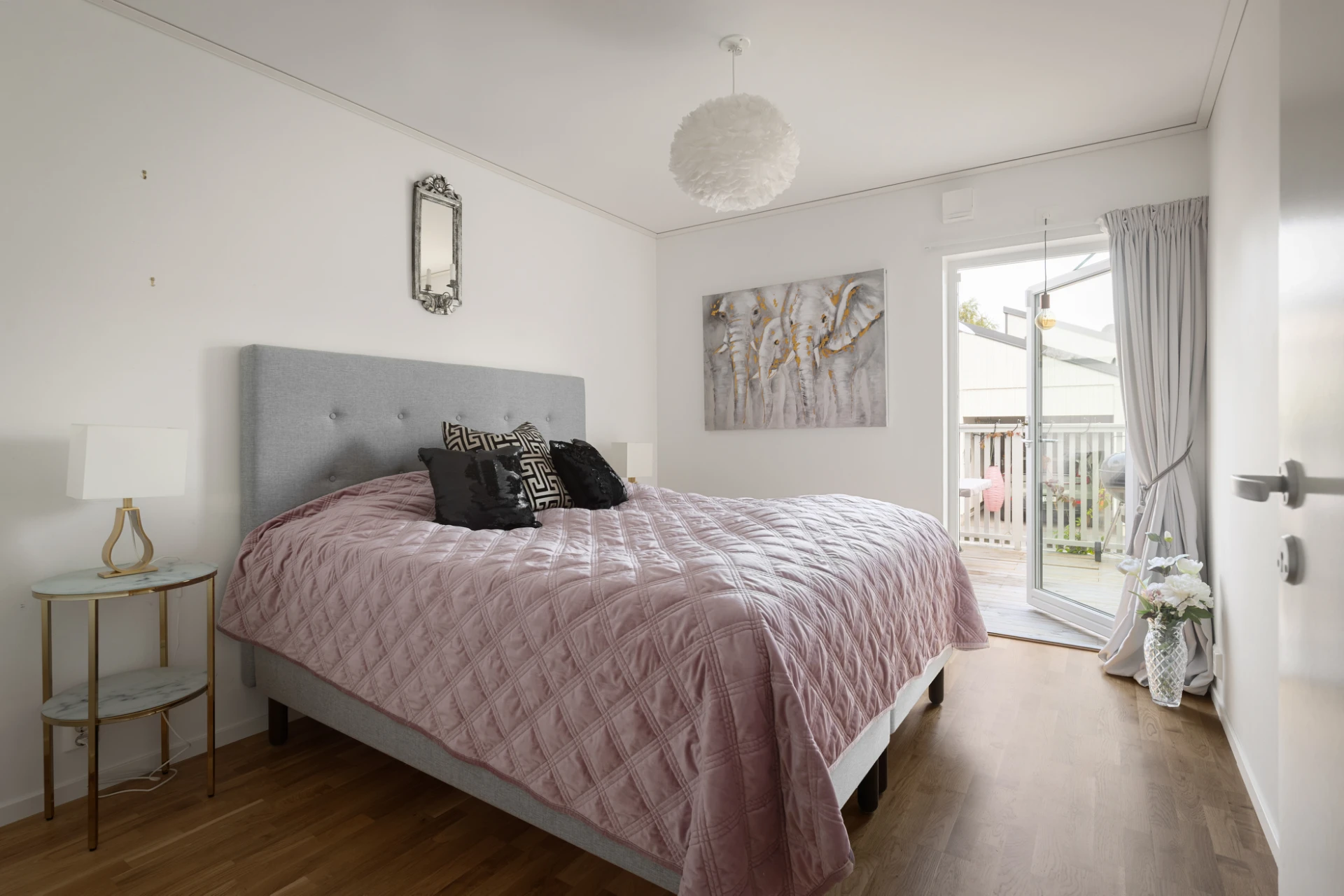 Ljusa väggar och parkettgolv. Plats för dubbelsäng sängbord eller annan valfri möblering. Ljusinsläpp via glasdörr till uteplats.