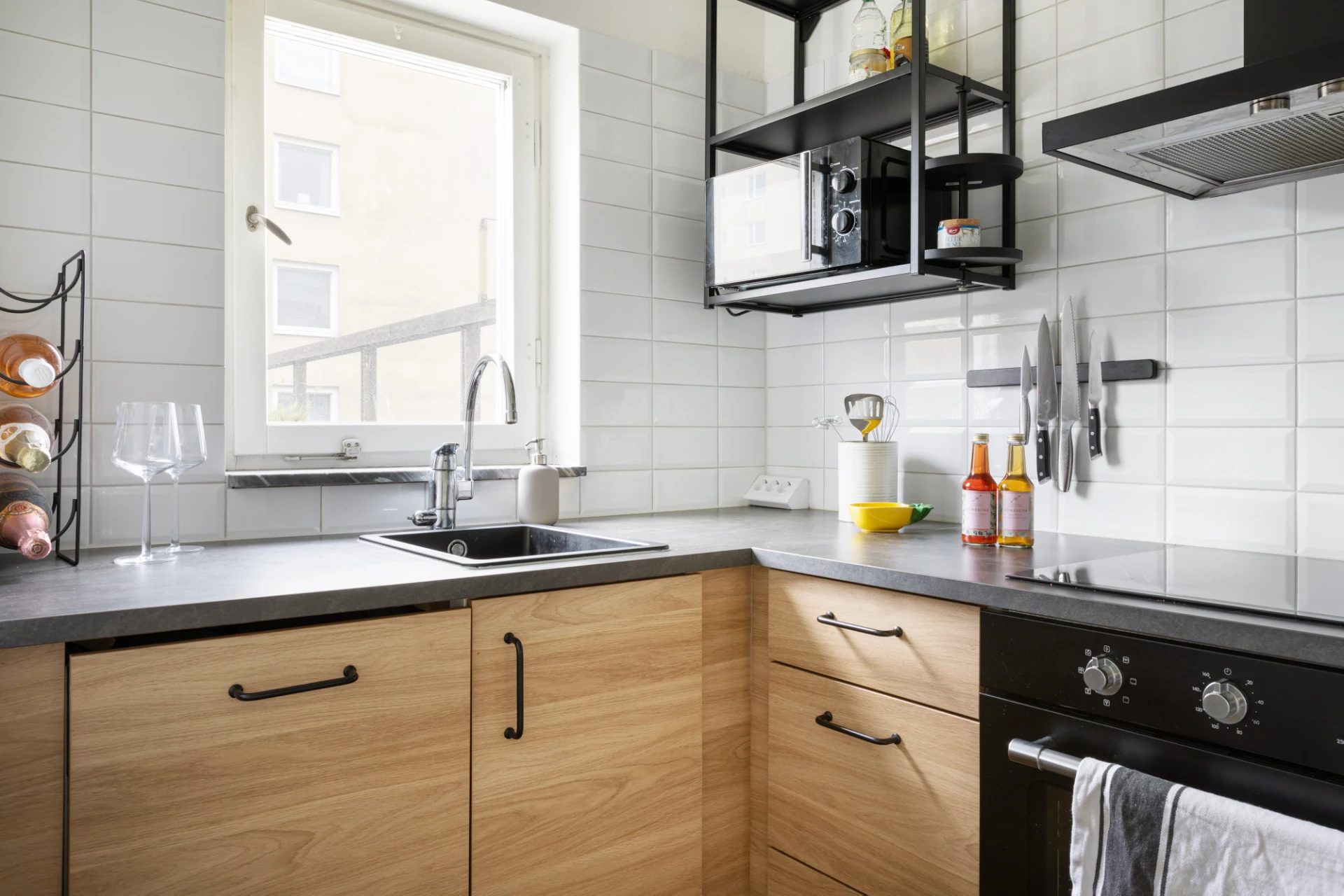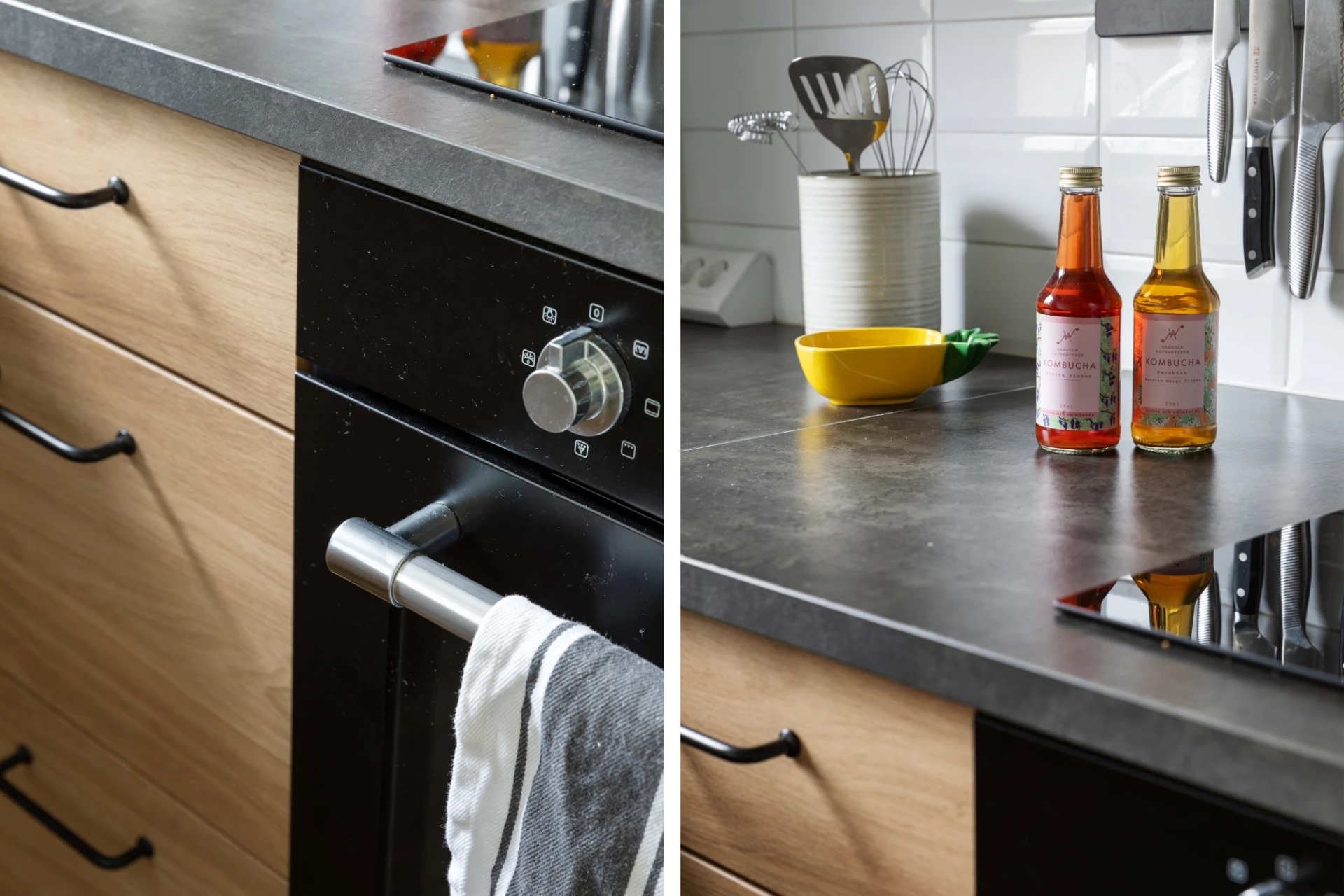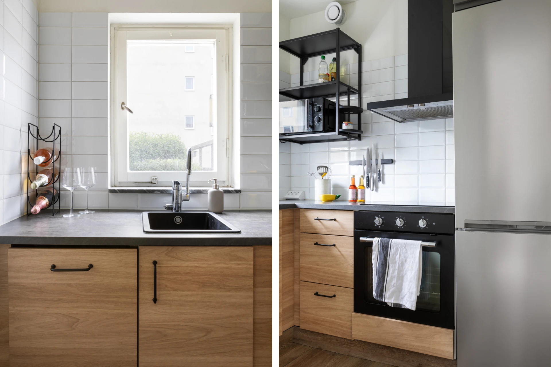 Kök med trägolv och vitmålade väggar. Köksinredning i trä och mörkt grå bänkskiva. Rostfri kyl/frys, induktionshäll, svart spisfläkt och en integrerad diskmaskin.