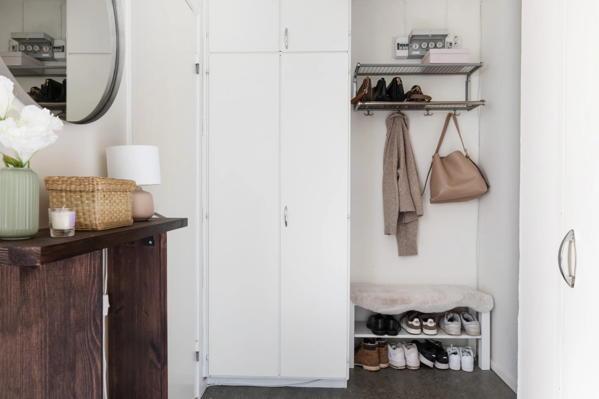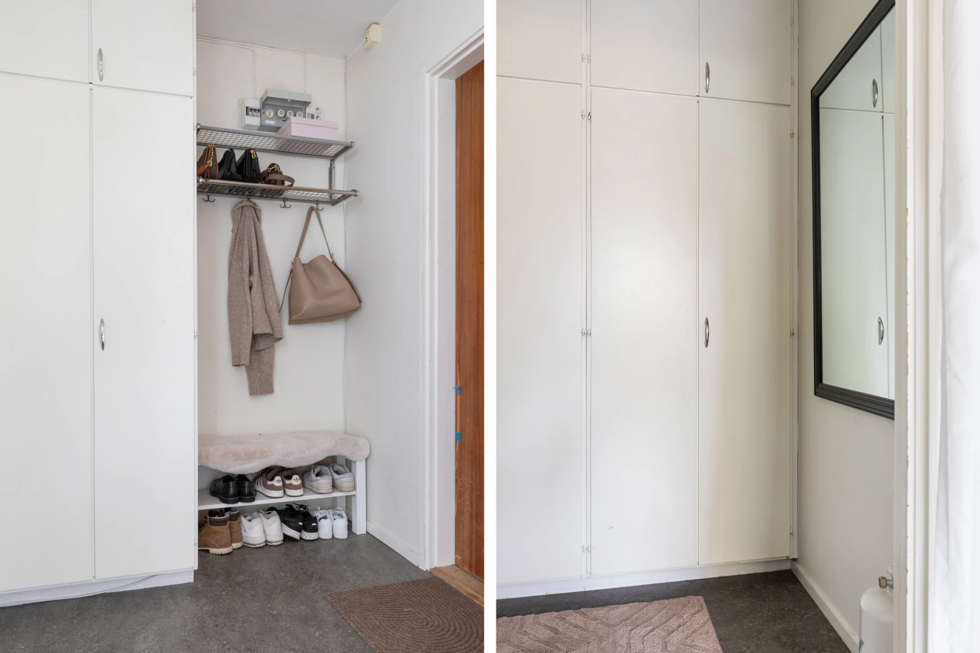 Hall med mörkt grå linoleummatta och vitmålade väggar. Avhängning för ytterkläder. Fem vitmålade garderober i original.