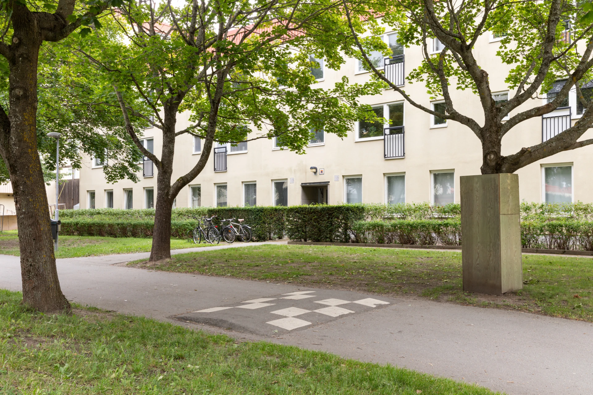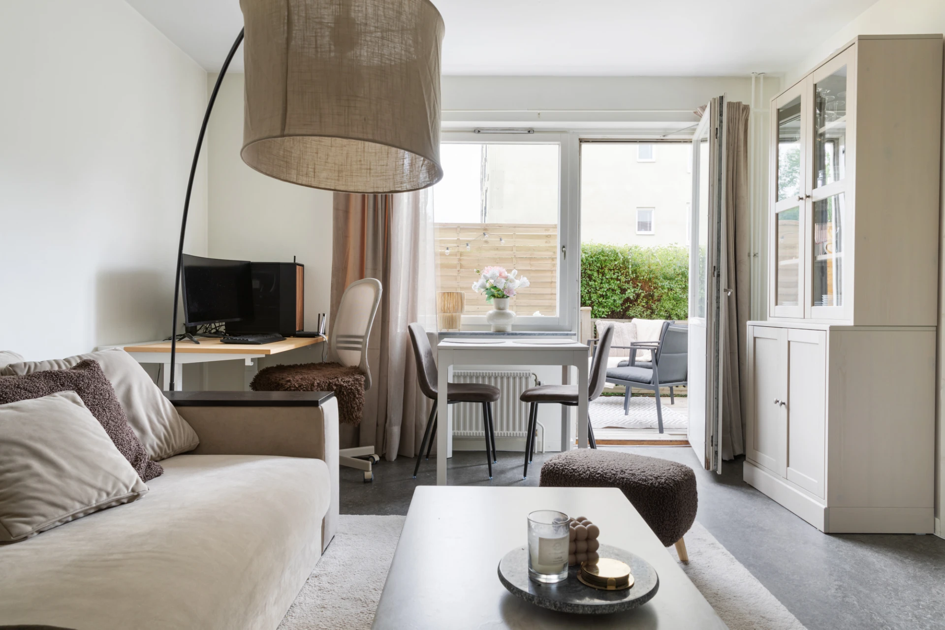 Välkommen till denna fina lägenhet med egen uteplats. Hallen är rymlig med gott om förvaringsmöjligheter i fem garderober. Rummet är lättmöblerat och har en praktisk sovalkov. I rummet får du plats med både soffgrupp och matbord. Ljuset flödar in via stort fönsterparti och utgången till den egna uteplatsen. Köket är nyrenoverat med induktionshäll och integrerad diskmaskin. Badrummet renoverades i samband med föreningens stambyte och är smakfullt inrett i grått och vitt.