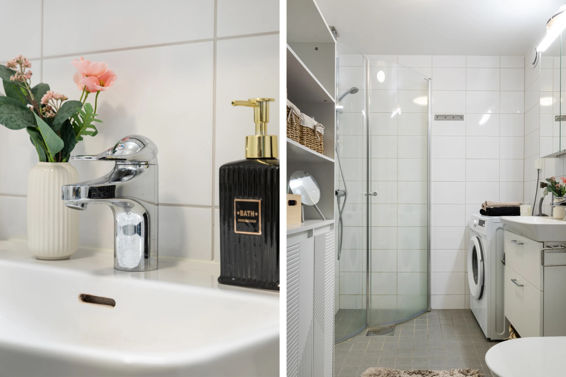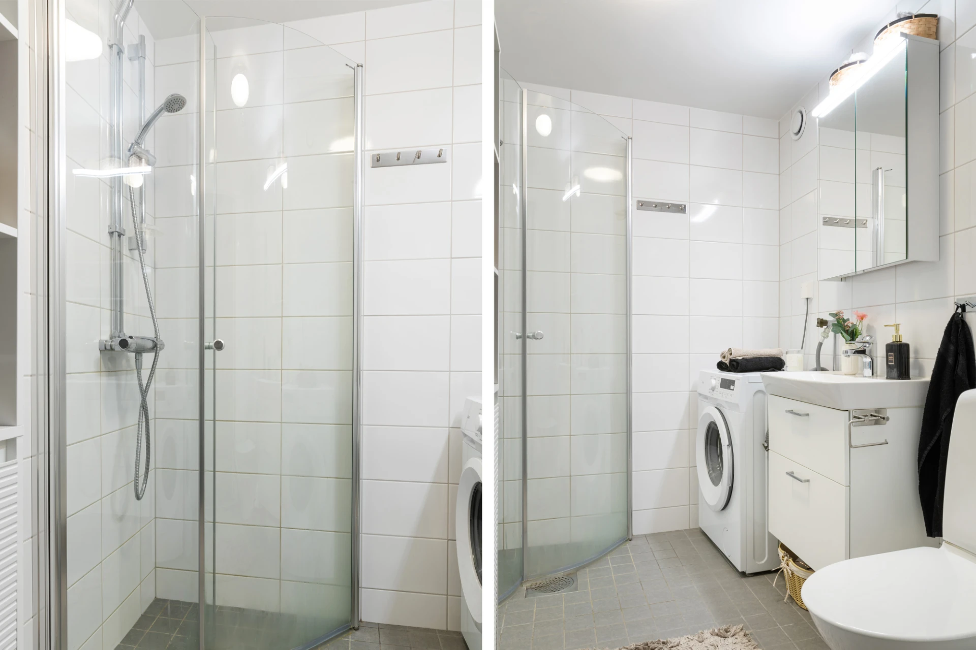 Badrum med grå klinker och vita kaklade väggar. Handfat med vit kommod, dusch med glasdörrar och wc.