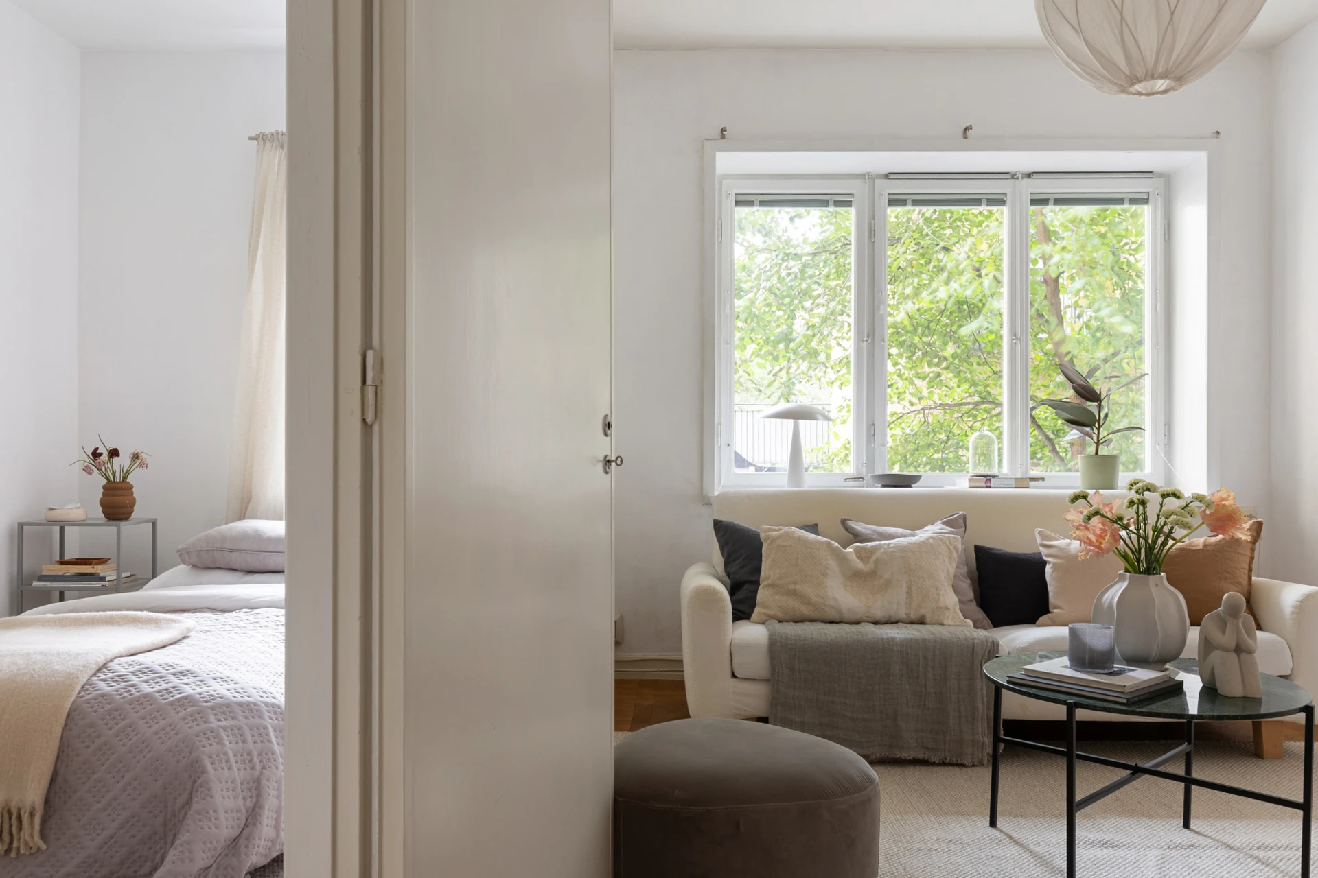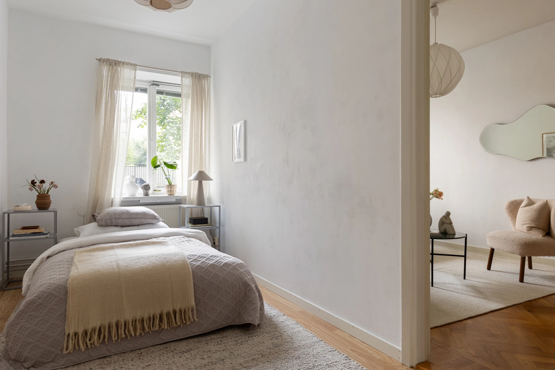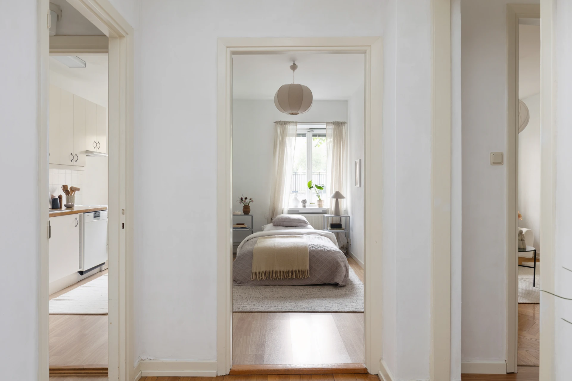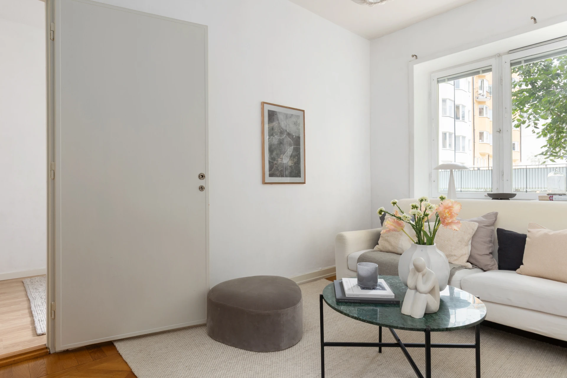 Fiskbensparkett och målade väggar. Fönster mot innergård