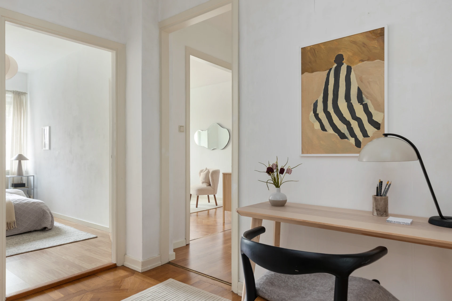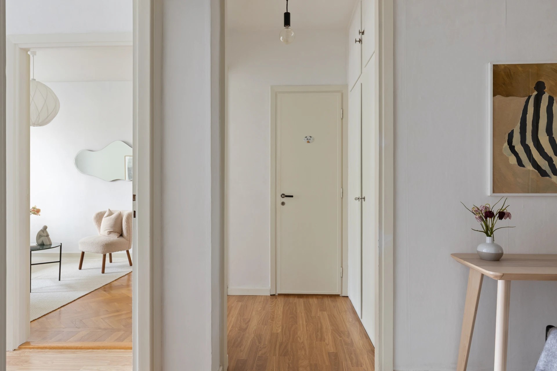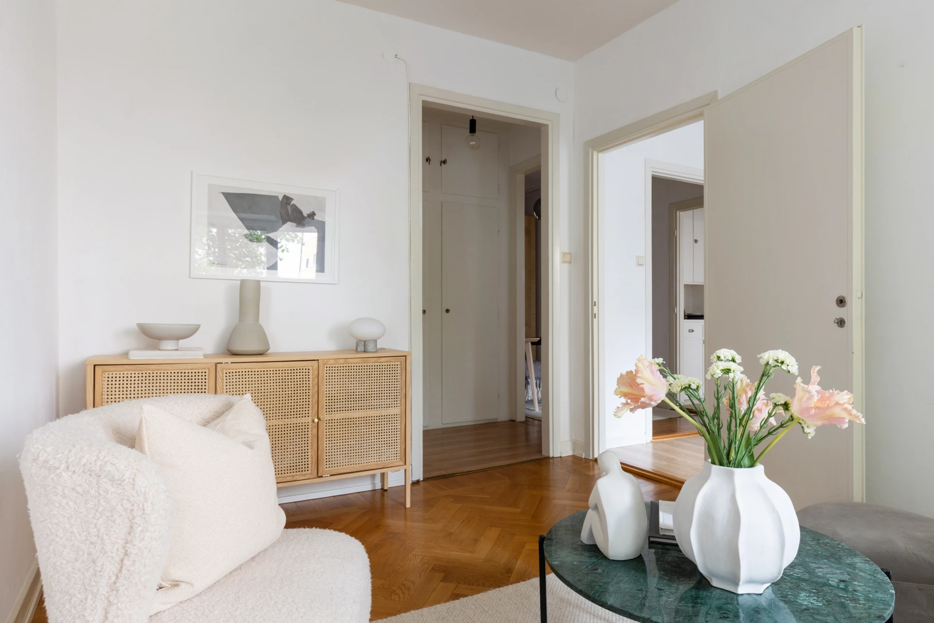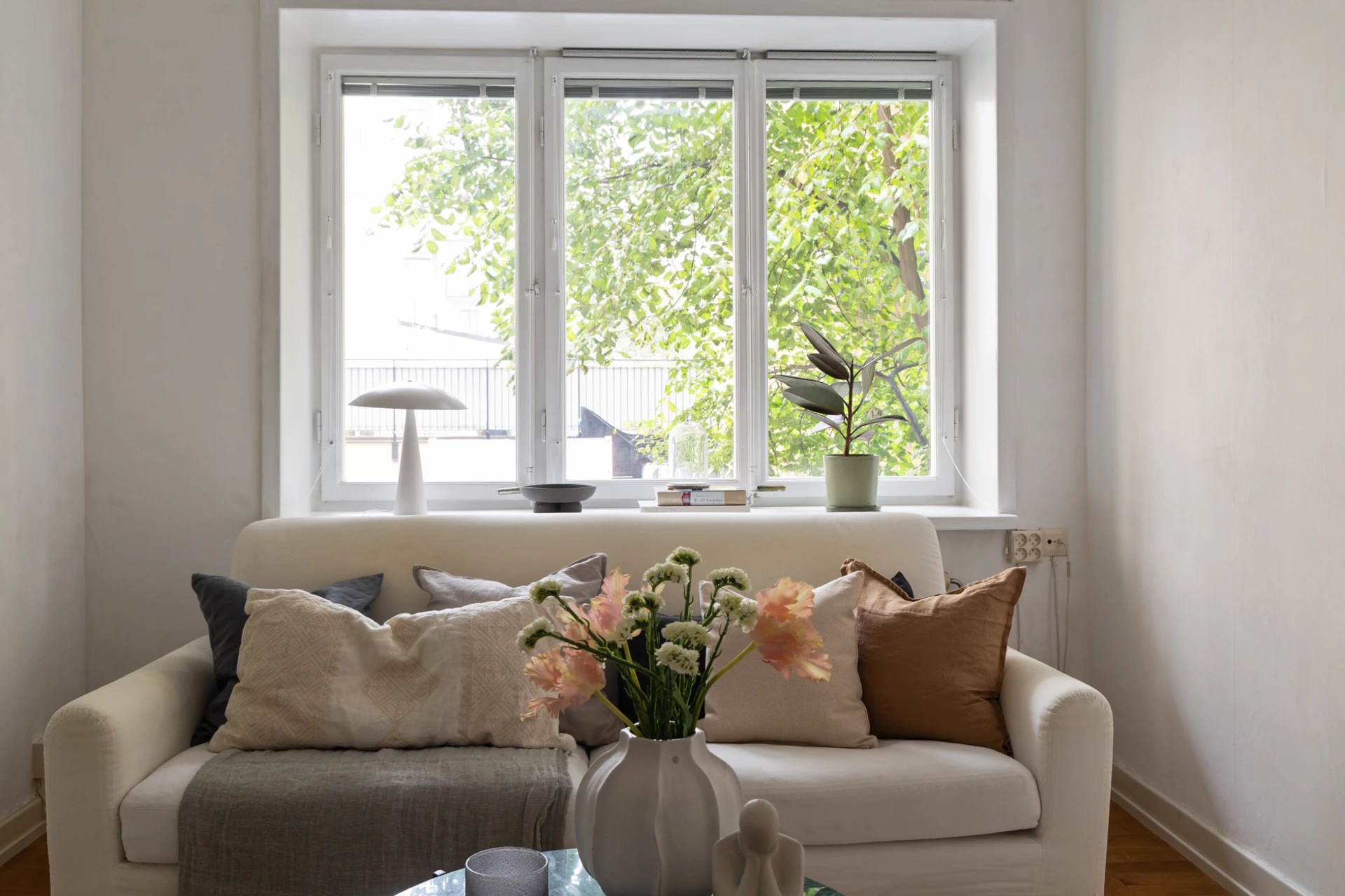 Fiskbensparkett och målade väggar. Fönster mot innergård