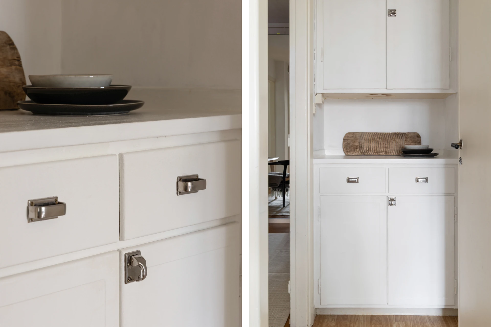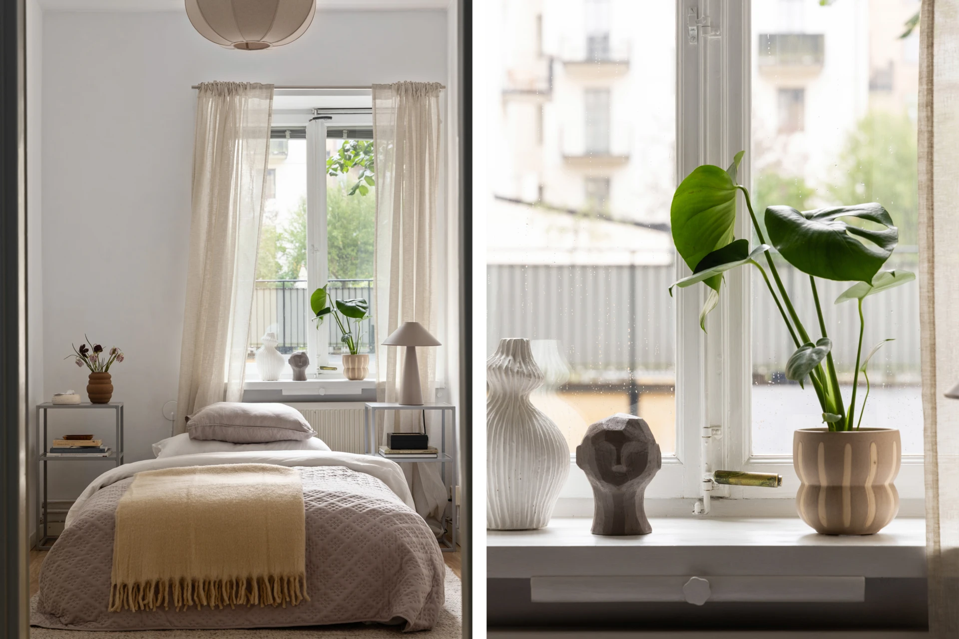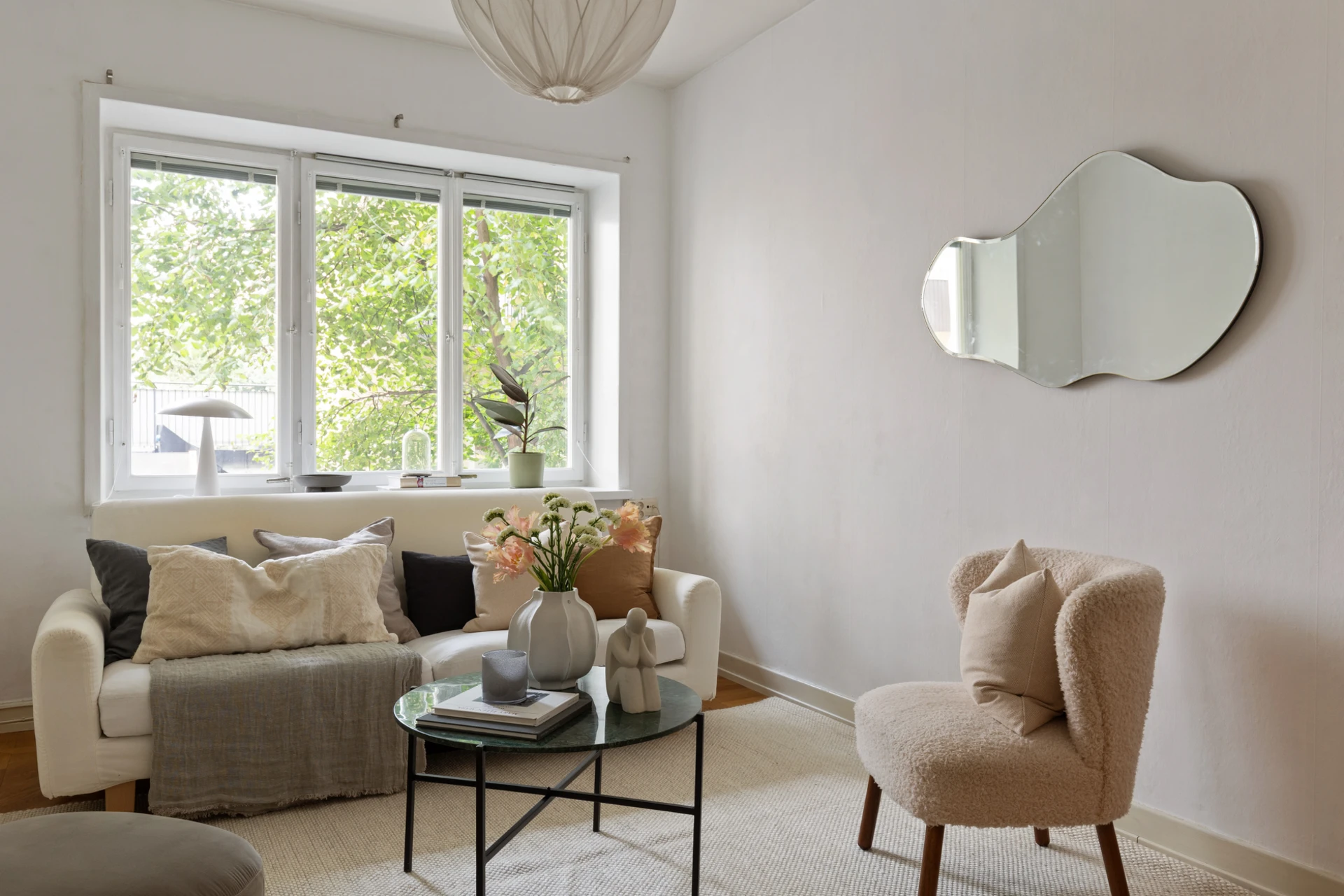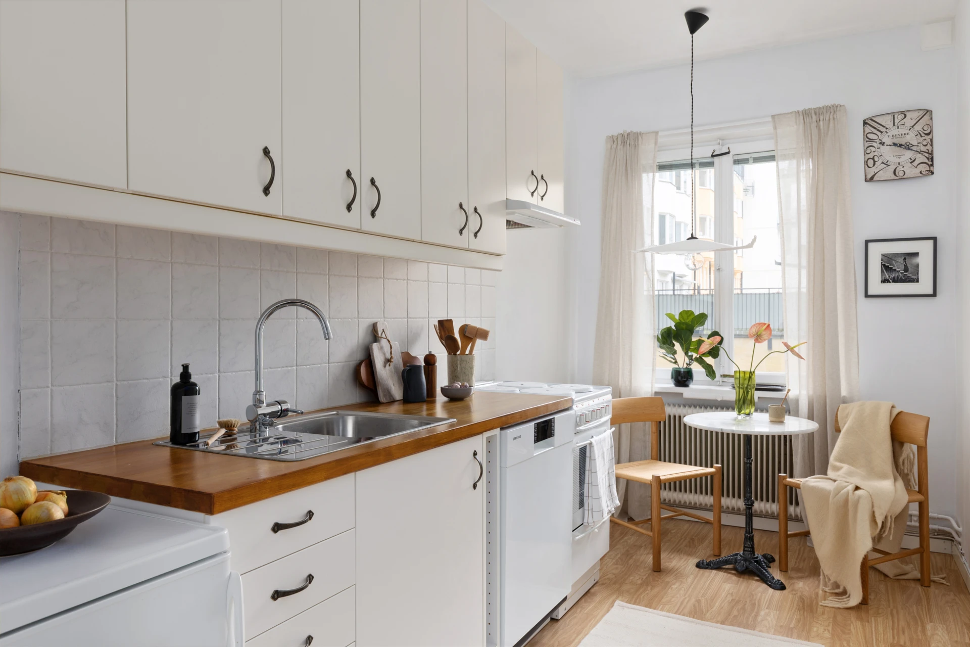 Fiskbensparkett och målade väggar. Fönster mot innergård