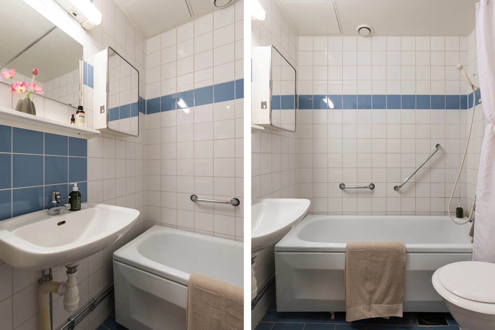 Klinkergolv och kaklade väggar. Badrummet är inrett med WC, handfat, badkar, handukstork.