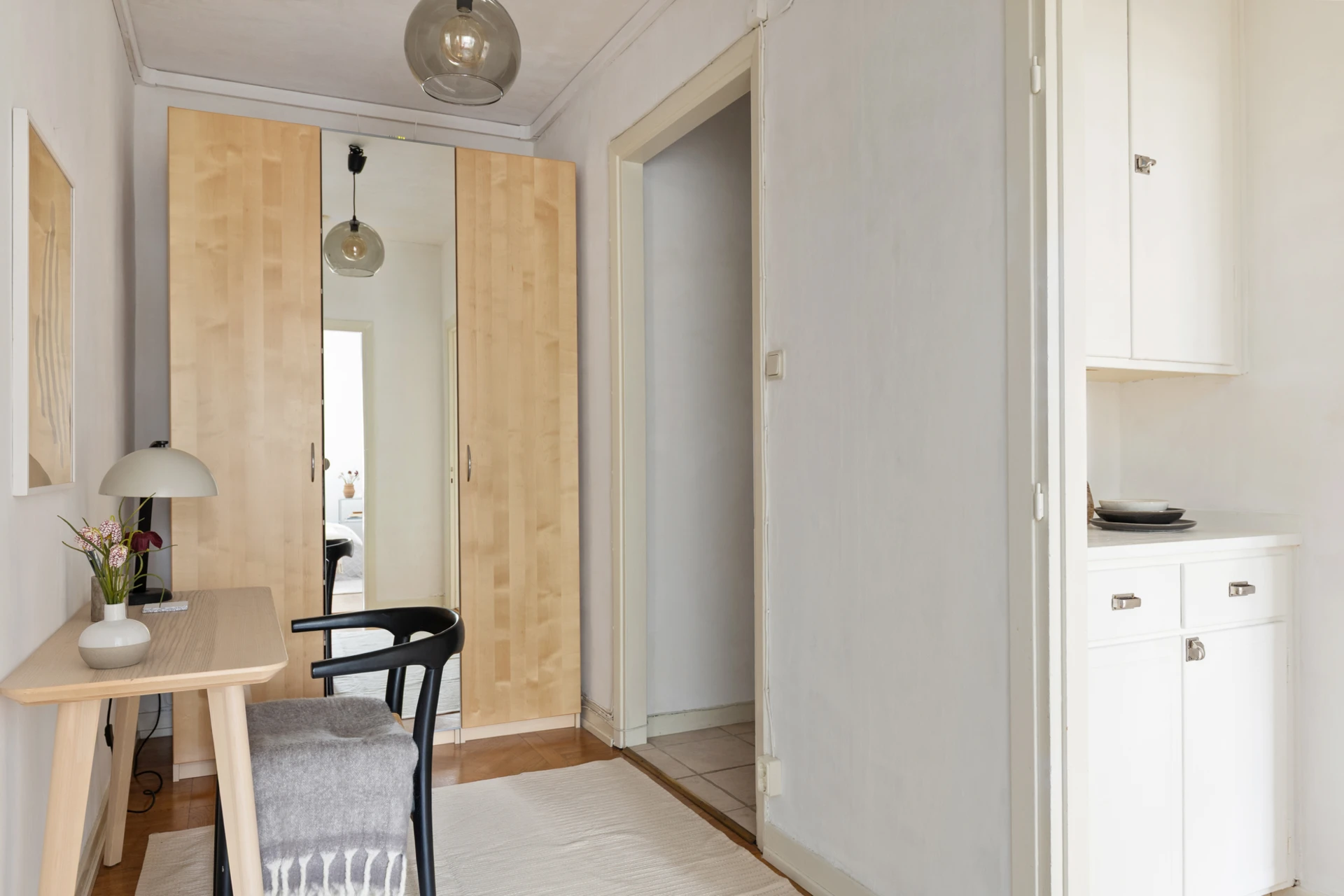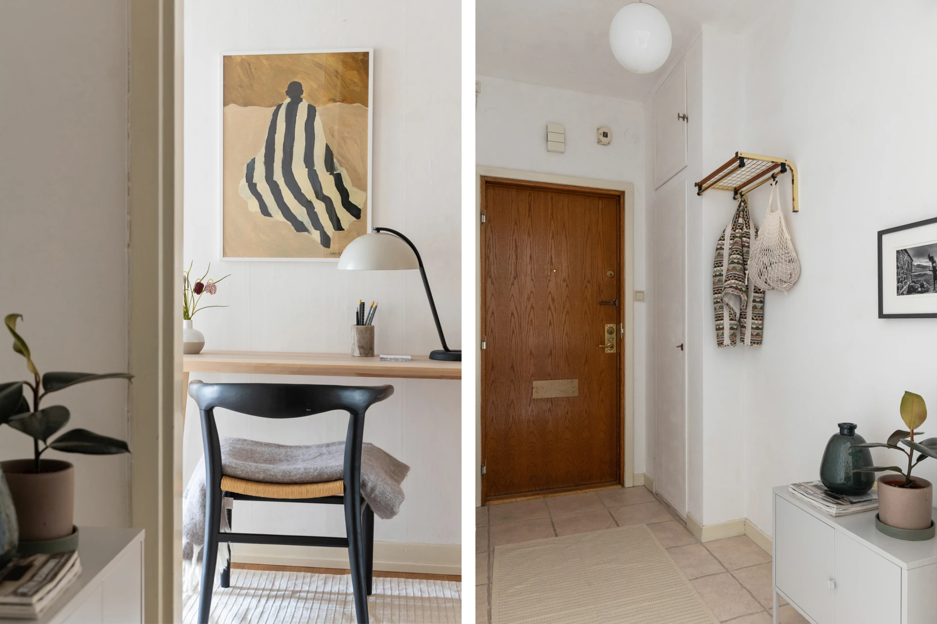 Klinkergolv och målade väggar. Plats för avhängning och förvaring i en garderob.