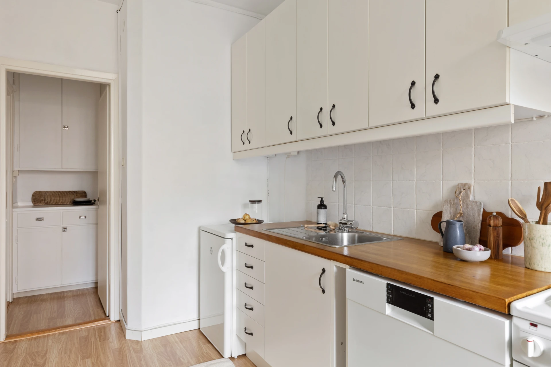 Laminatgolv och målade väggar. Köket är urustat med spis med ugn, kolfilterfläkt, diskmaskin samt kyl med frysfack. Fönster mot innergård.