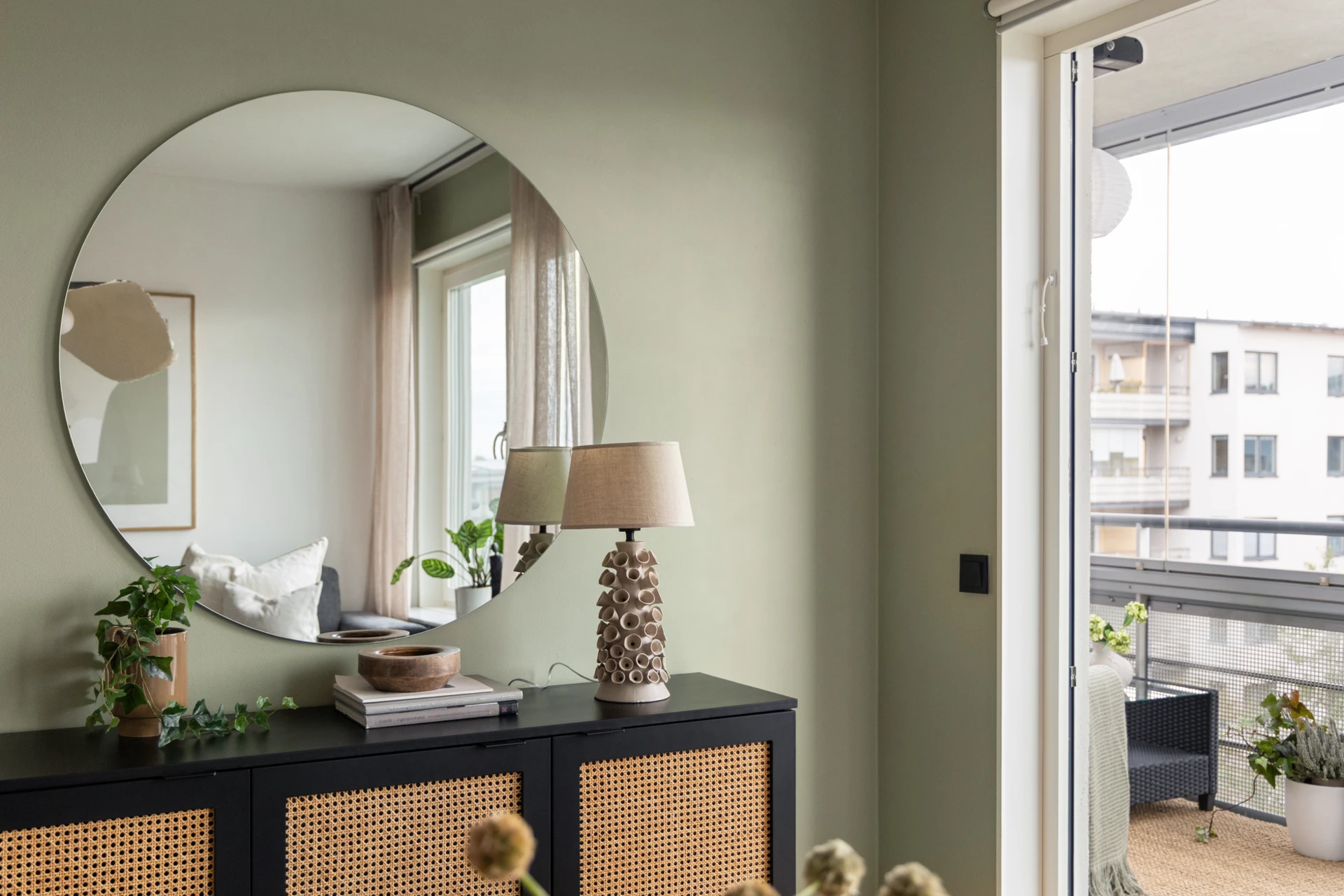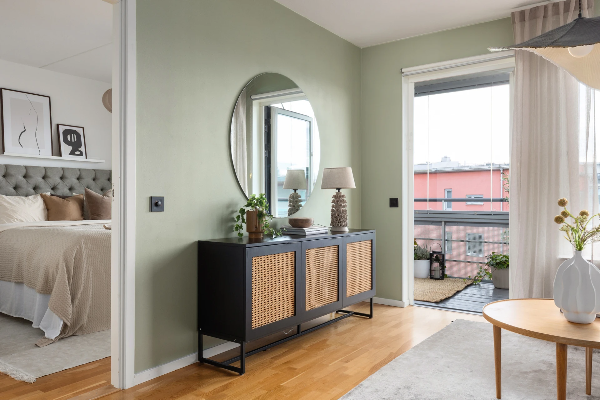 Parkettgolv och ljusa väggar i vitt och grönt. Stort fönsterparti och utgång till balkongen.