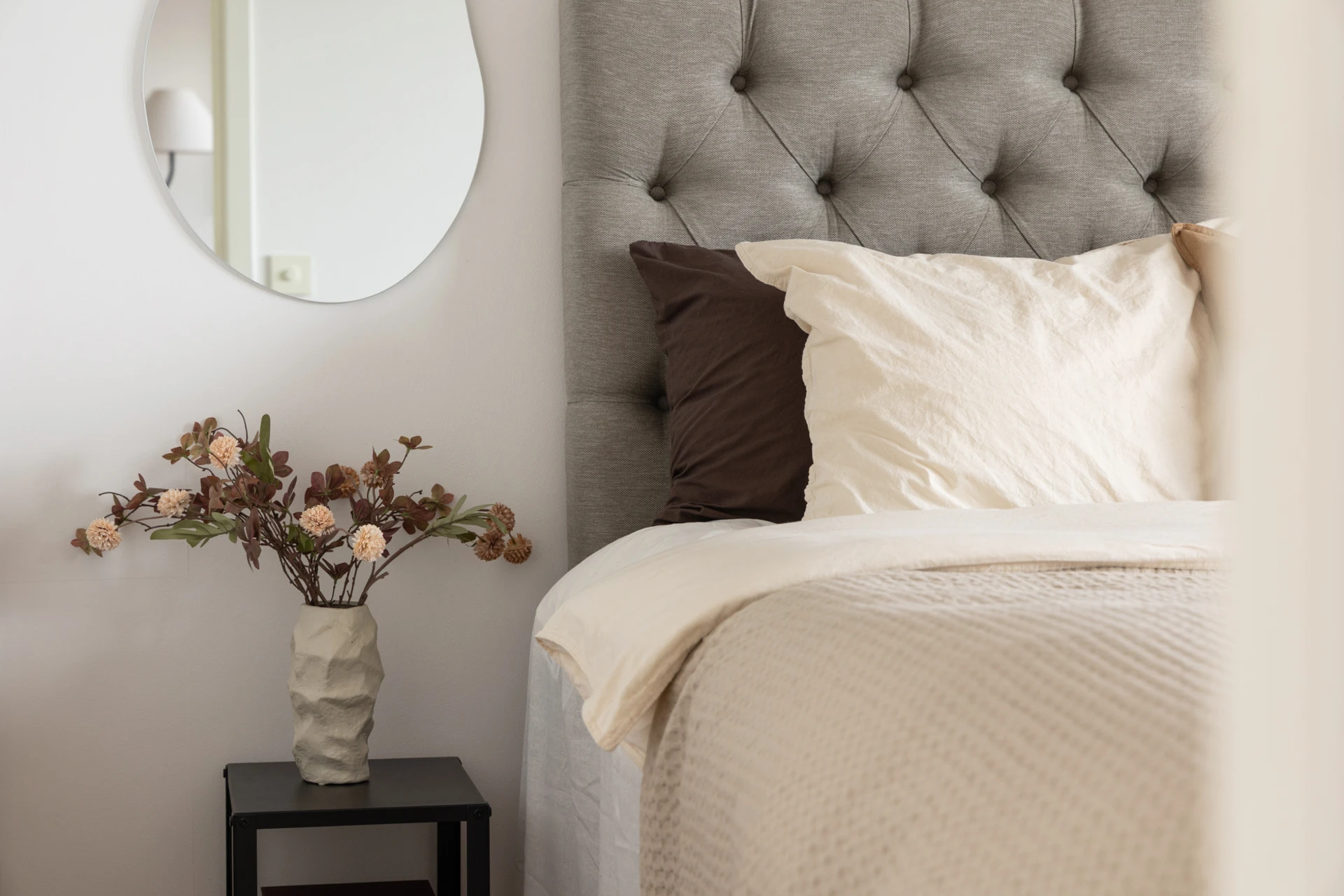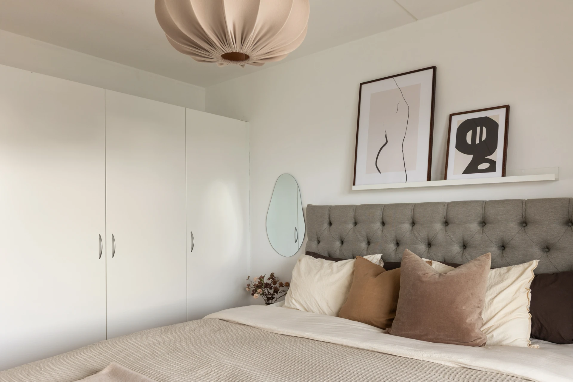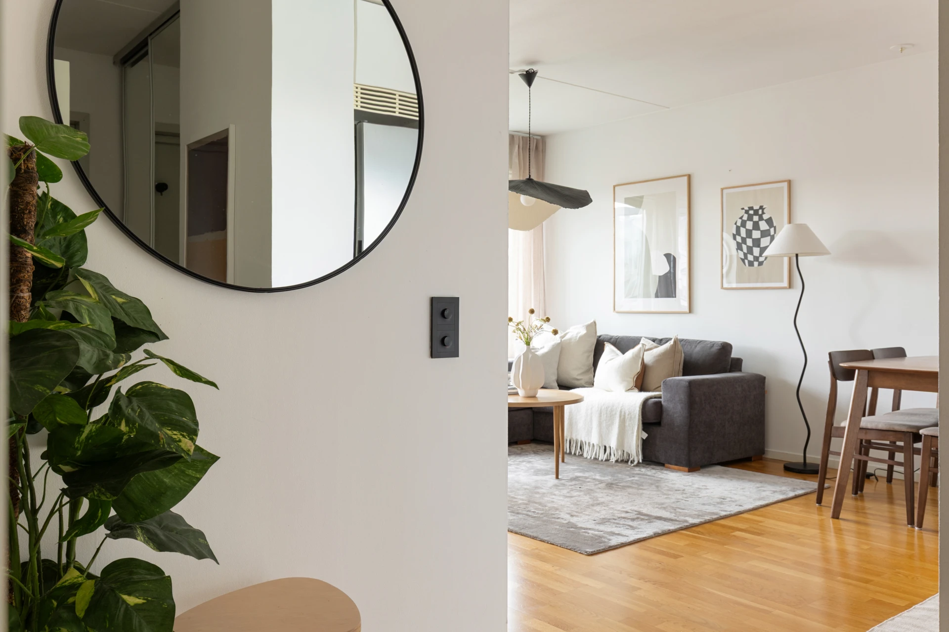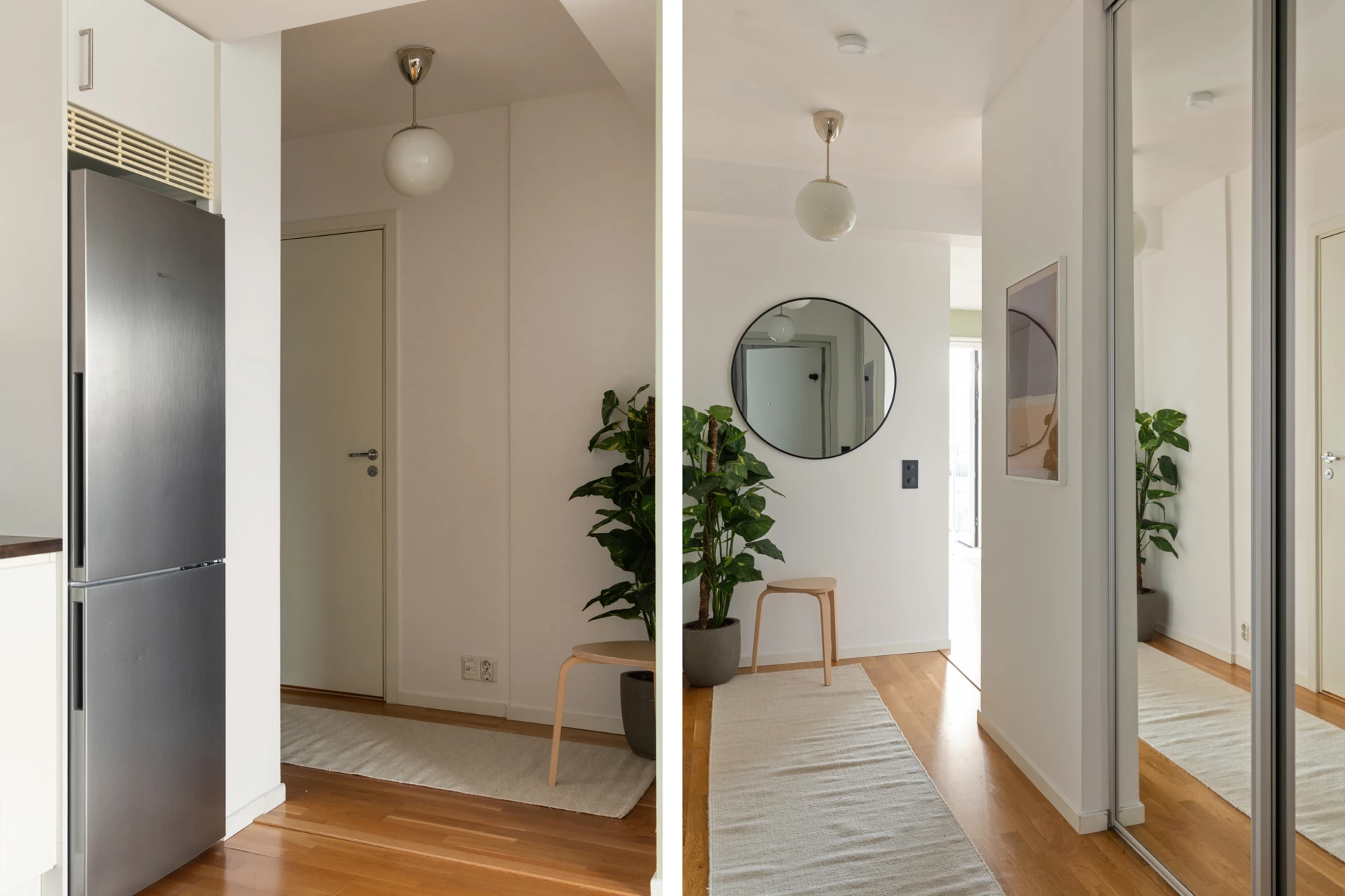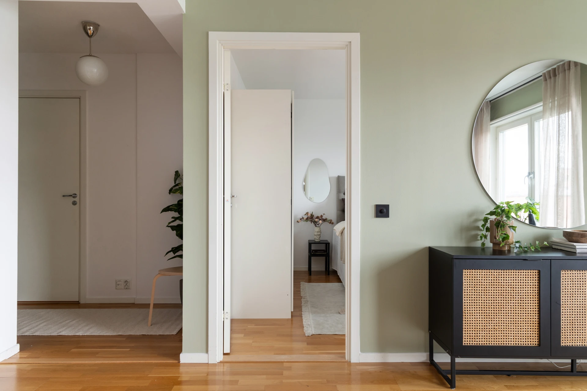 Parkettgolv och ljusa väggar. Garderob med speglade skjutpartier.