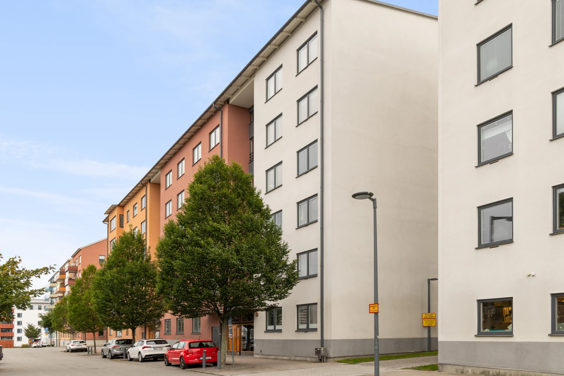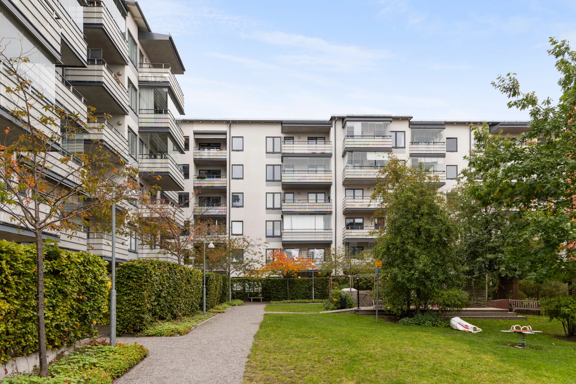Åt andra hållet ligger tunnelbana, bussar och de stora vägarna. Här åker man enkelt in till stan, eller ut från stan om man vill, oavsett om man har egen bil, cyklar eller åker kommunalt. Om man vill, så kan man gå över Nynäsvägen till Globen Shopping. Det är helt enkelt nära till allt.