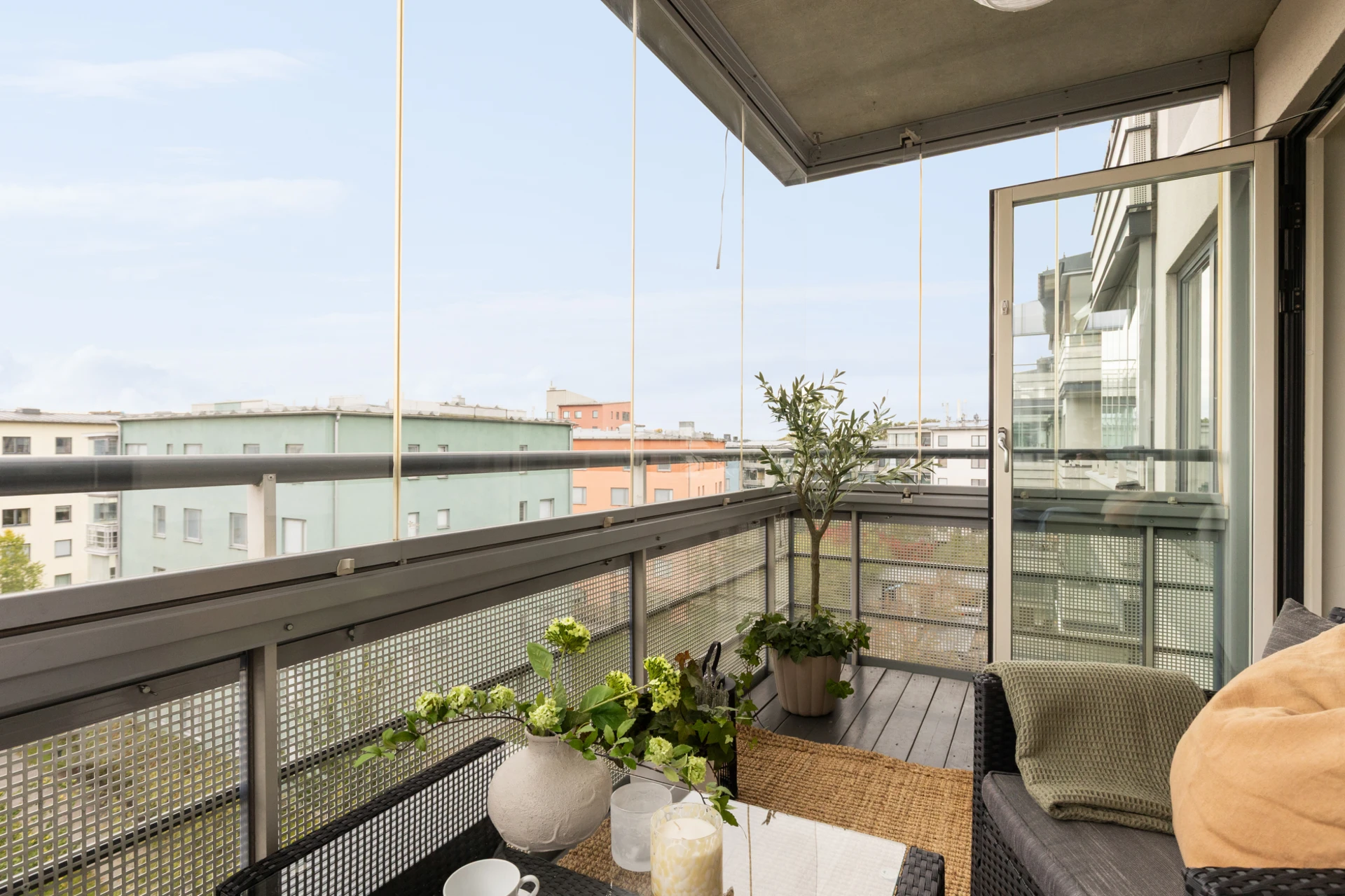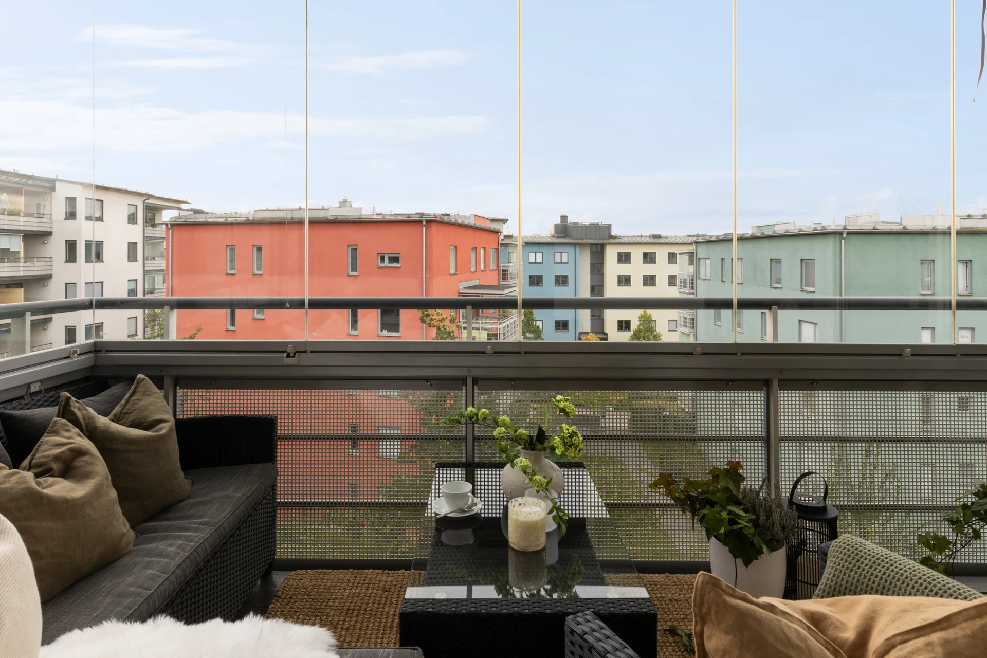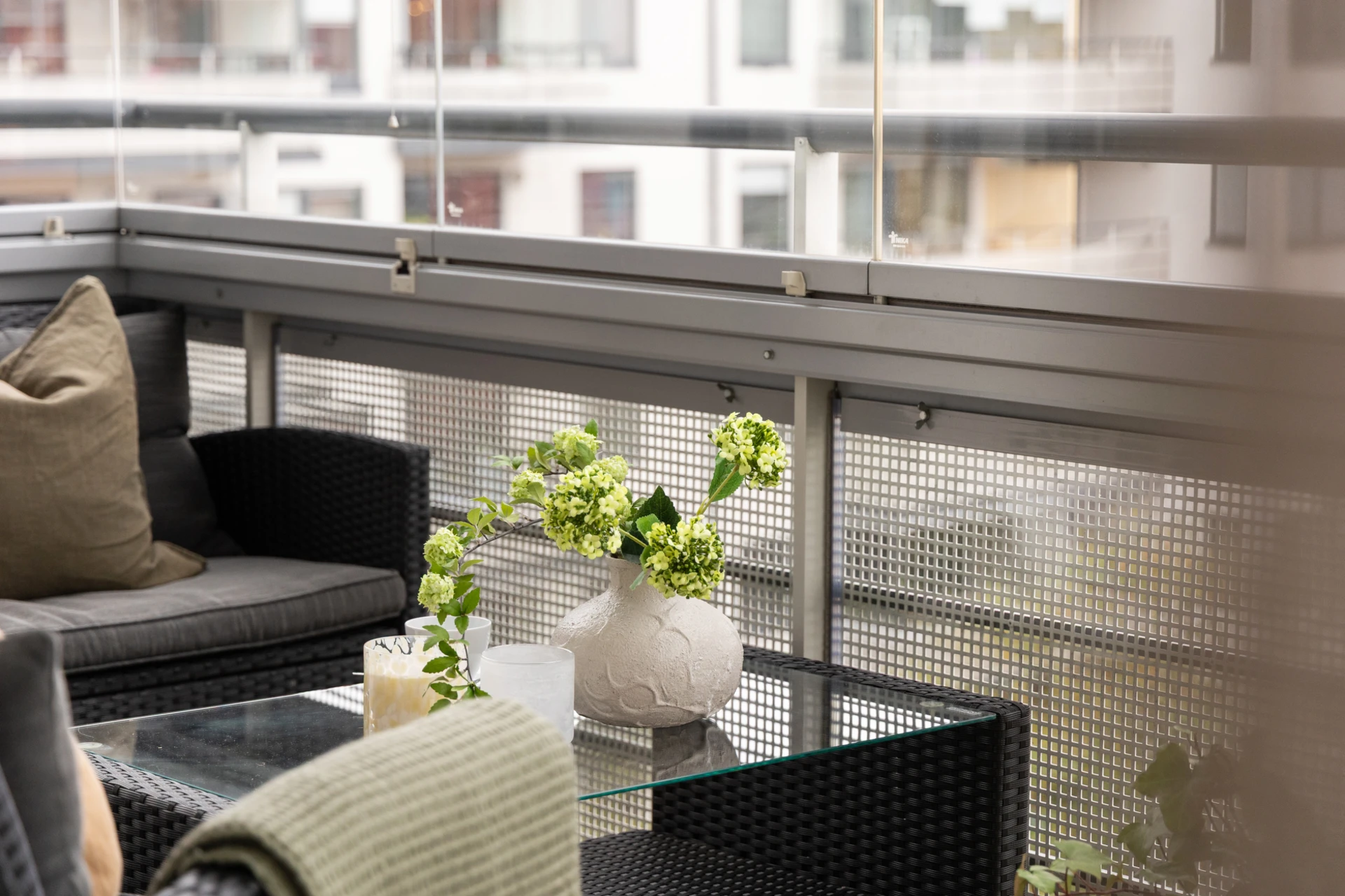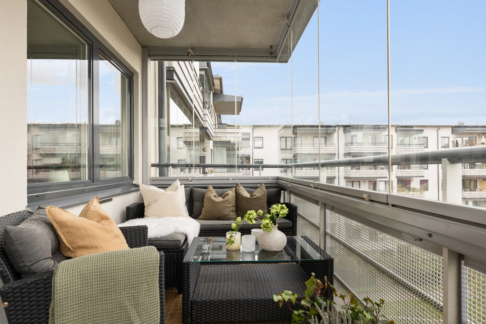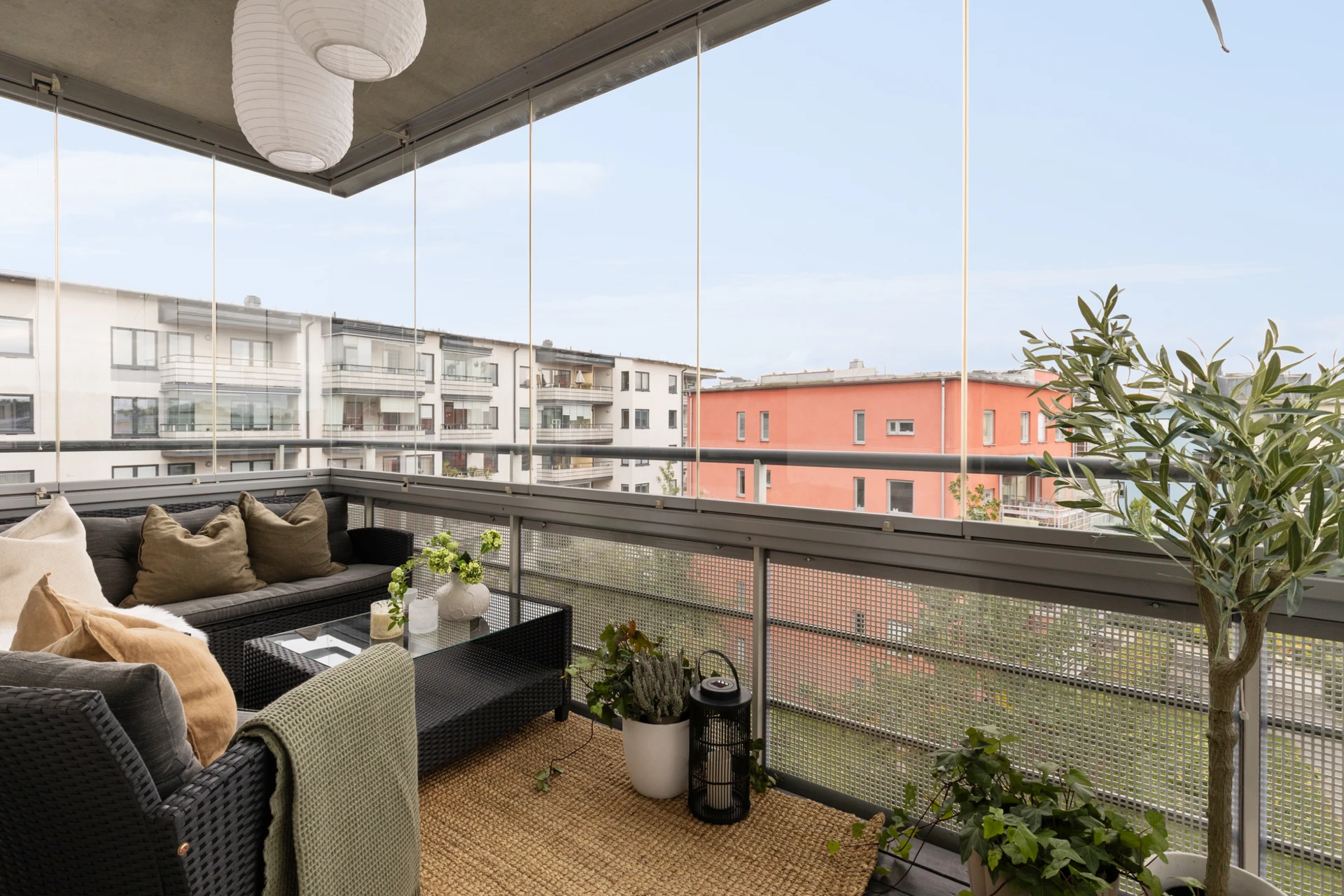 Balkong med trall och gott om plats för utemöbler samt egna planteringar i ett soligt läge.