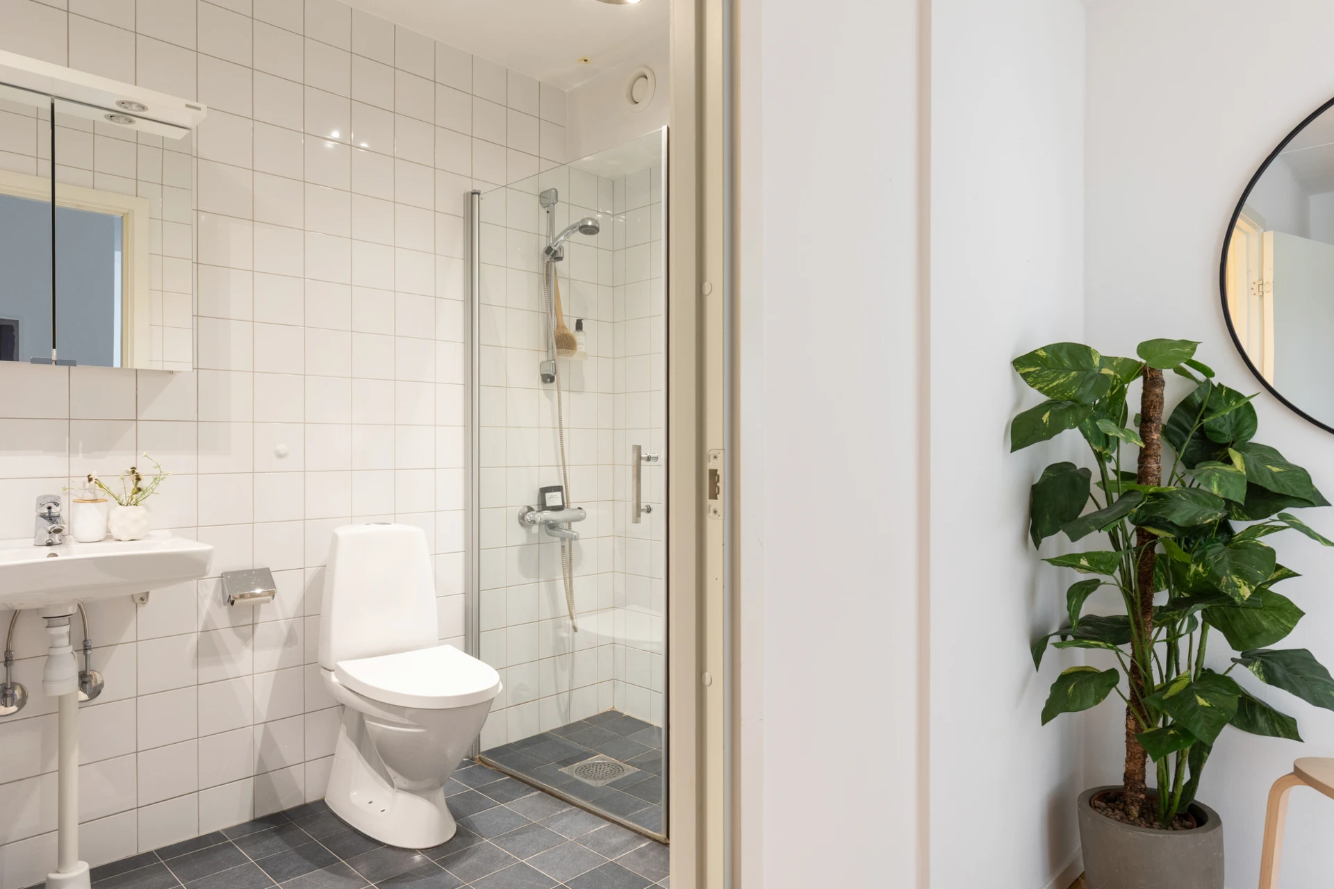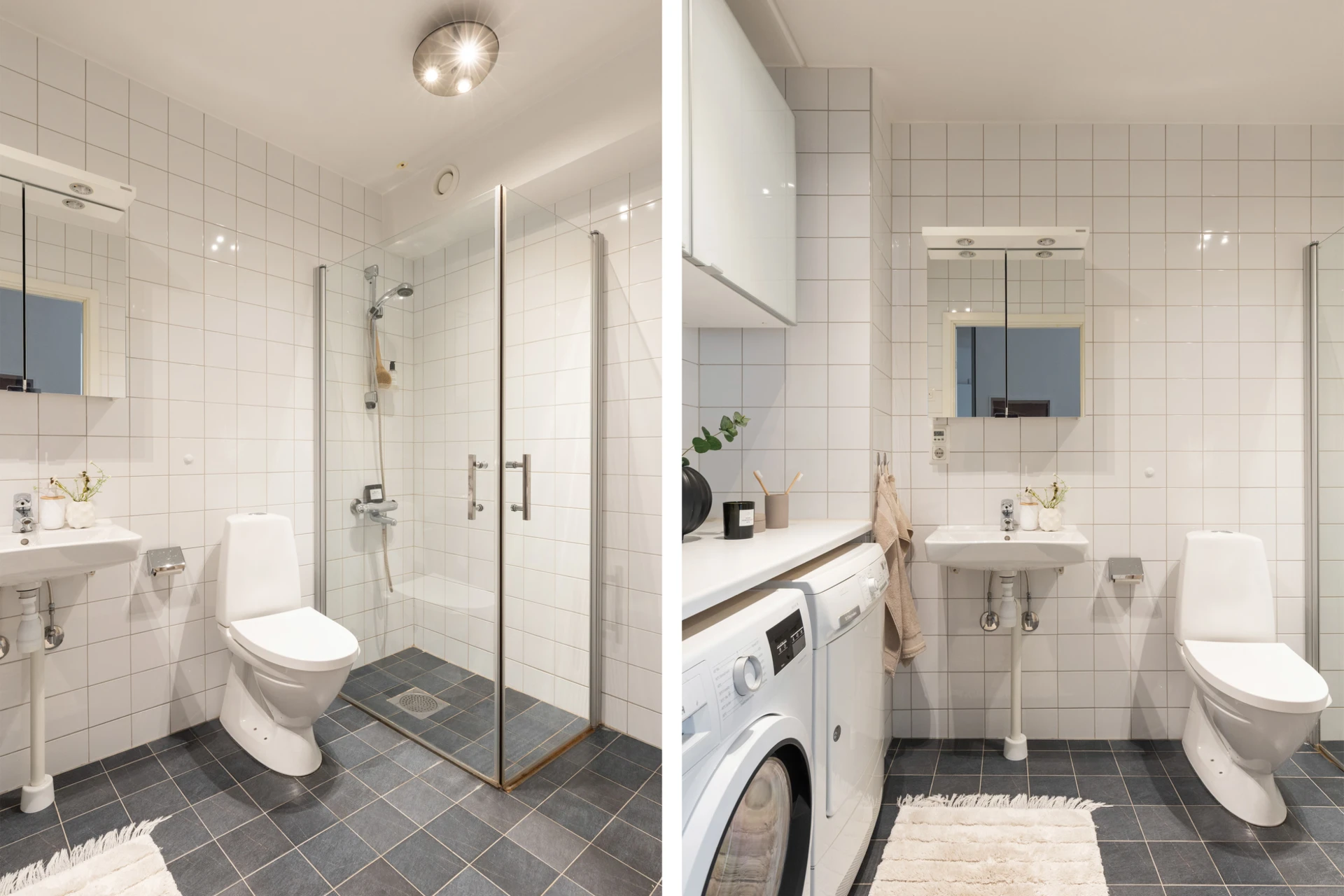 Klinkergolv och kaklade vita väggar. Handfat och spegelskåp med belysning. WC och dusch med glasväggar. Tvättmaskin, torktumlare och arbetsbänk med överskåp.