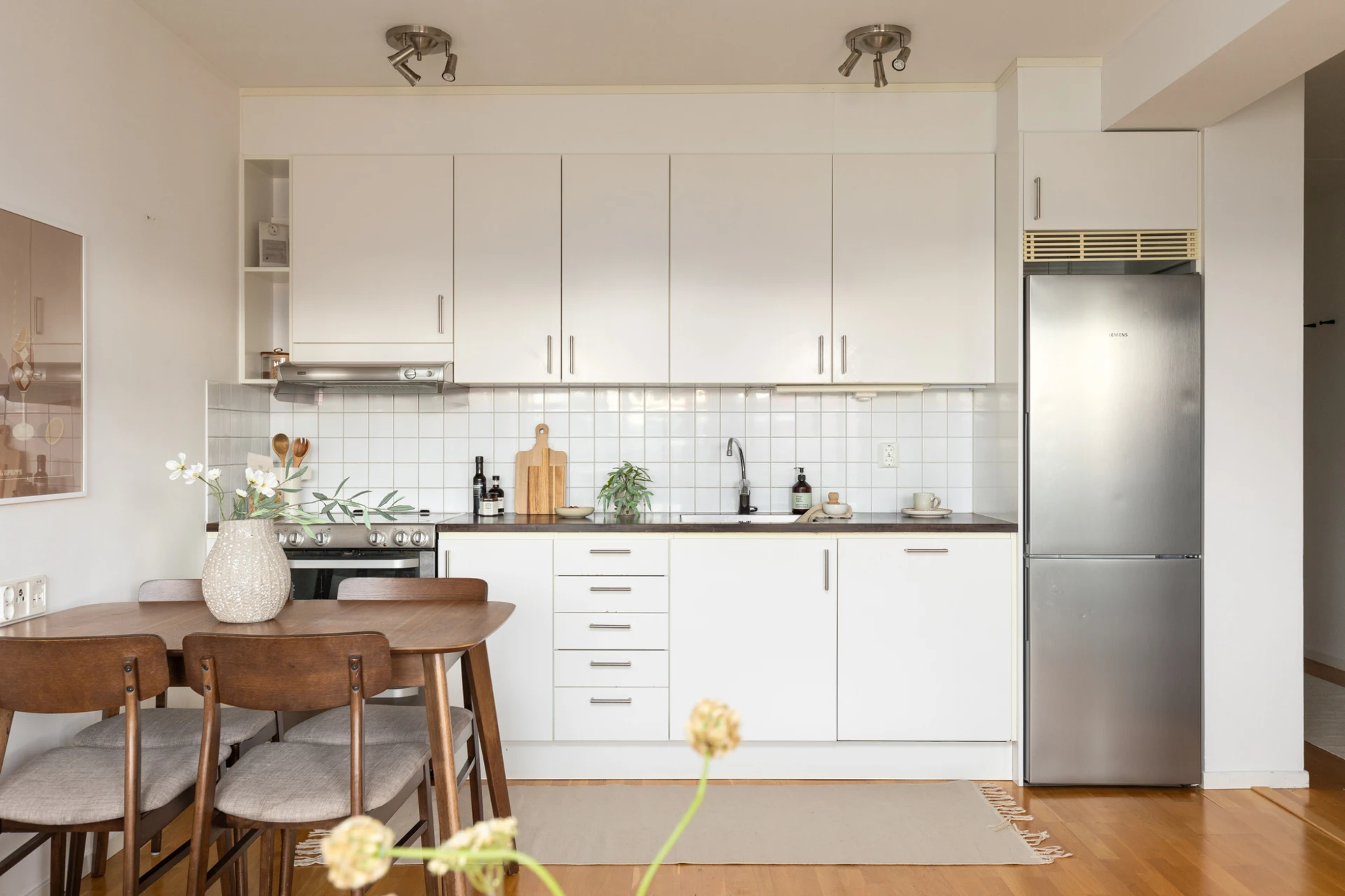 Parkettgolv och ljusa väggar. Vita skåpsluckor och vitt kakel ovan arbetsytor. Kyl/frys, integrerad diskmaskin, spis med häll och fläkt.