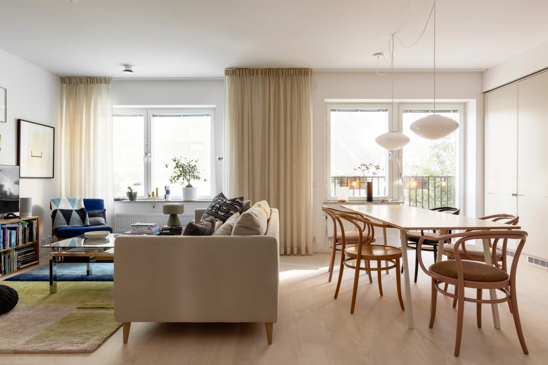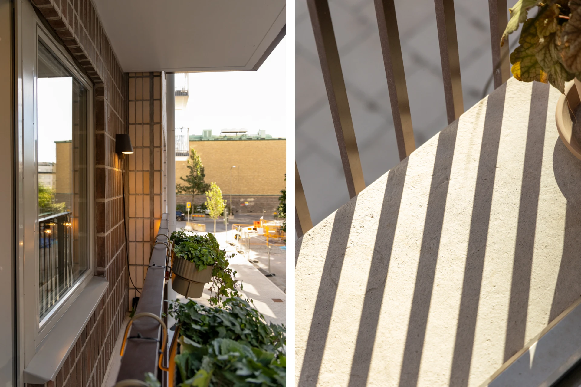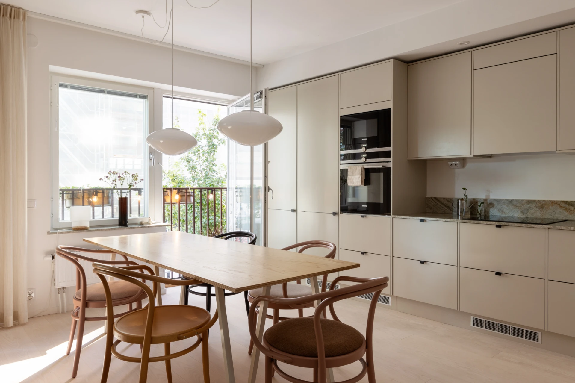 Kök med öppen planlösning mot vardagsrum. Köksbänk samt fönsterbänkar i Kvarsit Madre Perola. Skåpsluckor i sober färgsättning från Marbodal Arkitekt plus Sand. Diskho från Blanco Subline 160 U Silgranit InFino och vitvaror genomgående från Siemens. Fransk balkong som ger vackert ljusinsläpp. Plats för matgrupp om ca 6 personer.