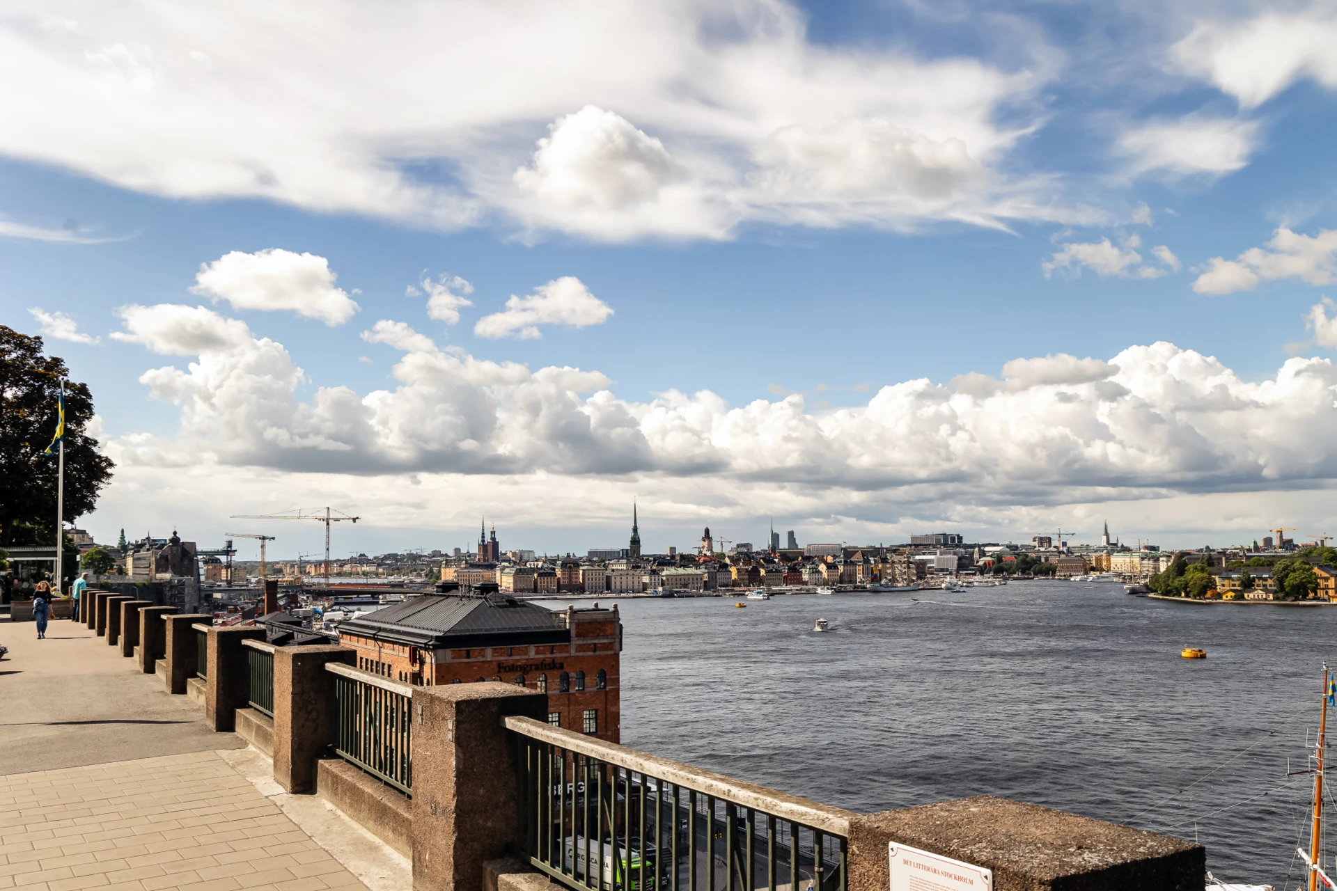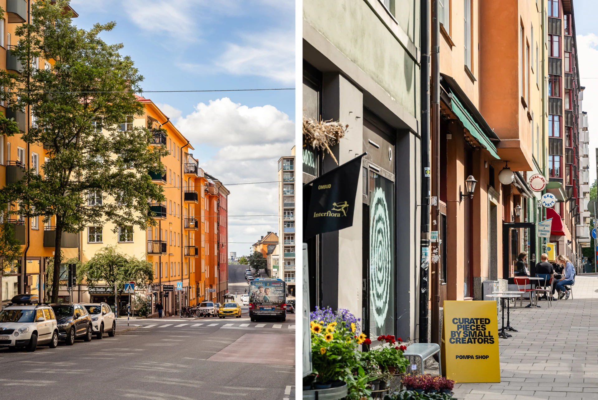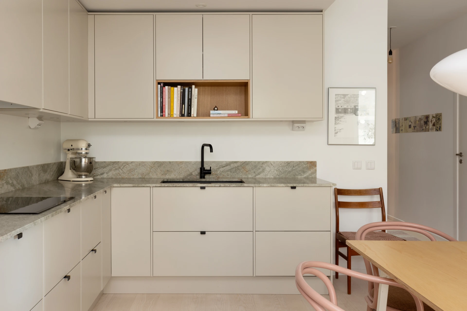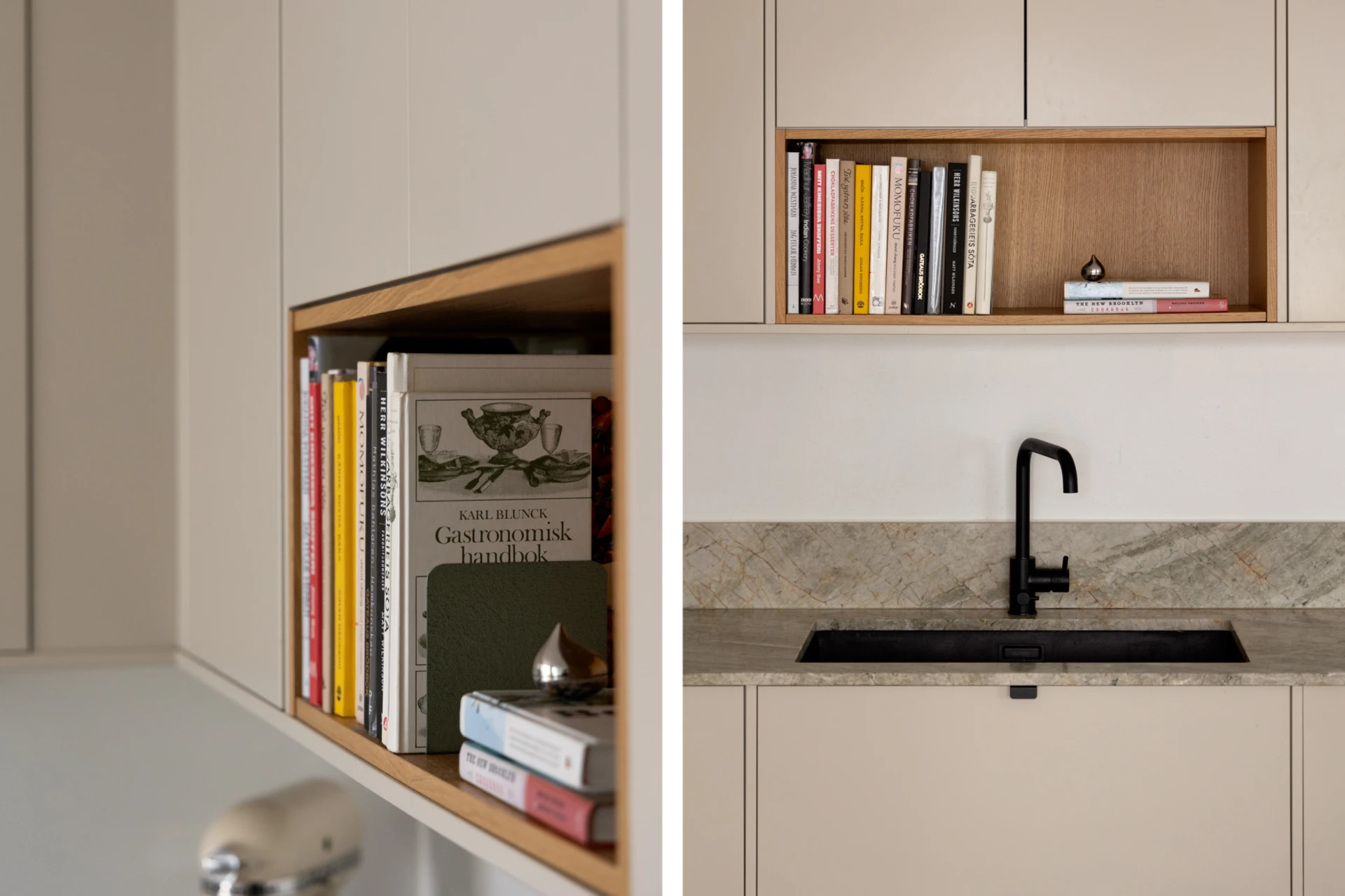 Kök med öppen planlösning mot vardagsrum. Köksbänk samt fönsterbänkar i Kvarsit Madre Perola. Skåpsluckor i sober färgsättning från Marbodal Arkitekt plus Sand. Diskho från Blanco Subline 160 U Silgranit InFino och vitvaror genomgående från Siemens. Fransk balkong som ger vackert ljusinsläpp. Plats för matgrupp om ca 6 personer.