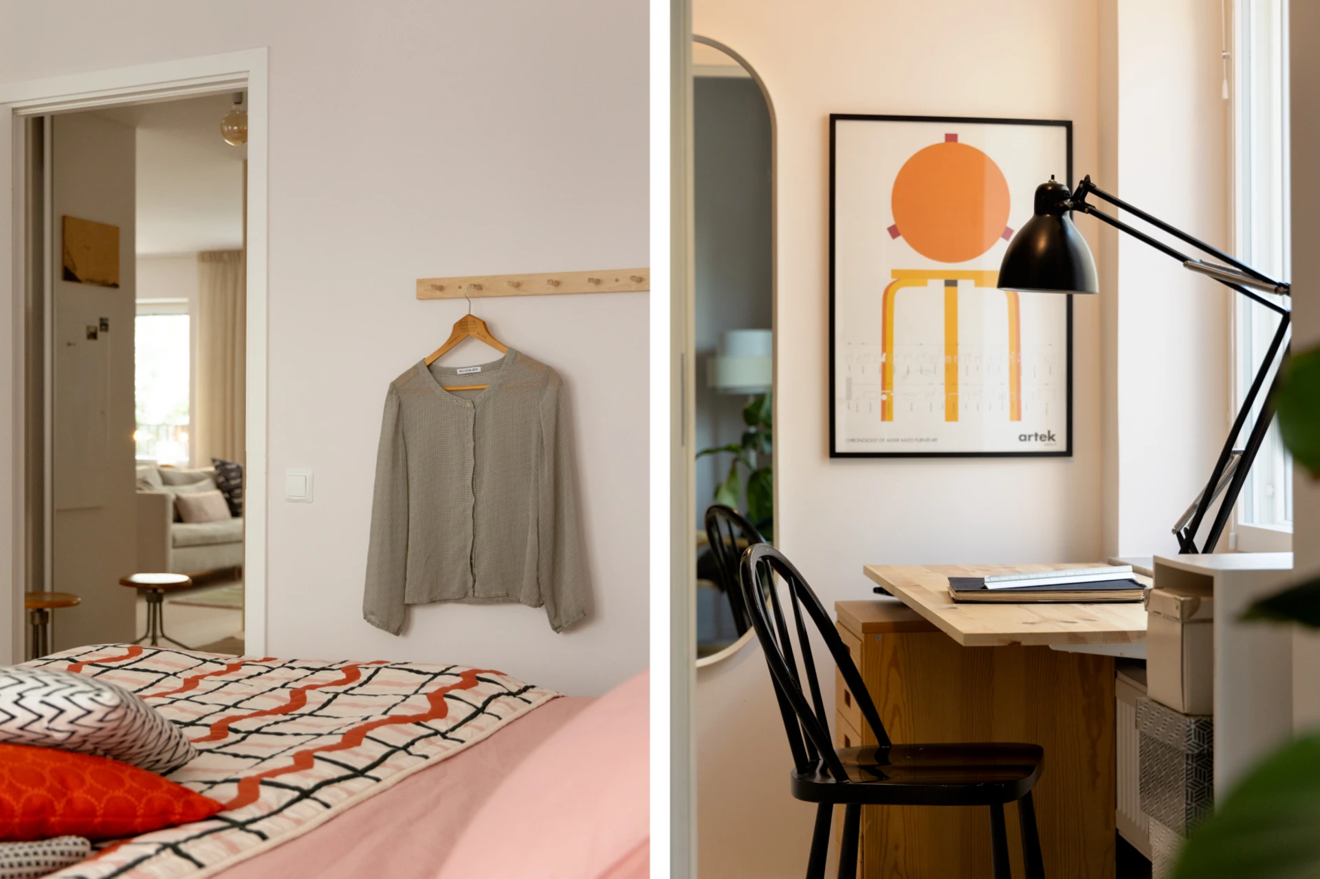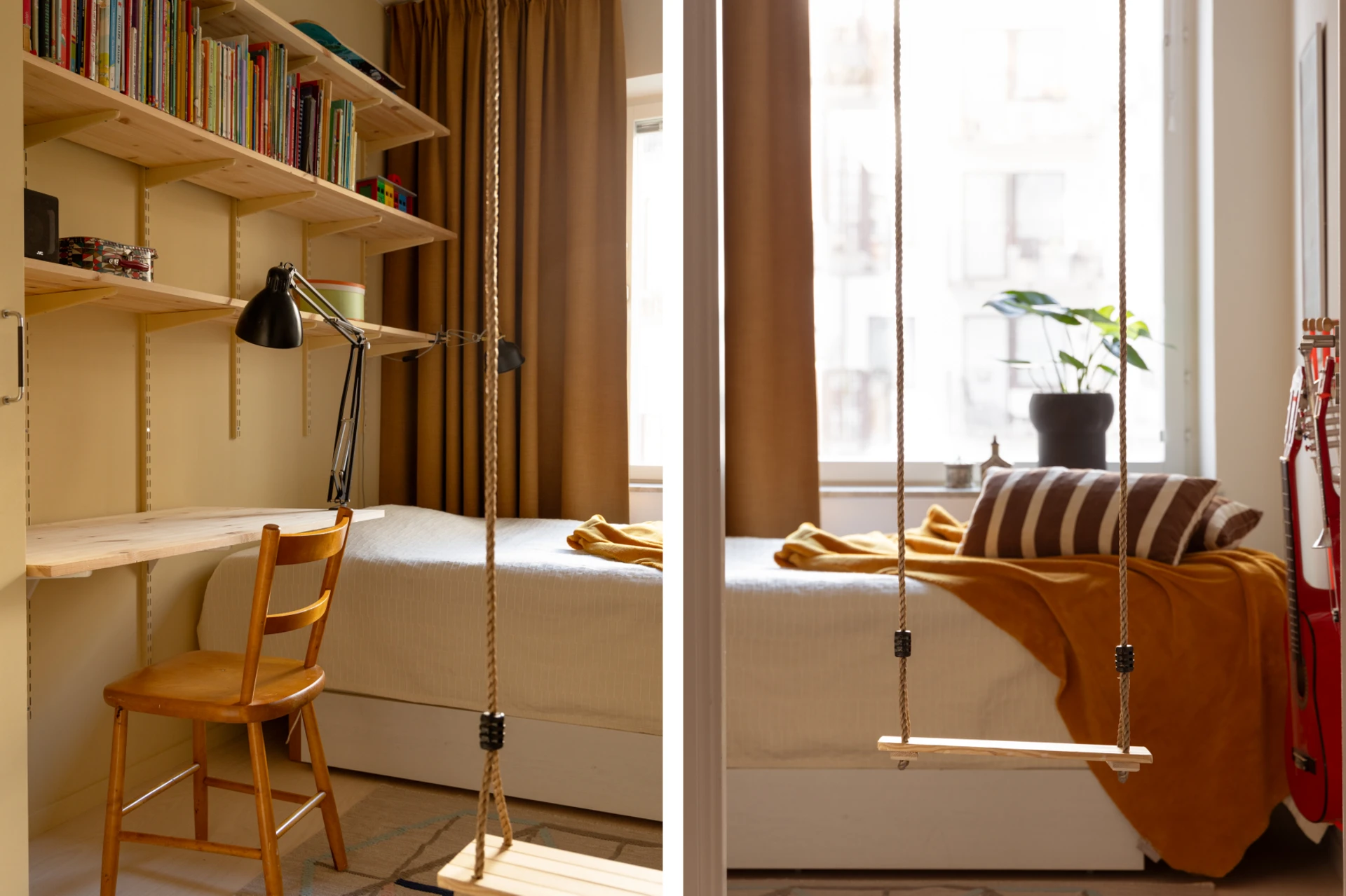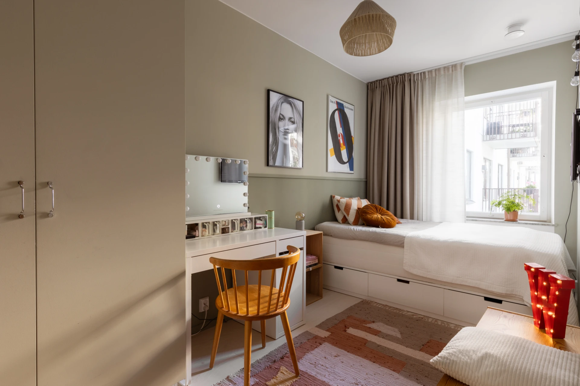 Grön kulör på väggar och genomgående golv. Plats för säng, sängbord, skrivbord samt annan valfri möblering. Garderob med goda förvaringsmöjligheter. Fönster som ger ljusinsläpp.