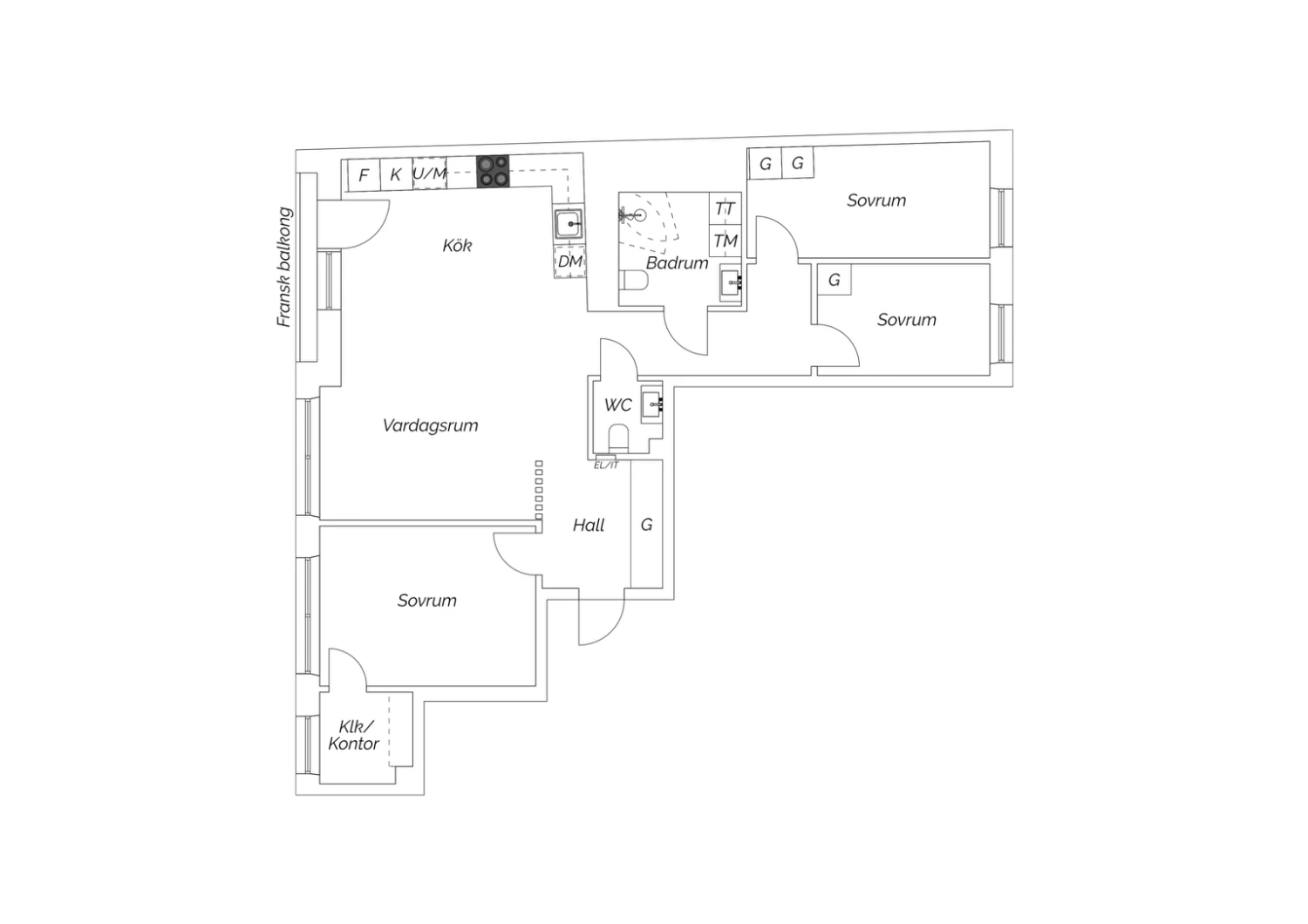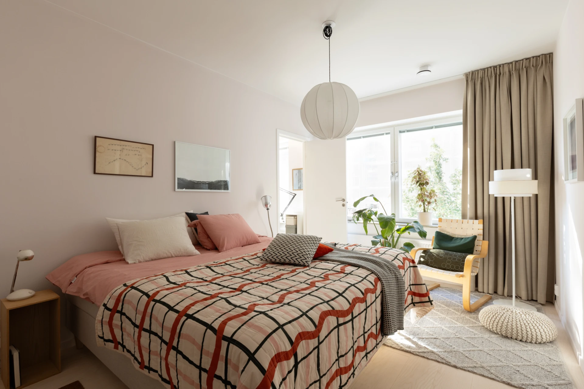 Plats för dubbelsäng, sängbord, fåtölj eller annan valfri möblering. Klädkammare/kontor intill sovrum med plats för skrivbord. Fint ljusinsläpp via fönsterpartier.