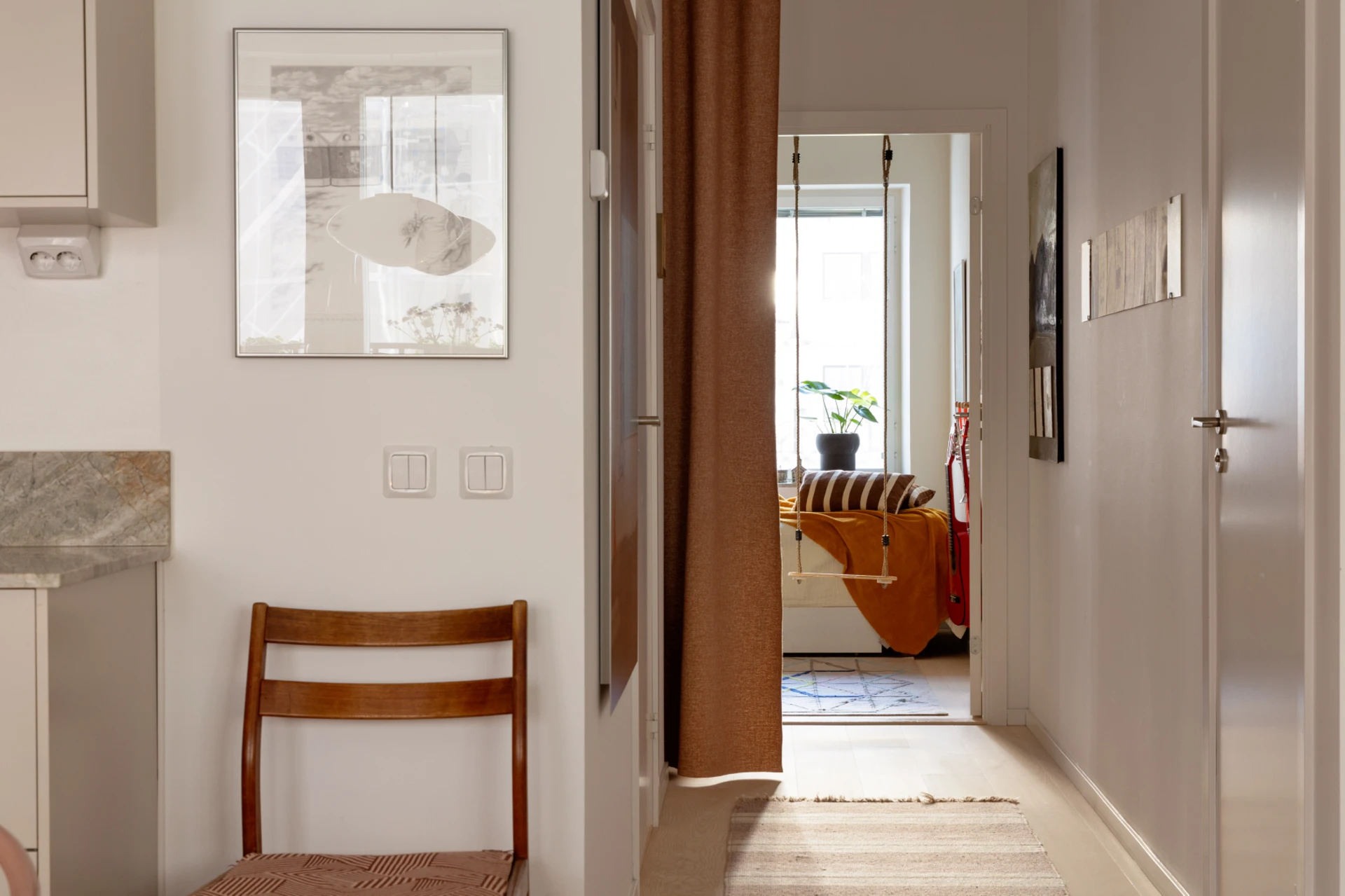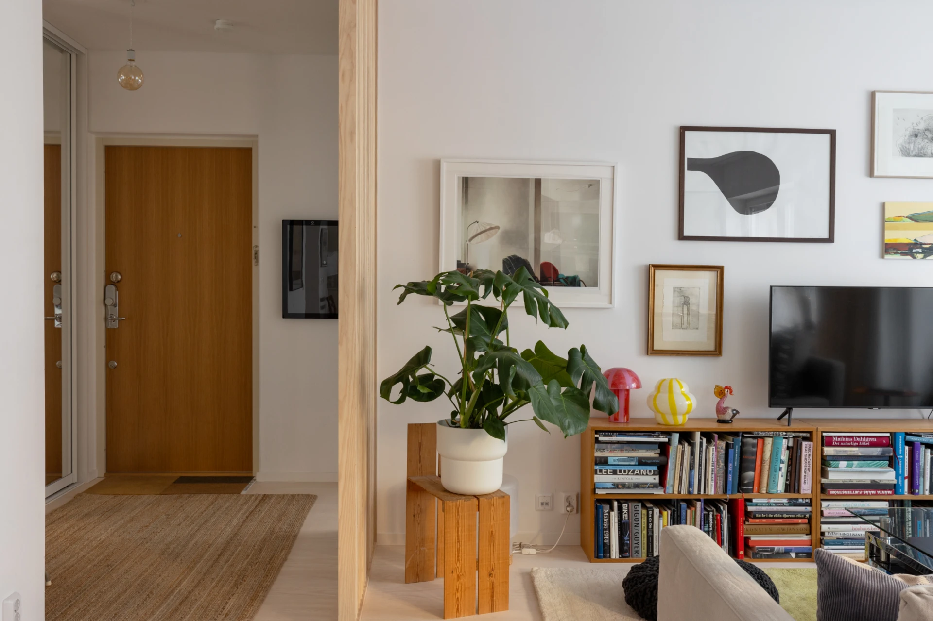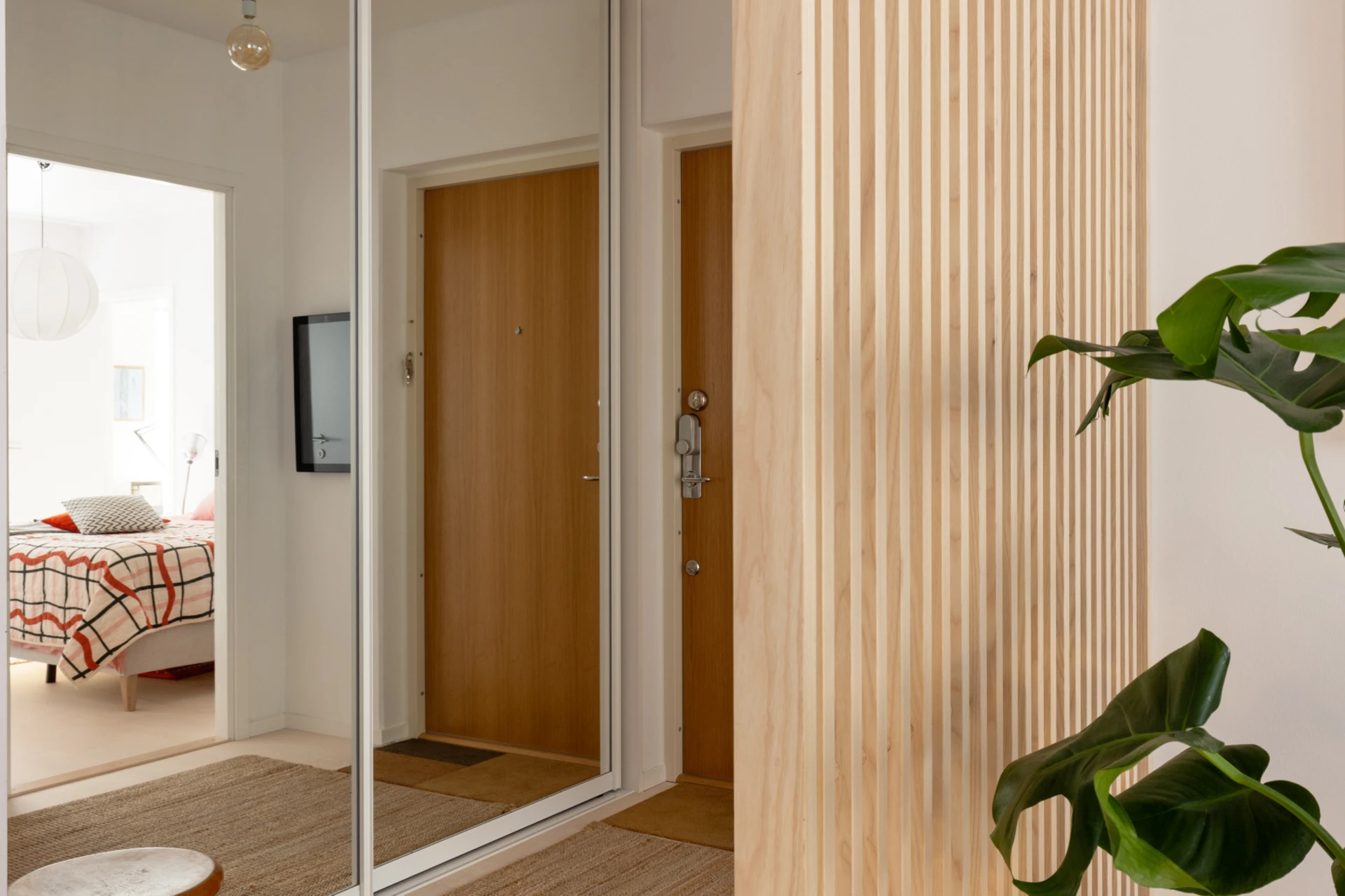 Genomgående golv i lägenheten, Ask Horizon, som är en borstad, pigmenterad 1-stav i en dimmig, transparent vit nyans. Hallen har ljusa väggar och specialanpassad garderobslösning med skjutdörrar. Träspaljé/rumsavdelare av ask mellan hall och vardagsrum.