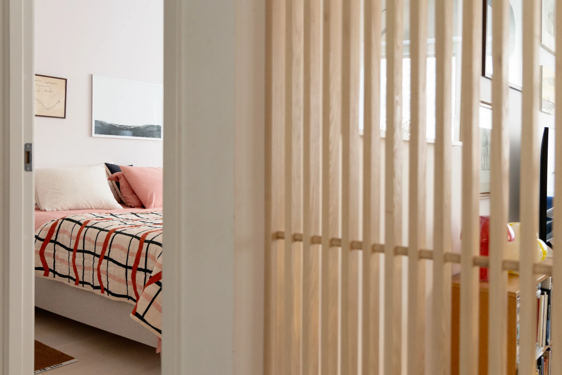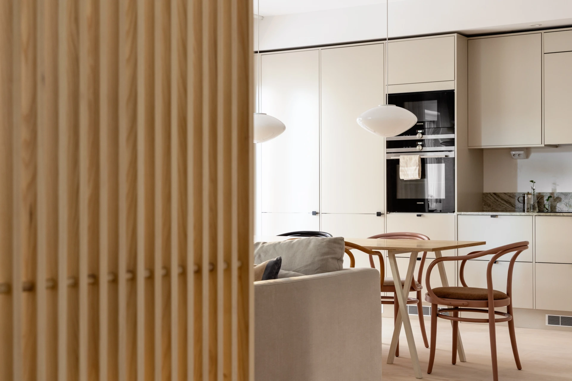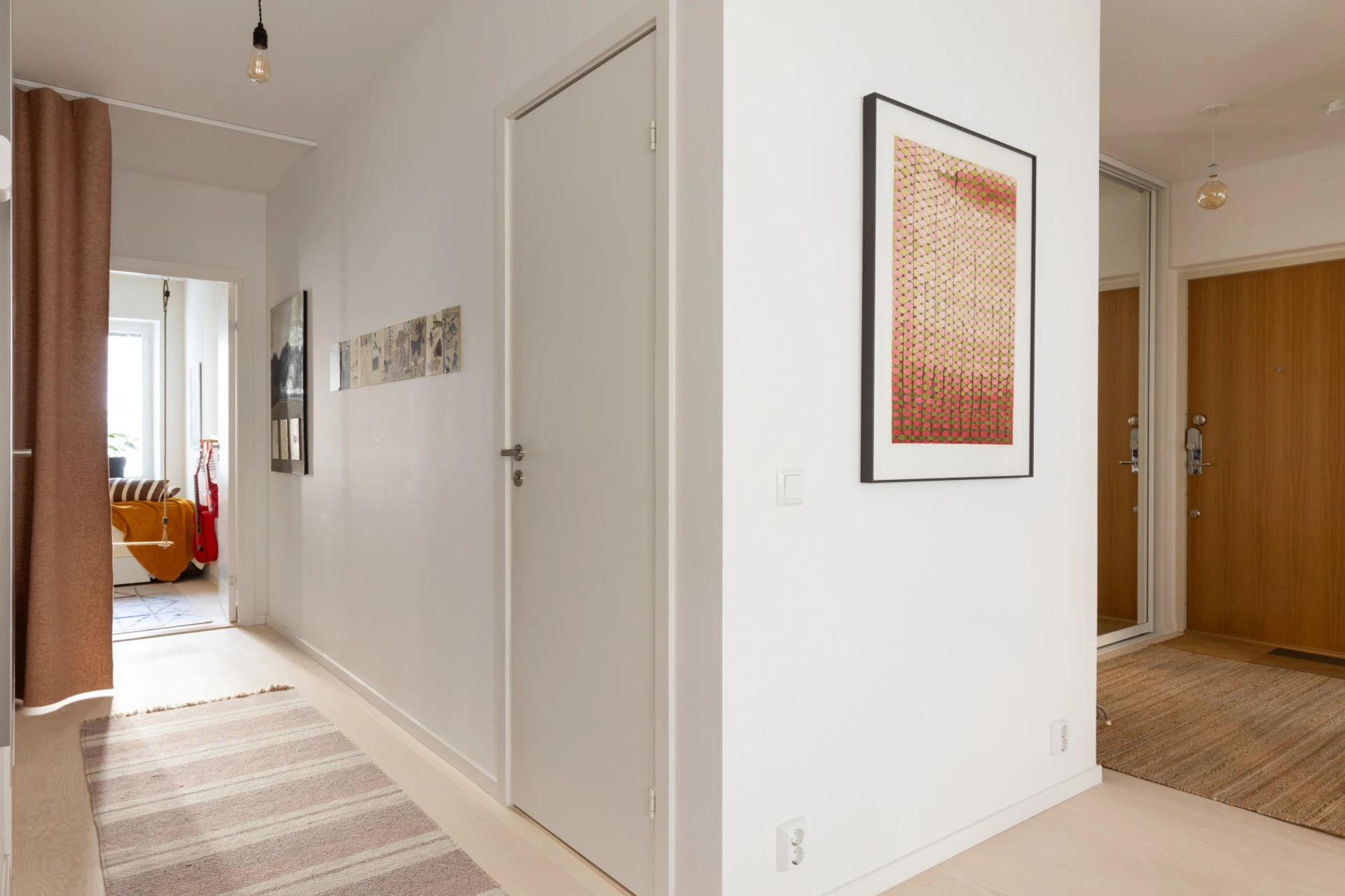 Genomgående golv i lägenheten, Ask Horizon, som är en borstad, pigmenterad 1-stav i en dimmig, transparent vit nyans. Hallen har ljusa väggar och specialanpassad garderobslösning med skjutdörrar. Träspaljé/rumsavdelare av ask mellan hall och vardagsrum.