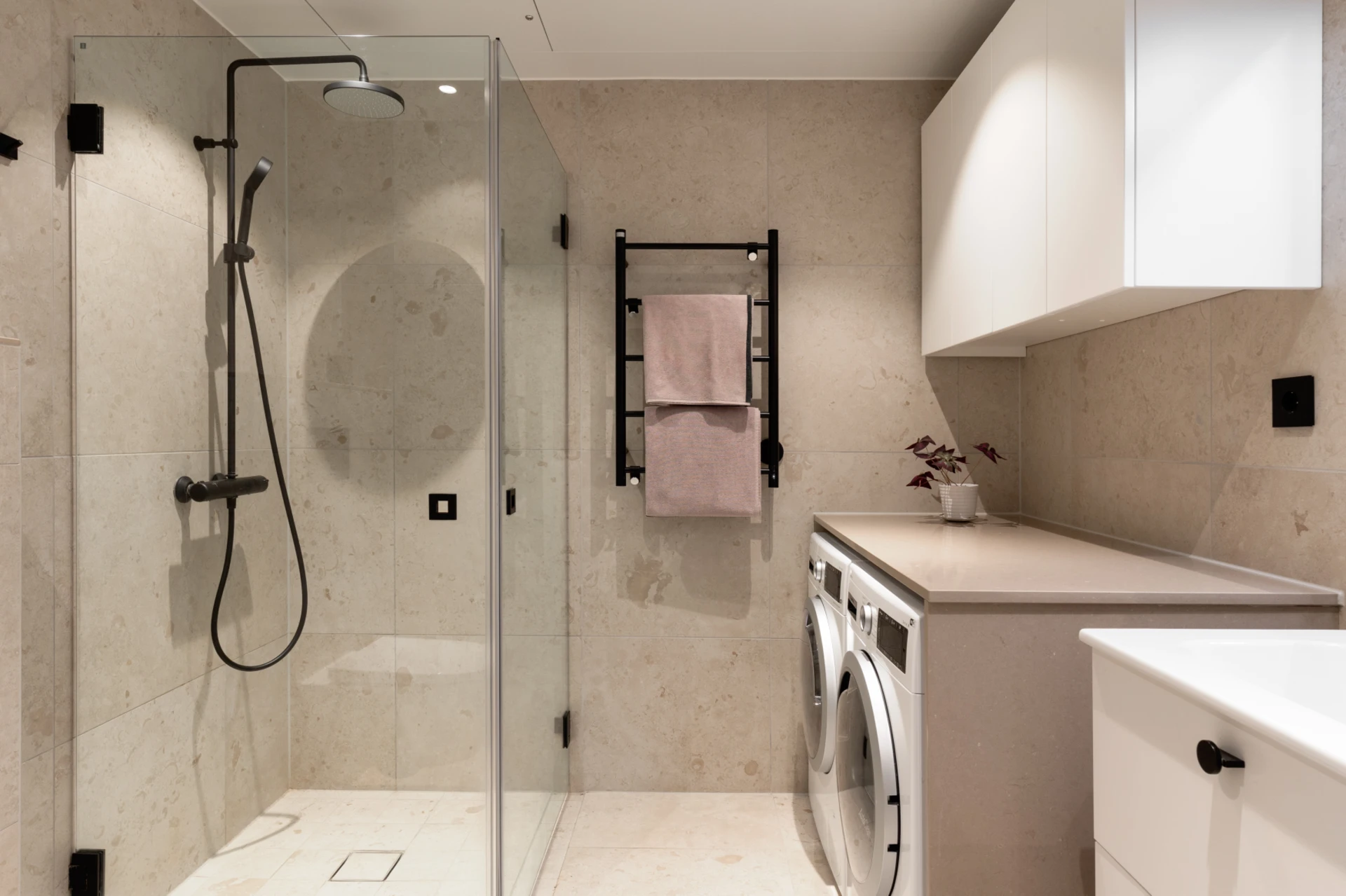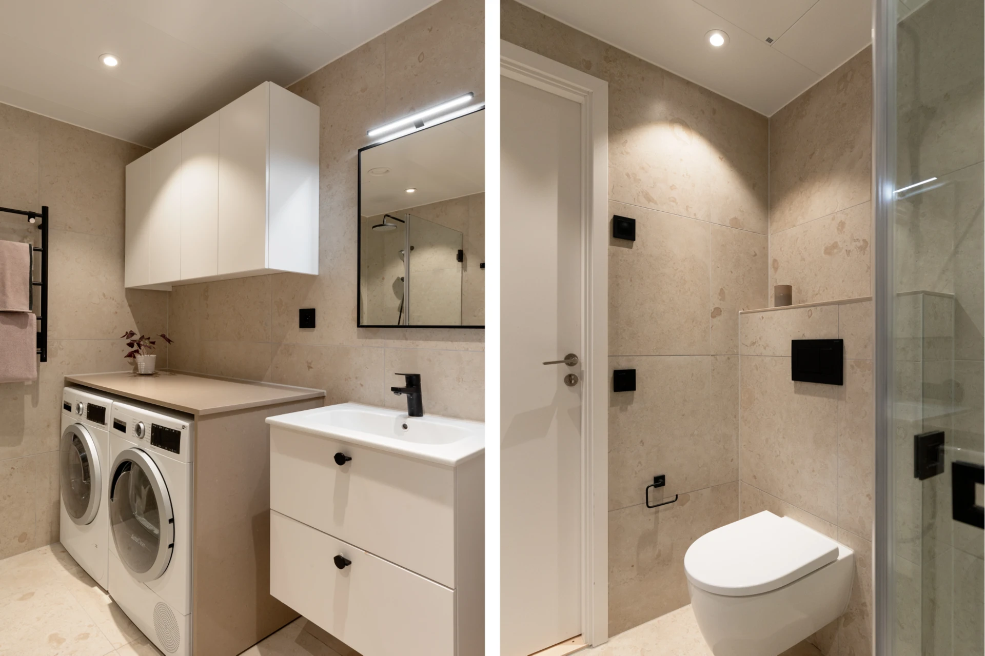 Granitkeramik på väggar och golv från Bricmate J Norrvange Ivory. Utrustat med takdusch, vägghängd wc, vikbara duschglas, handdukstork, väggspegel samt handfat med kommod. Bänkskiva i Silestone Coral Clay och tvätt och-torktumlare från Bosch.