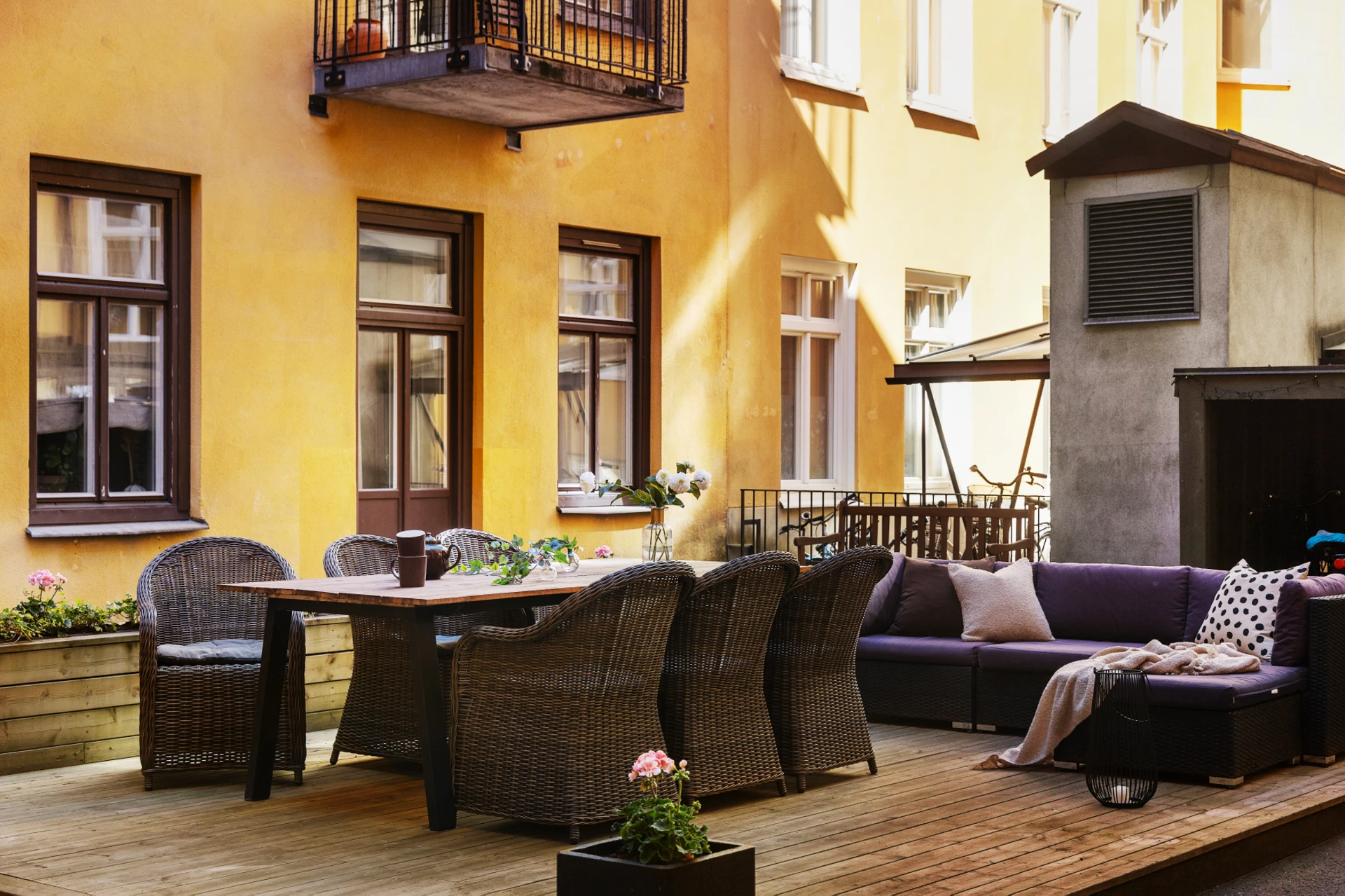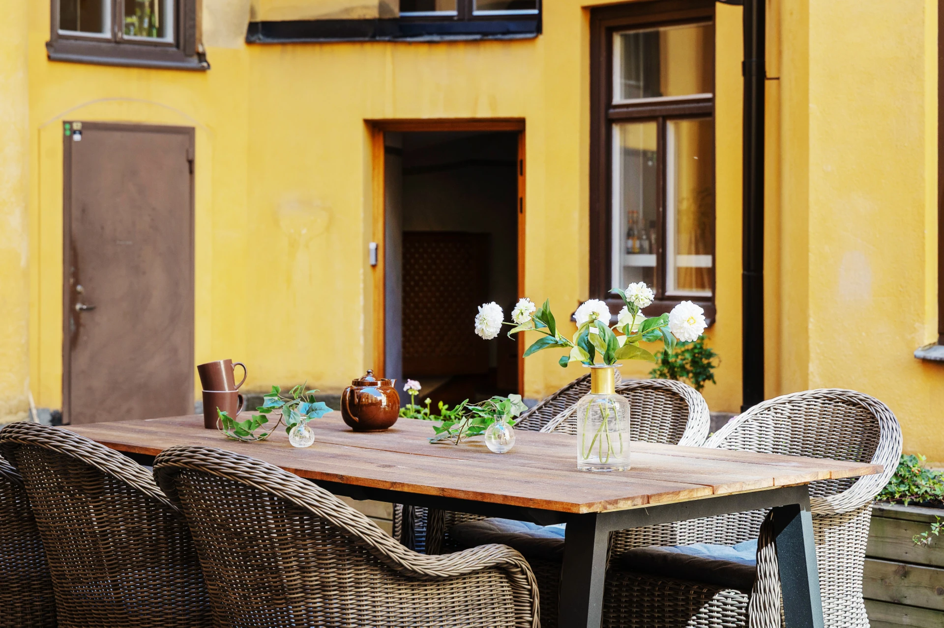 Trevlig gård med bord, stolar och grillmöjligheter.