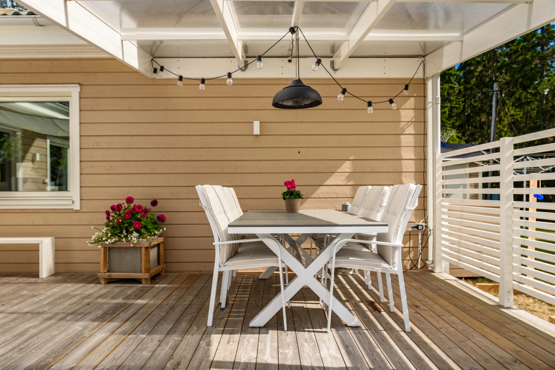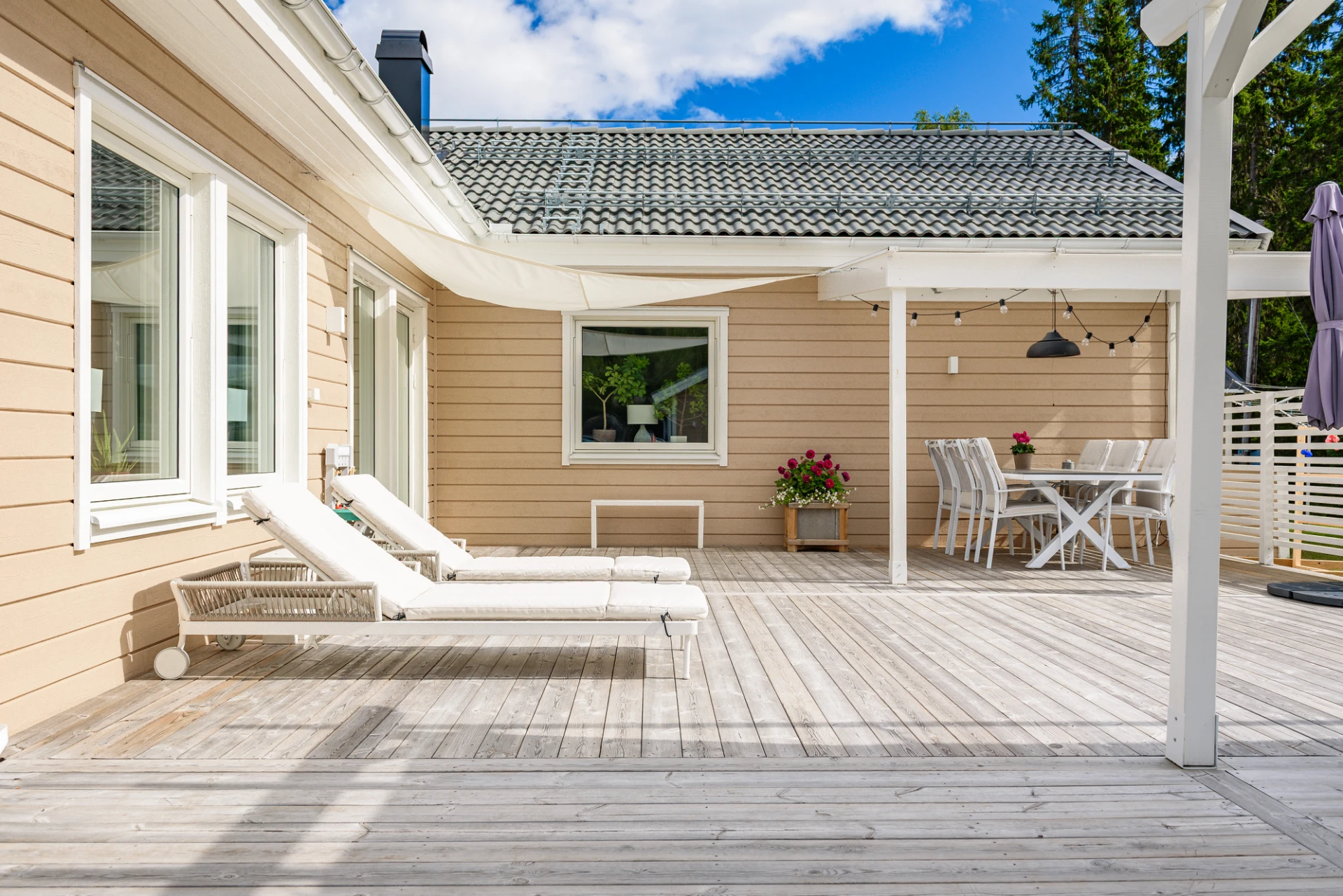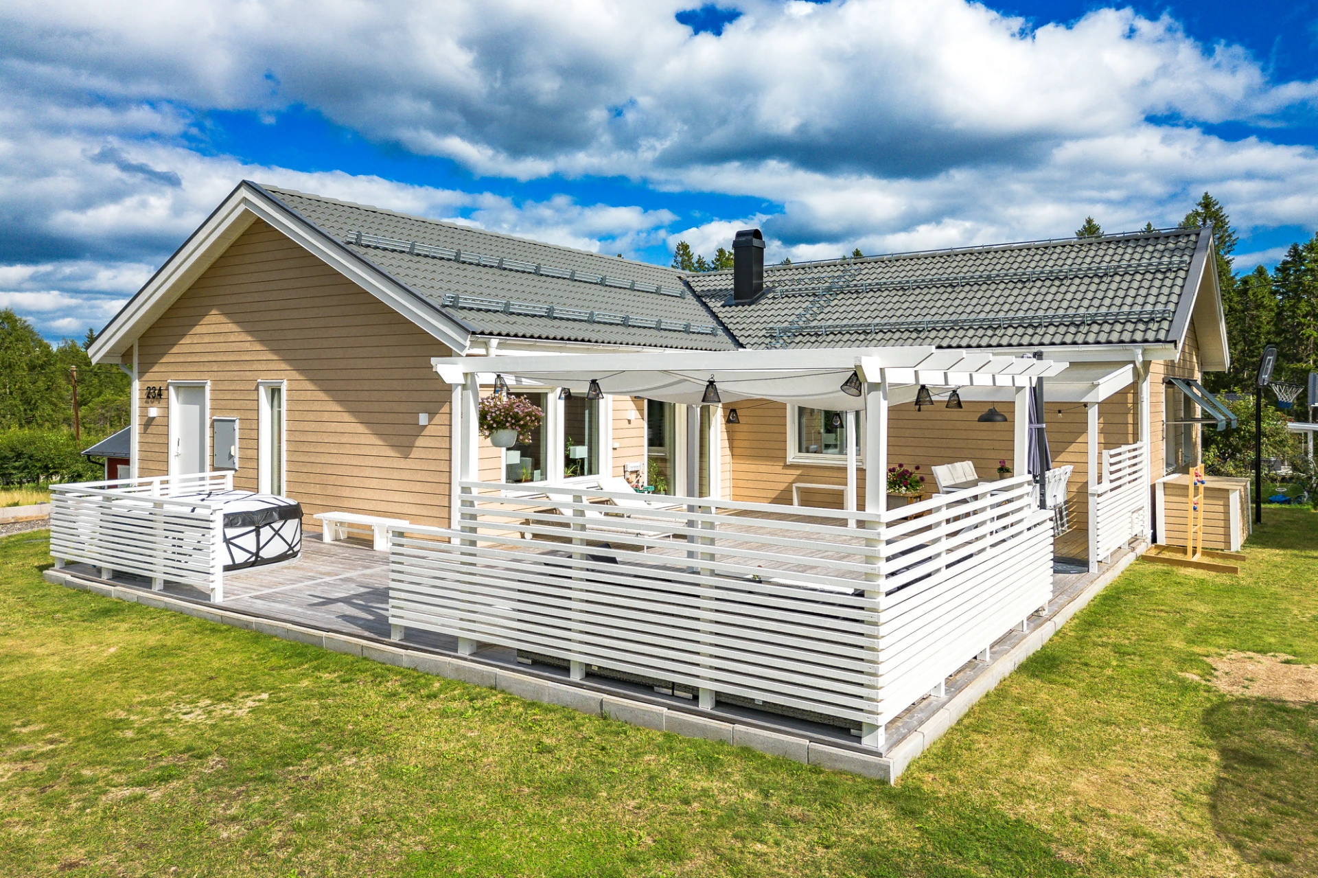 Matrum/Vardagsrum med ljusa väggar och ekgolv för en luftig atmosfär. Utrymme för mat- och soffgrupp. Stora fönster med en helglasad balkongdörr som leder till altanen. En kamin för kalla vinterdagar som även höjer mysfaktorn.