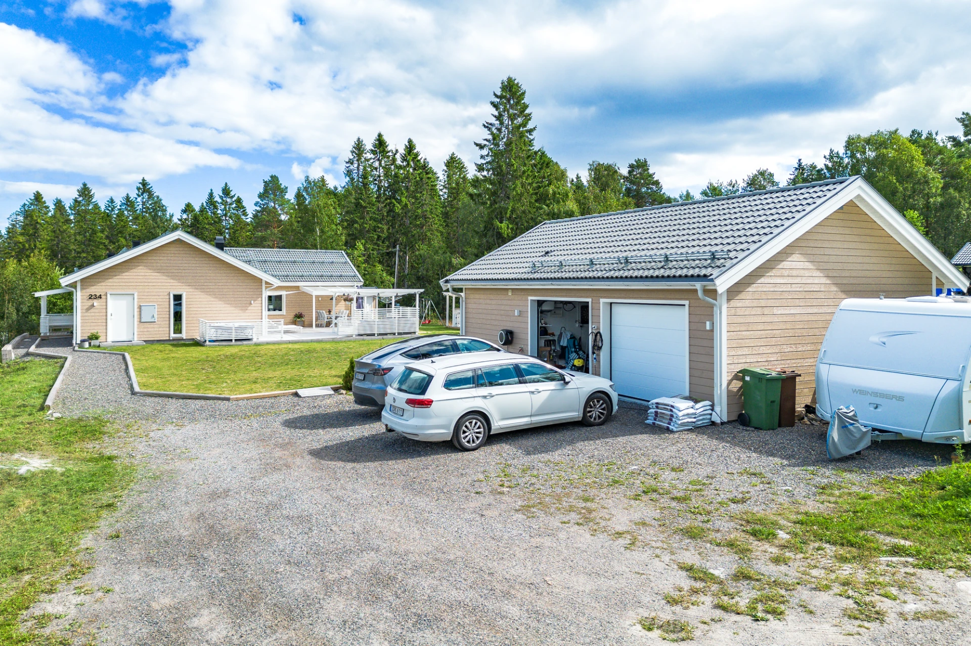 Gjuten platta med plats för två bilar och bra med förvaring. Elbilsladdare med lastbalansering finns installerad.