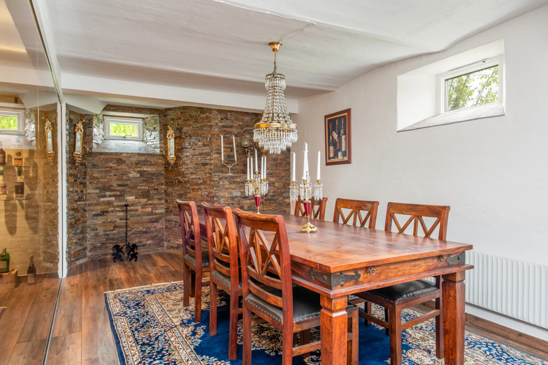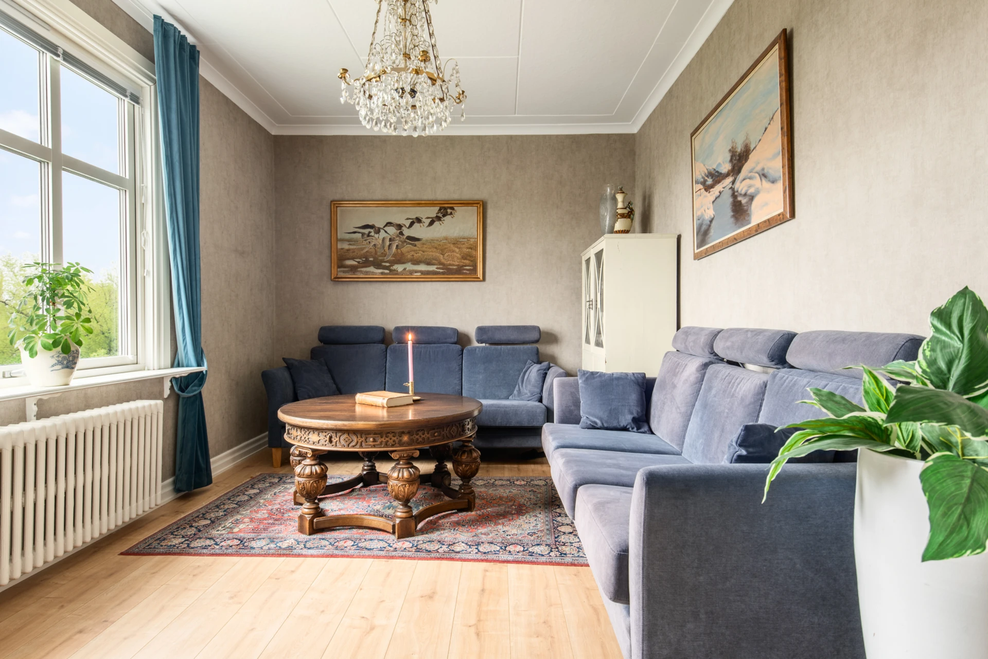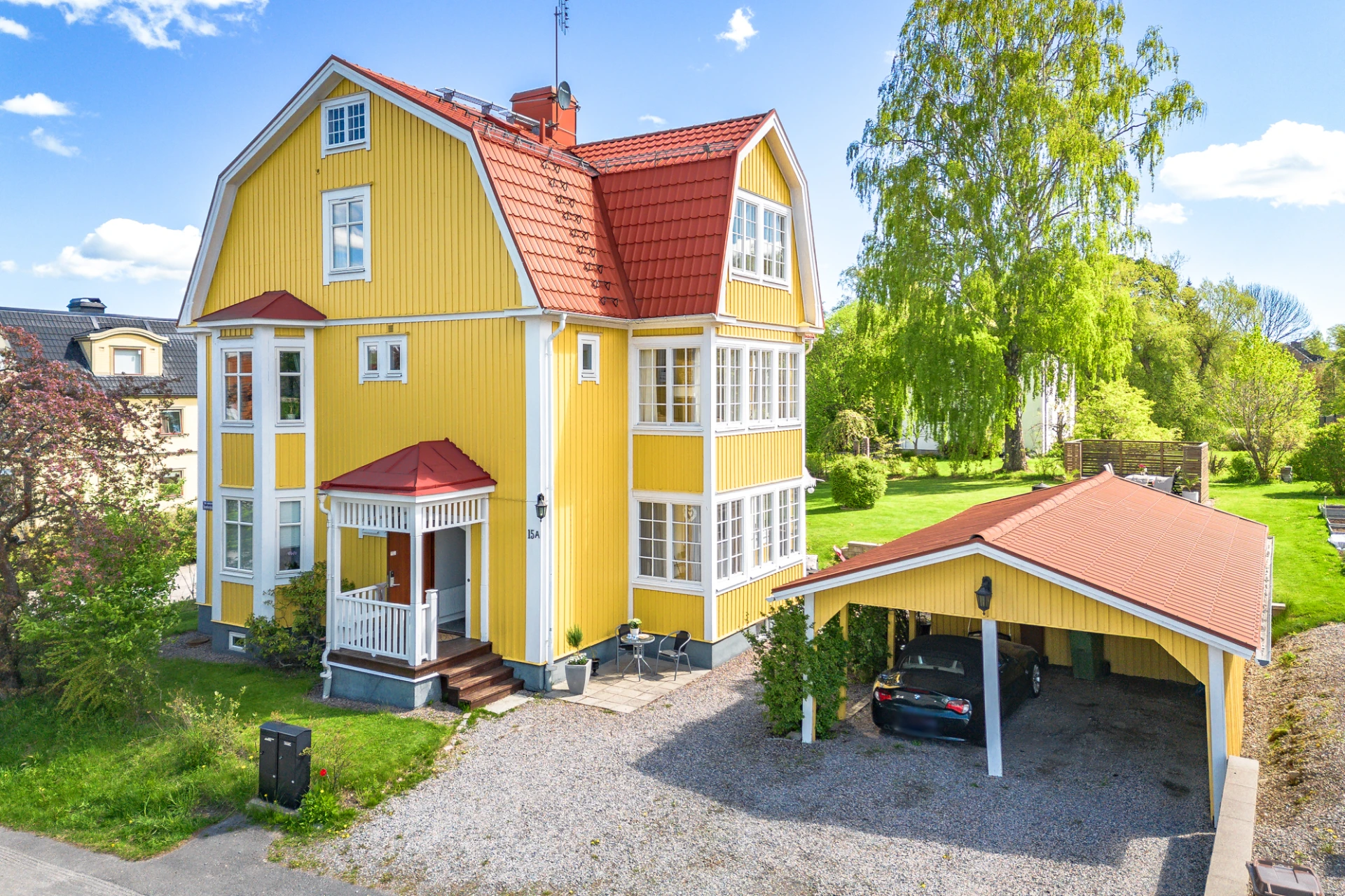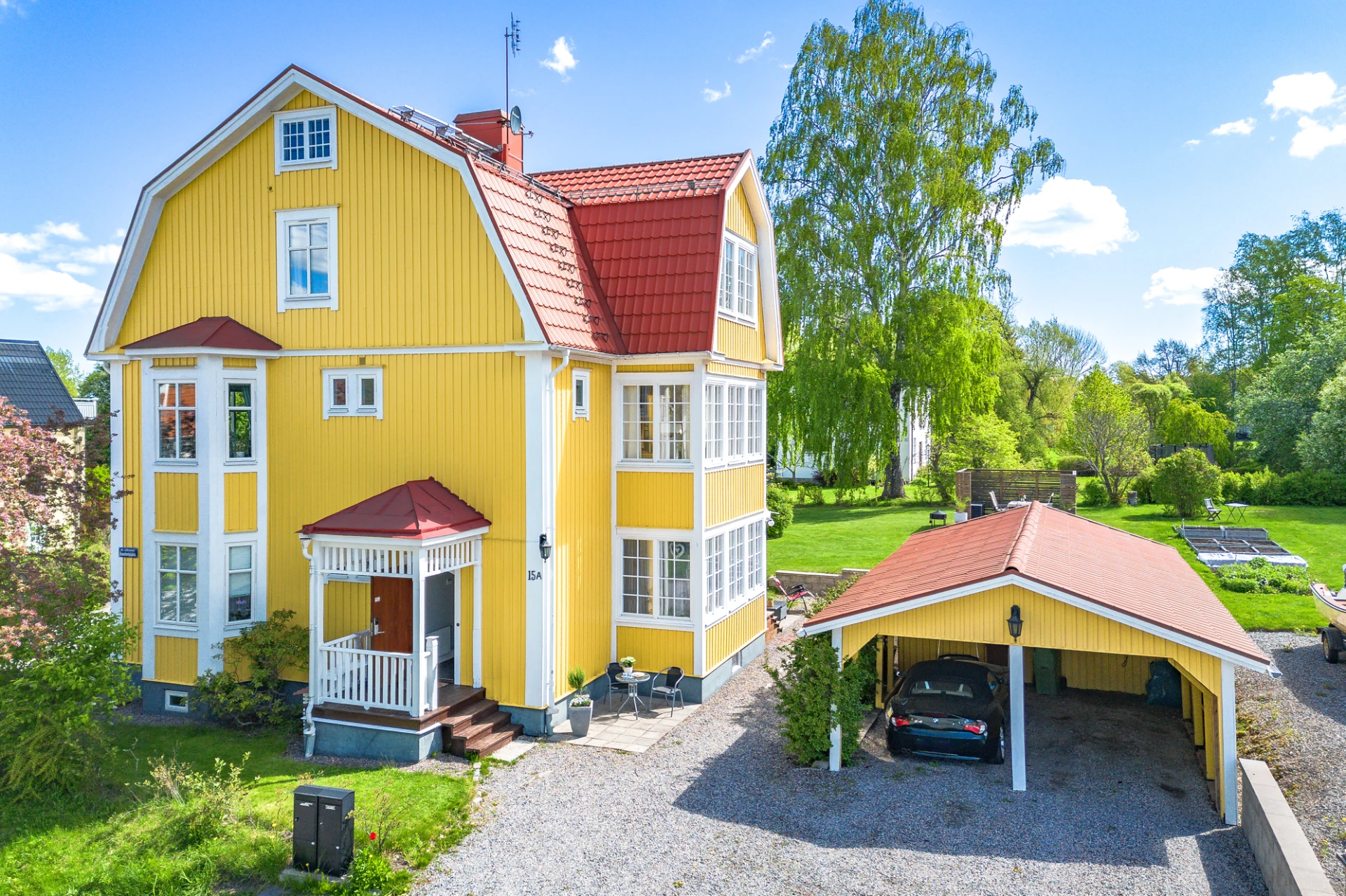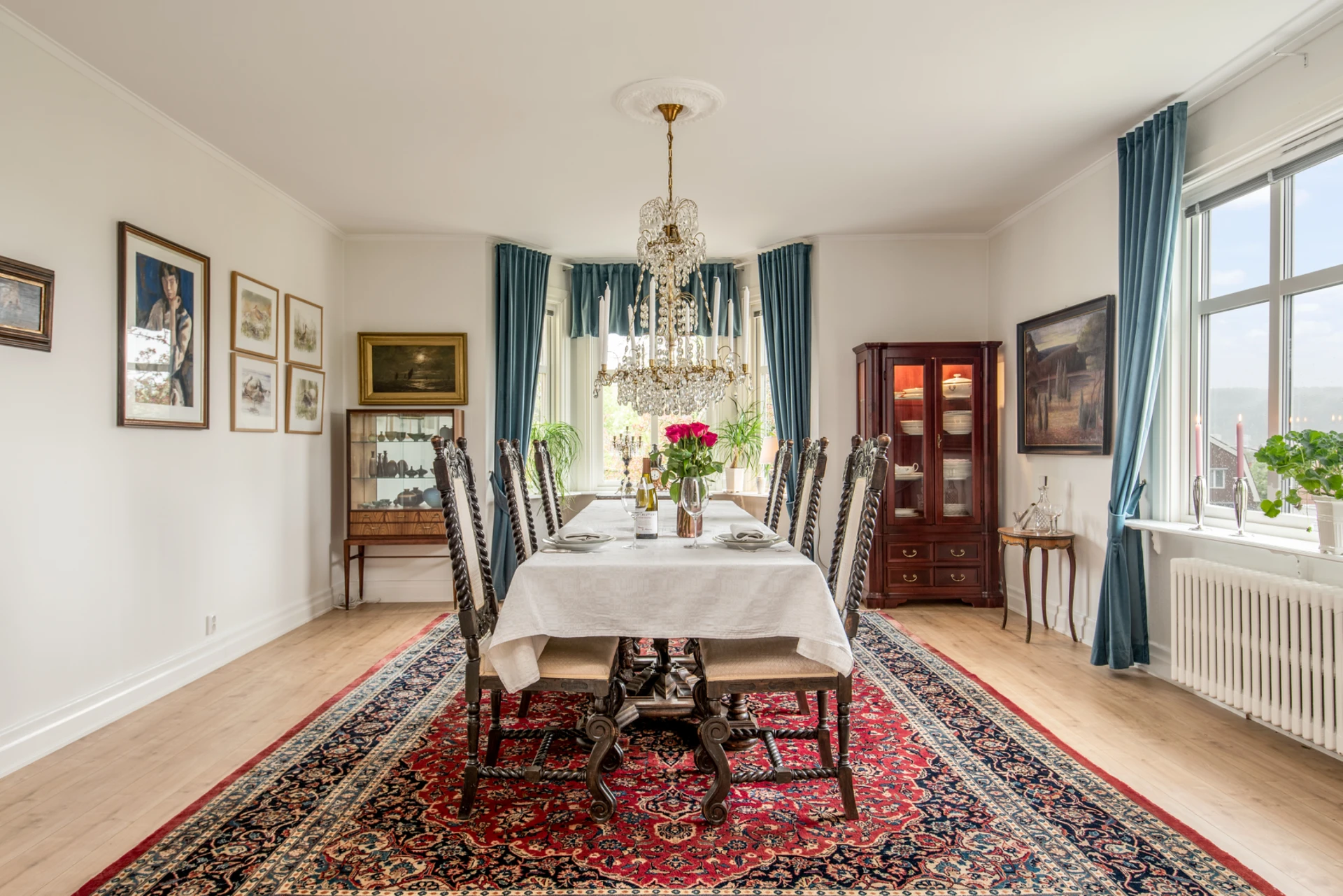 Allrum (Våningsplan 1) har ett burspråk och en braskamin. Fint ljusinsläpp genom fönsterpartier i söderläge ger rummet en varm och välkomnande atmosfär.
