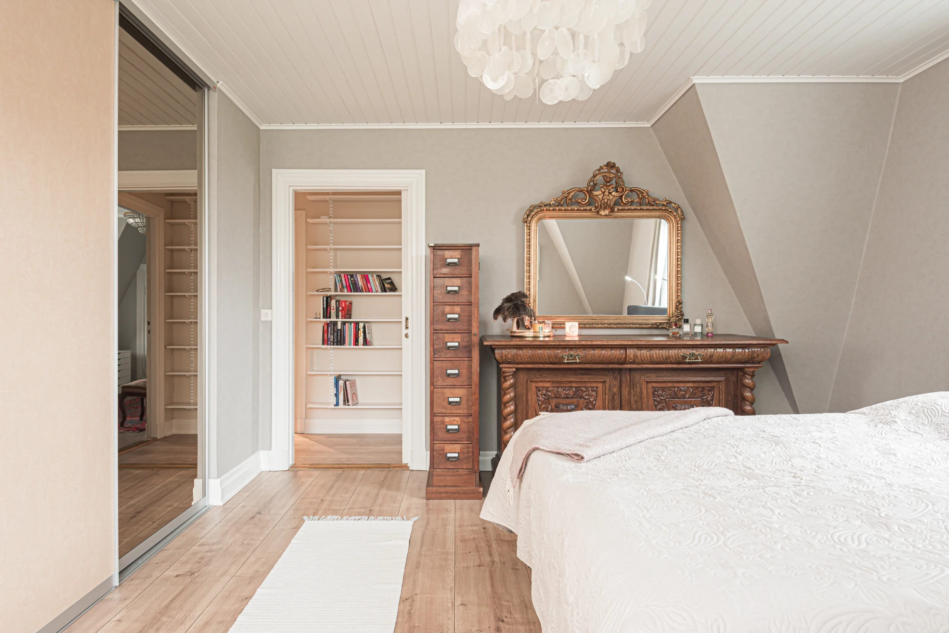 Sovrum 5 har smart förvaring tack vare en rymlig klädkammare, vilket skapar en välorganiserad och stilren atmosfär. Perfekt för ordning och enkelt tillgång till kläder.