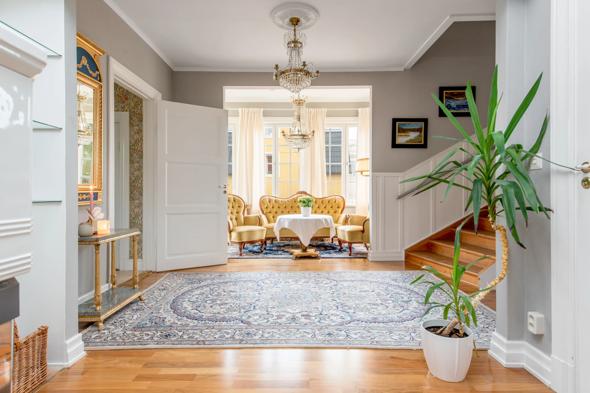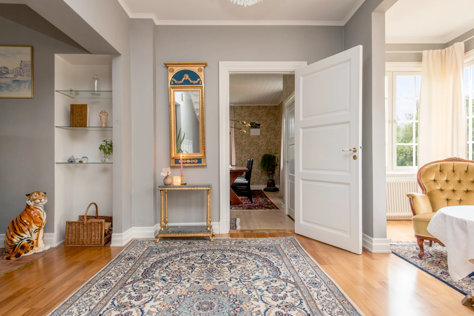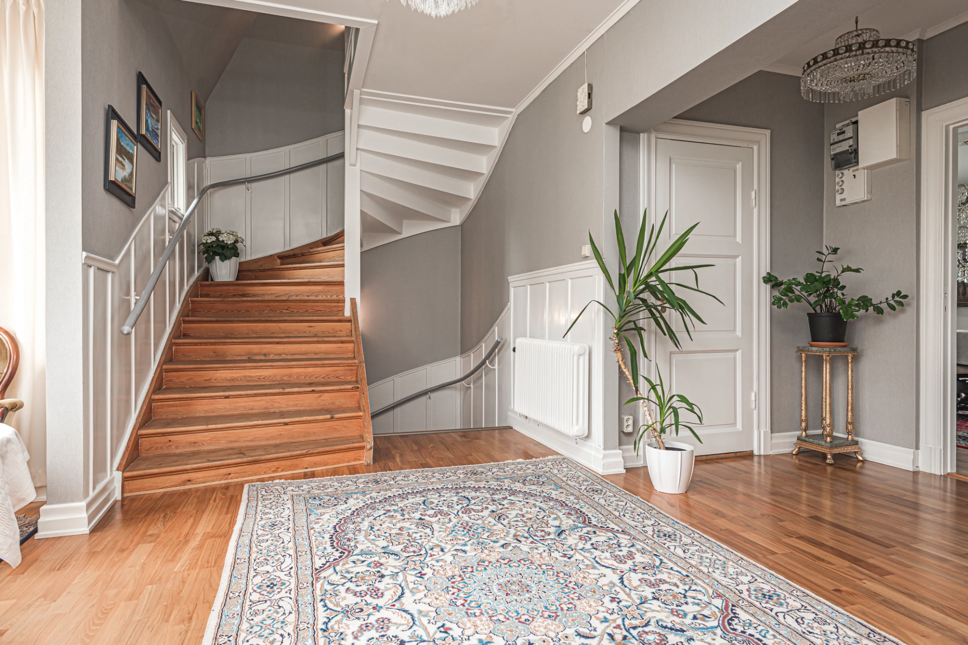 Hall med burspråk erbjuder extra ljusinsläpp och rymd. Burspråket bidrar till arkitektonisk karaktär och kan fungera som en charmig plats för sittgrupp eller dekoration.