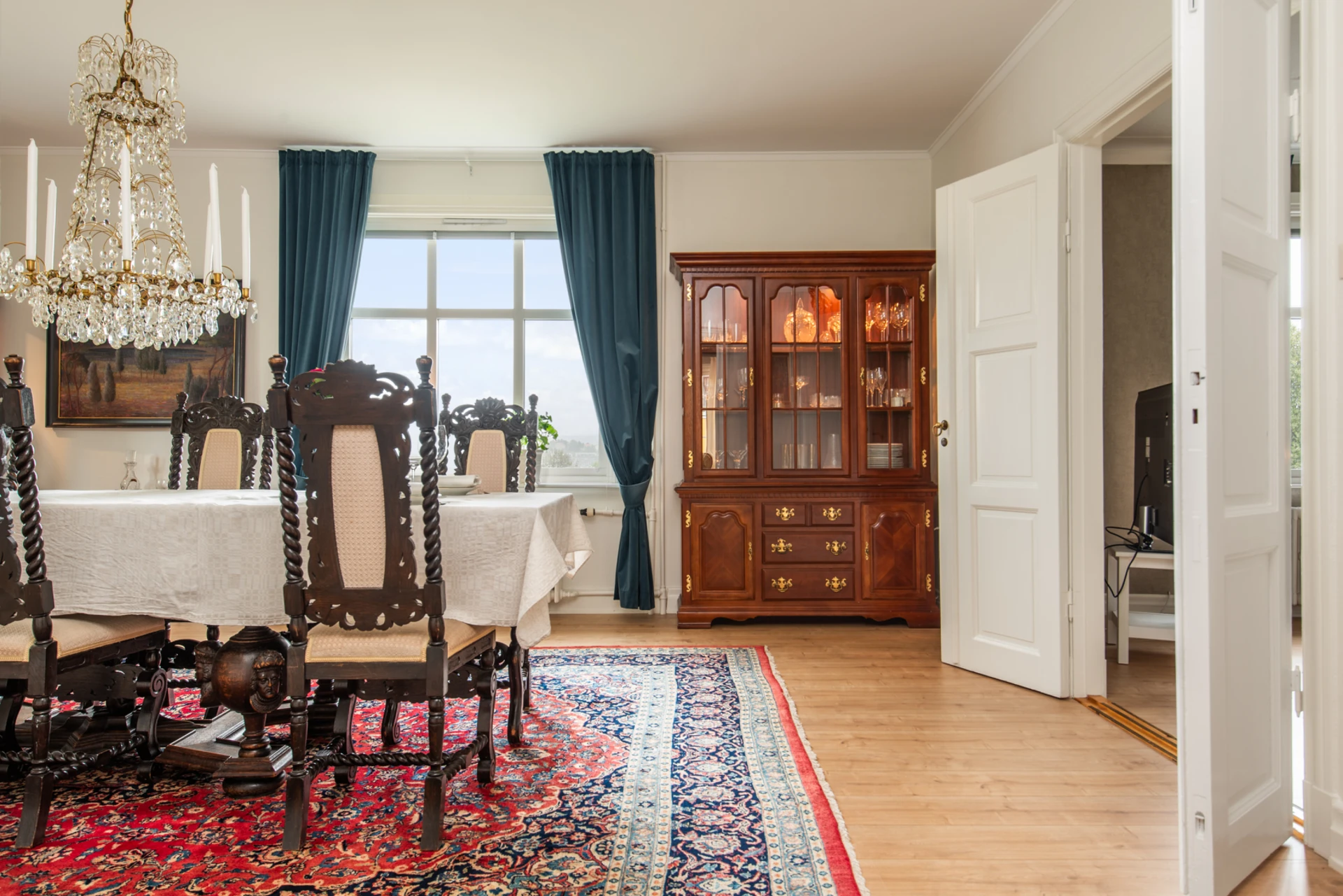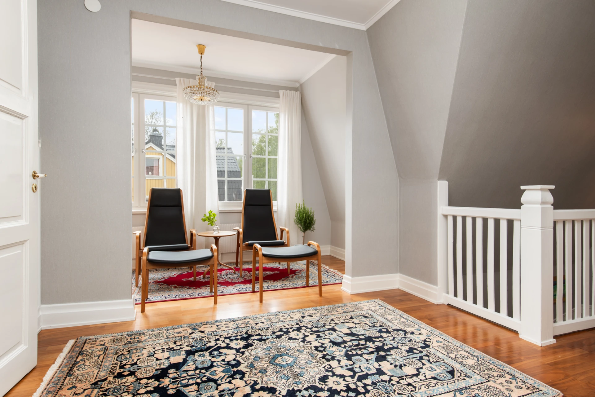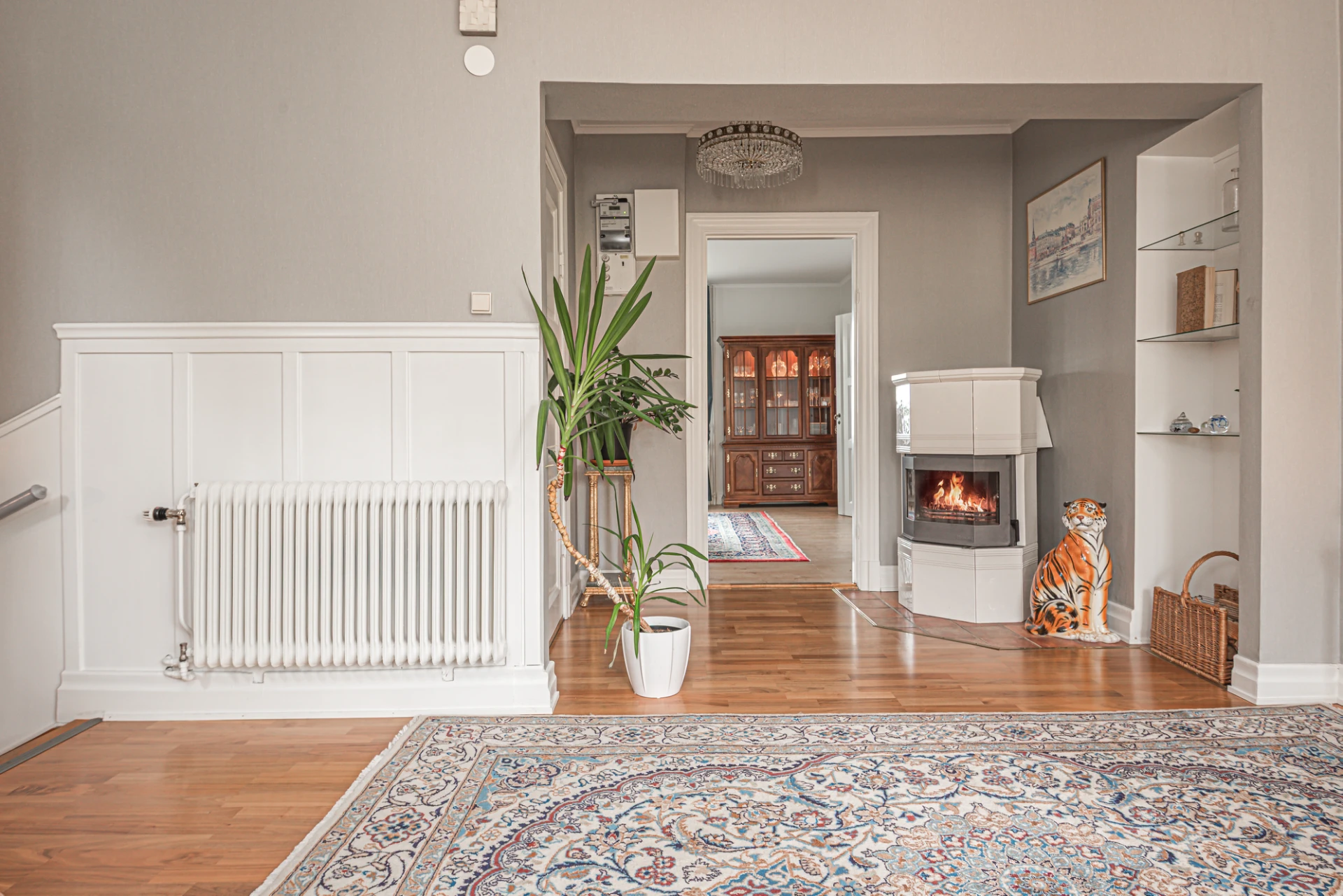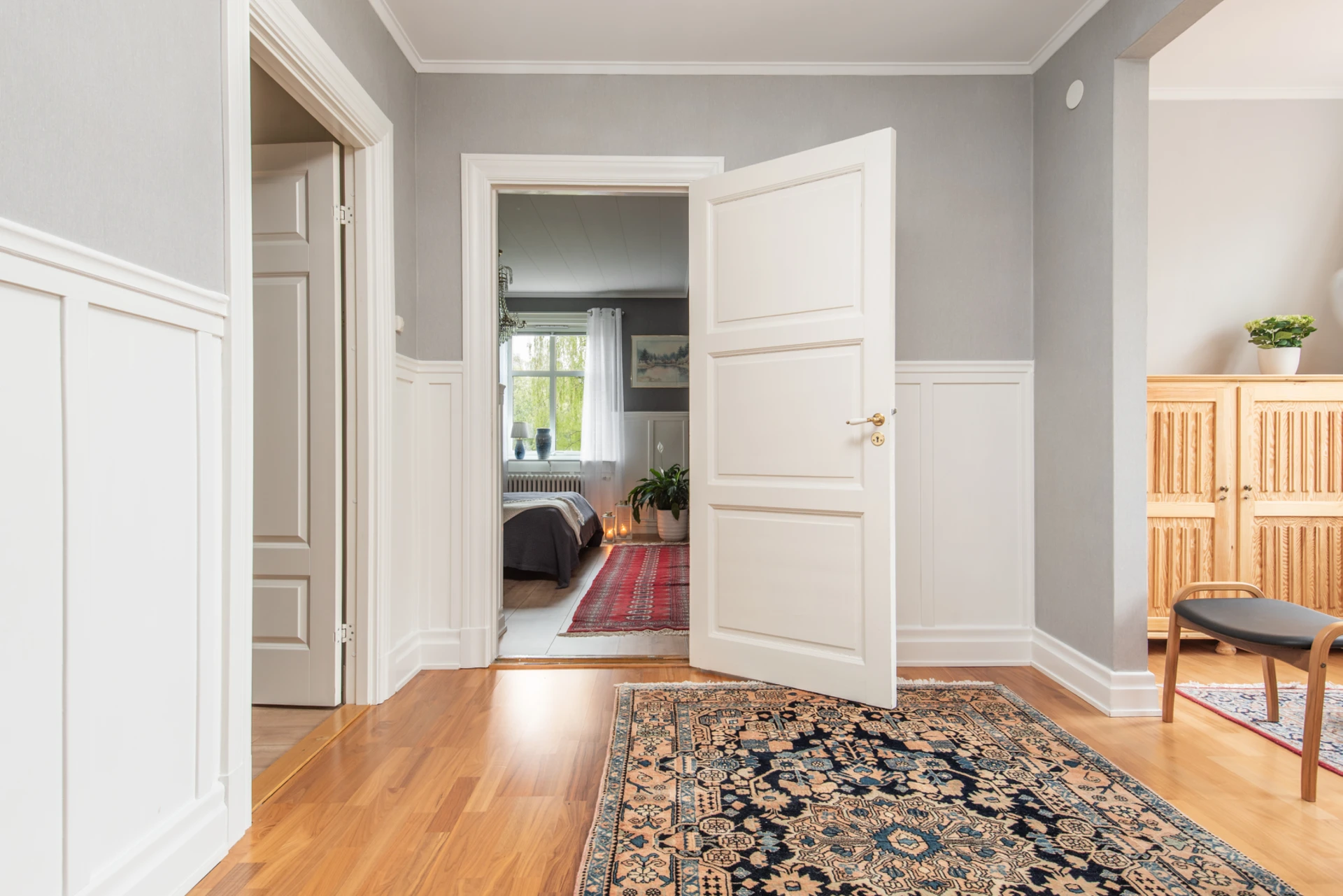 Hall med burspråk erbjuder extra ljusinsläpp och rymd. Burspråket bidrar till arkitektonisk karaktär och kan fungera som en charmig plats för sittgrupp eller dekoration.