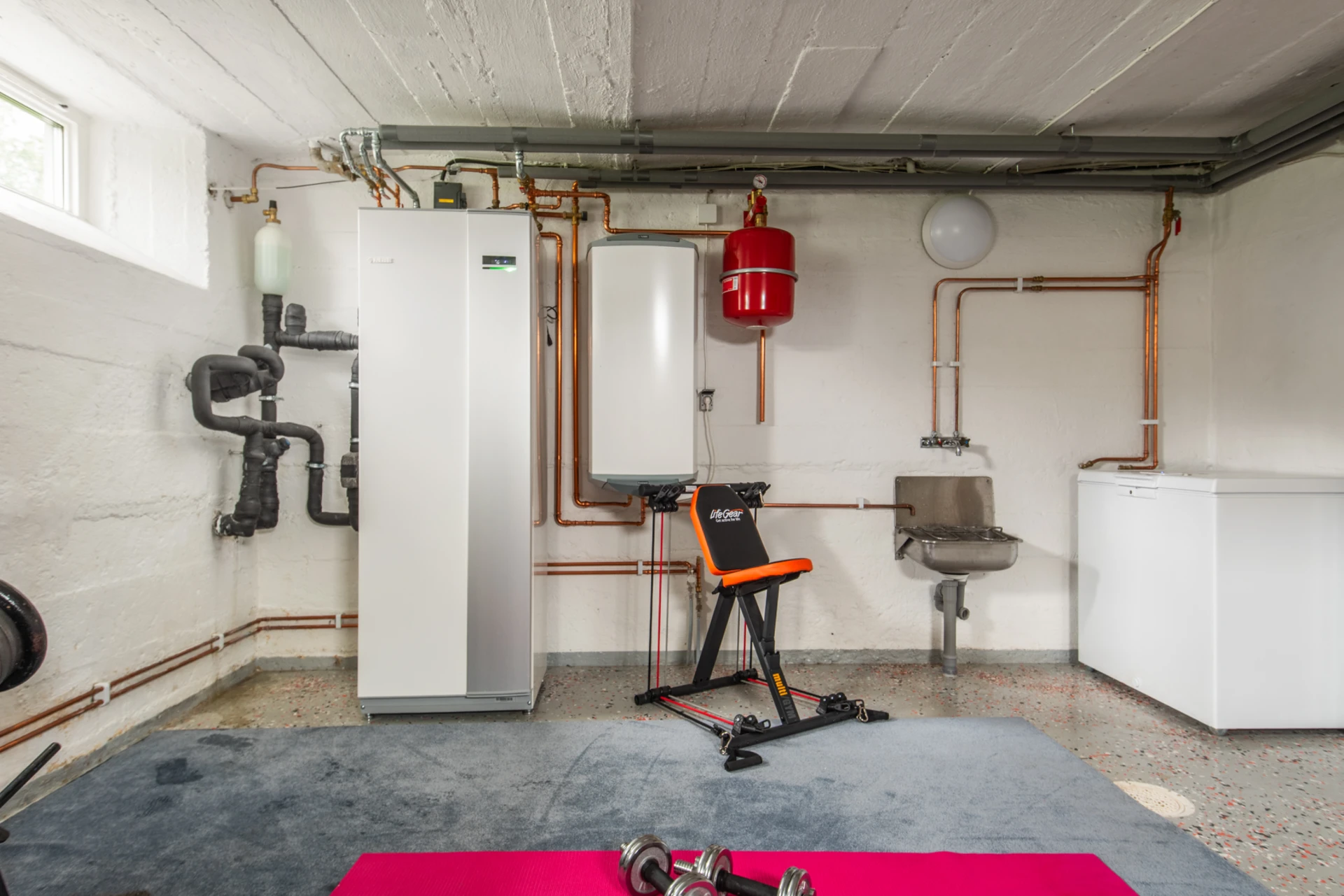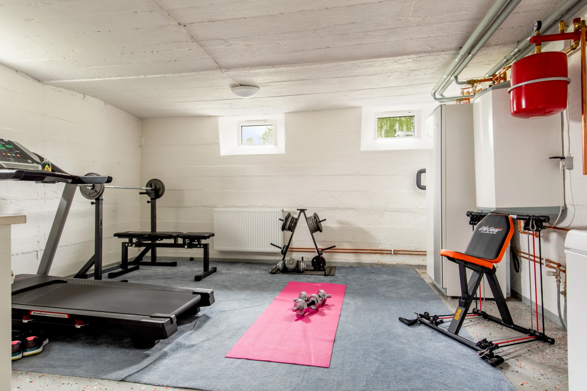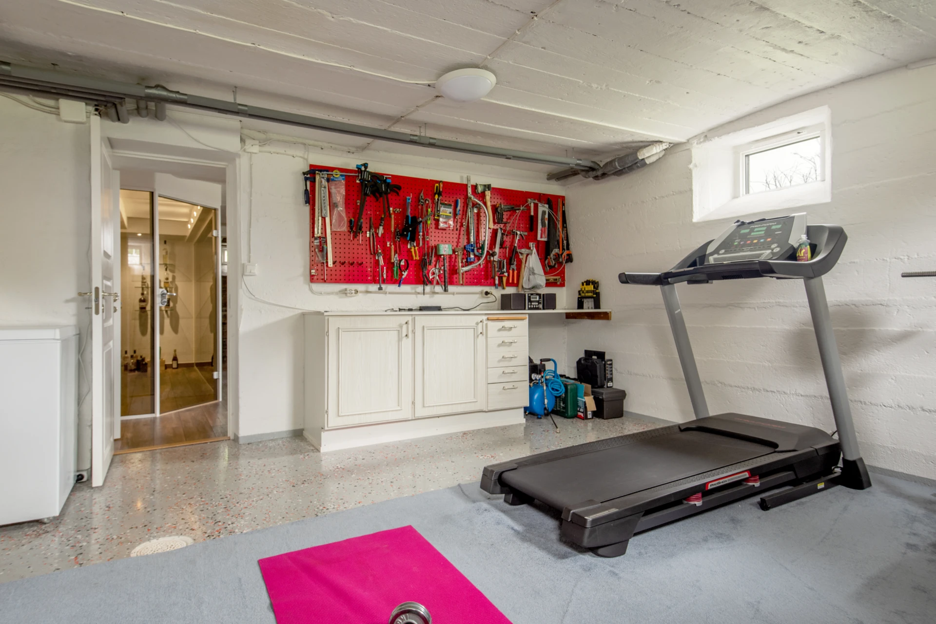 Ett flexibelt pannrum som kan anpassas med en arbetsbänk eller förvandlas till ett hemmagym. Perfekt för praktiskt arbete eller träning i hemmet.