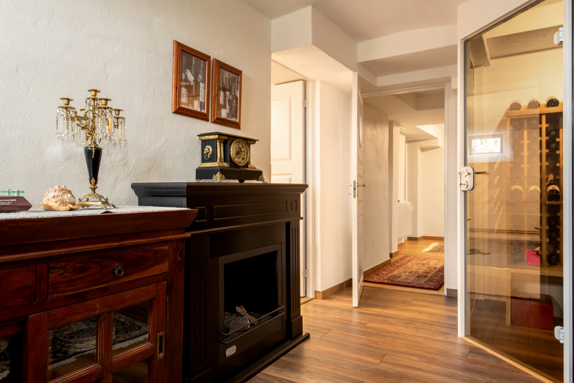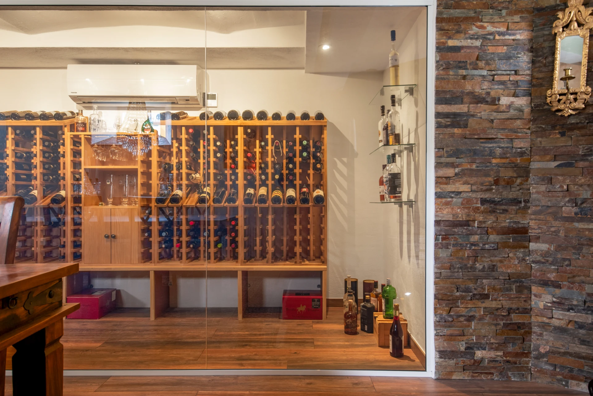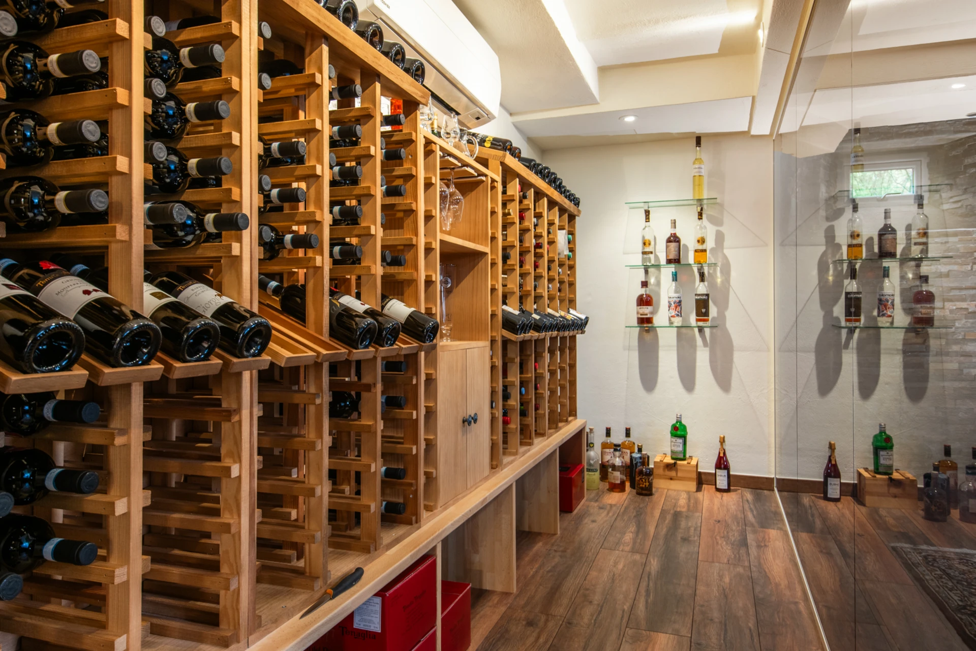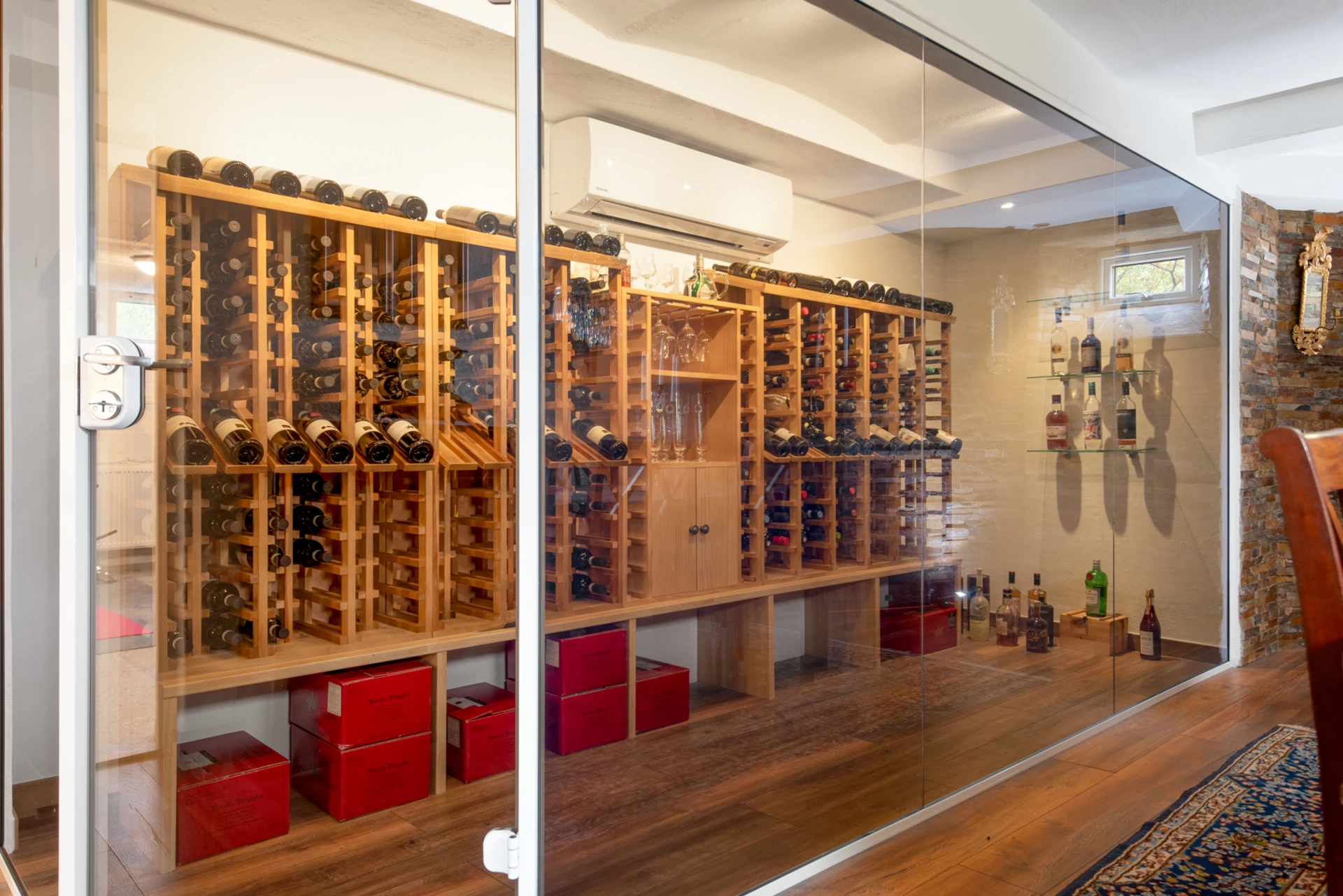 Vinkällaren har ett rymligt walkin-kylrum och glasväggar som skiljer lagringsutrymmet från provningsdelen, vilket skapar en stilren och modern atmosfär.