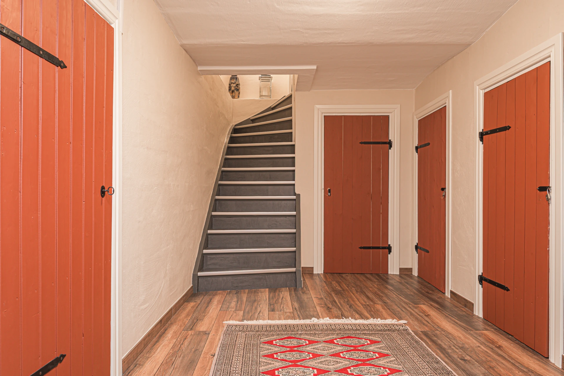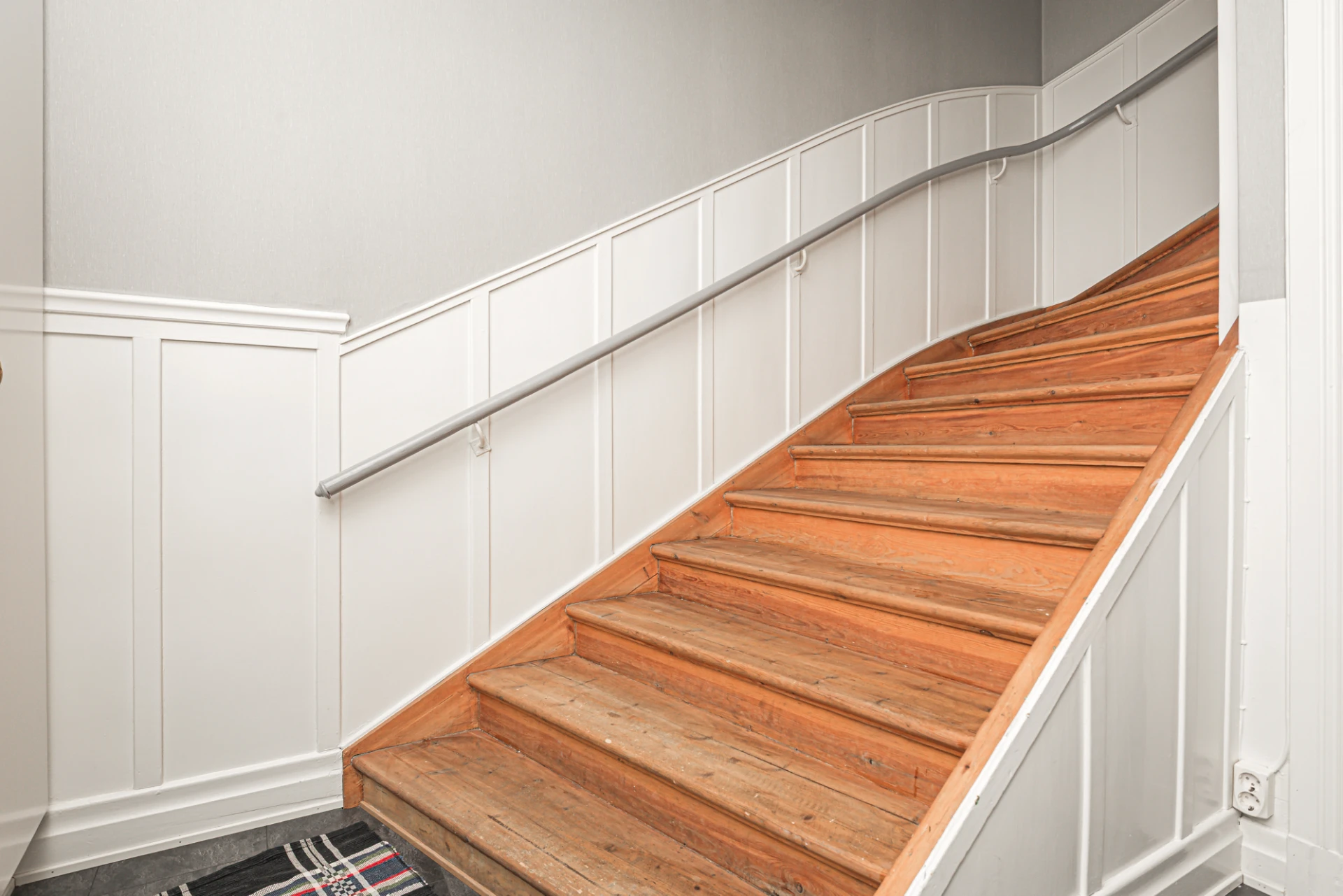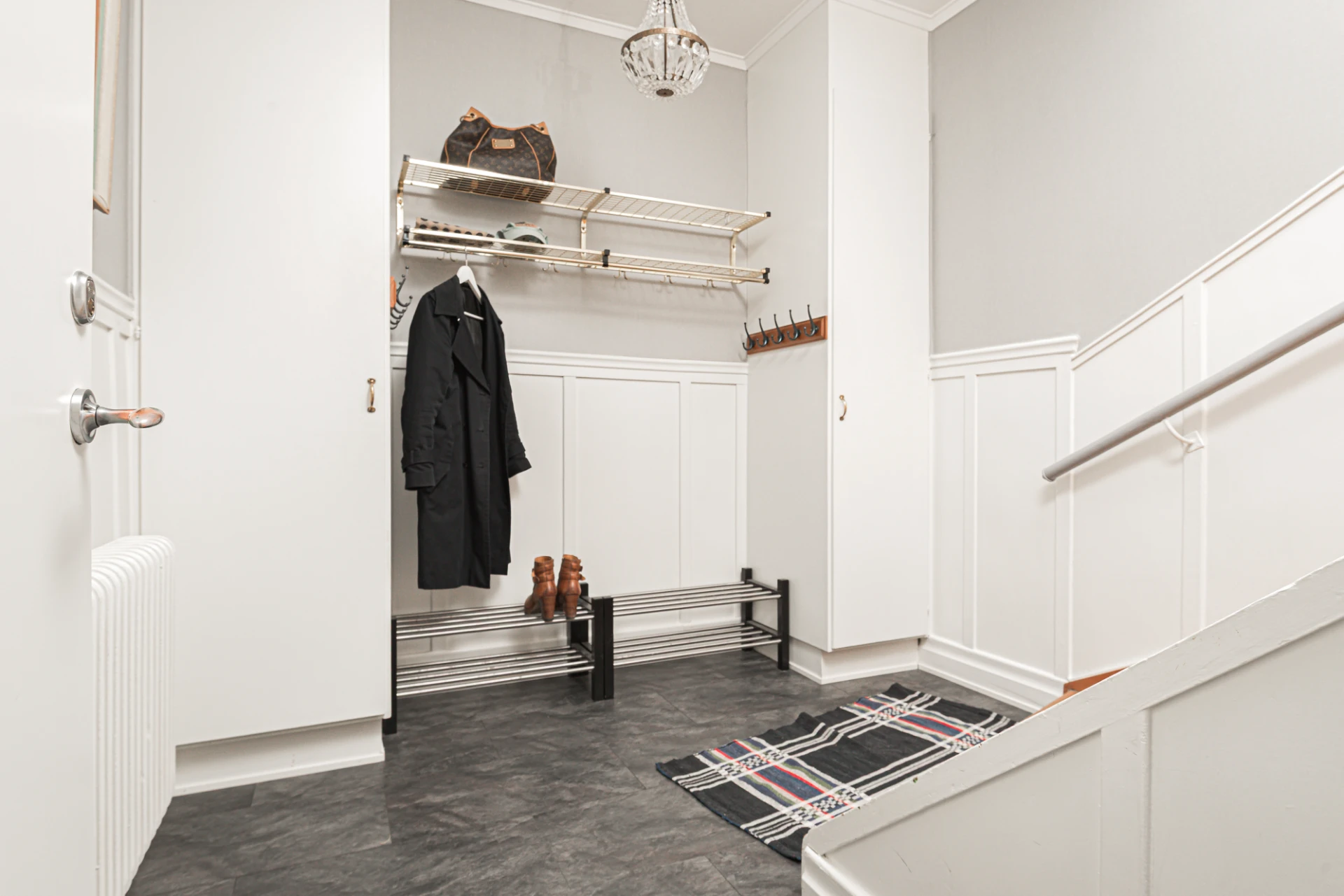 Välkomnande hall på entréplan med praktisk avhängningsyta för ytterkläder.