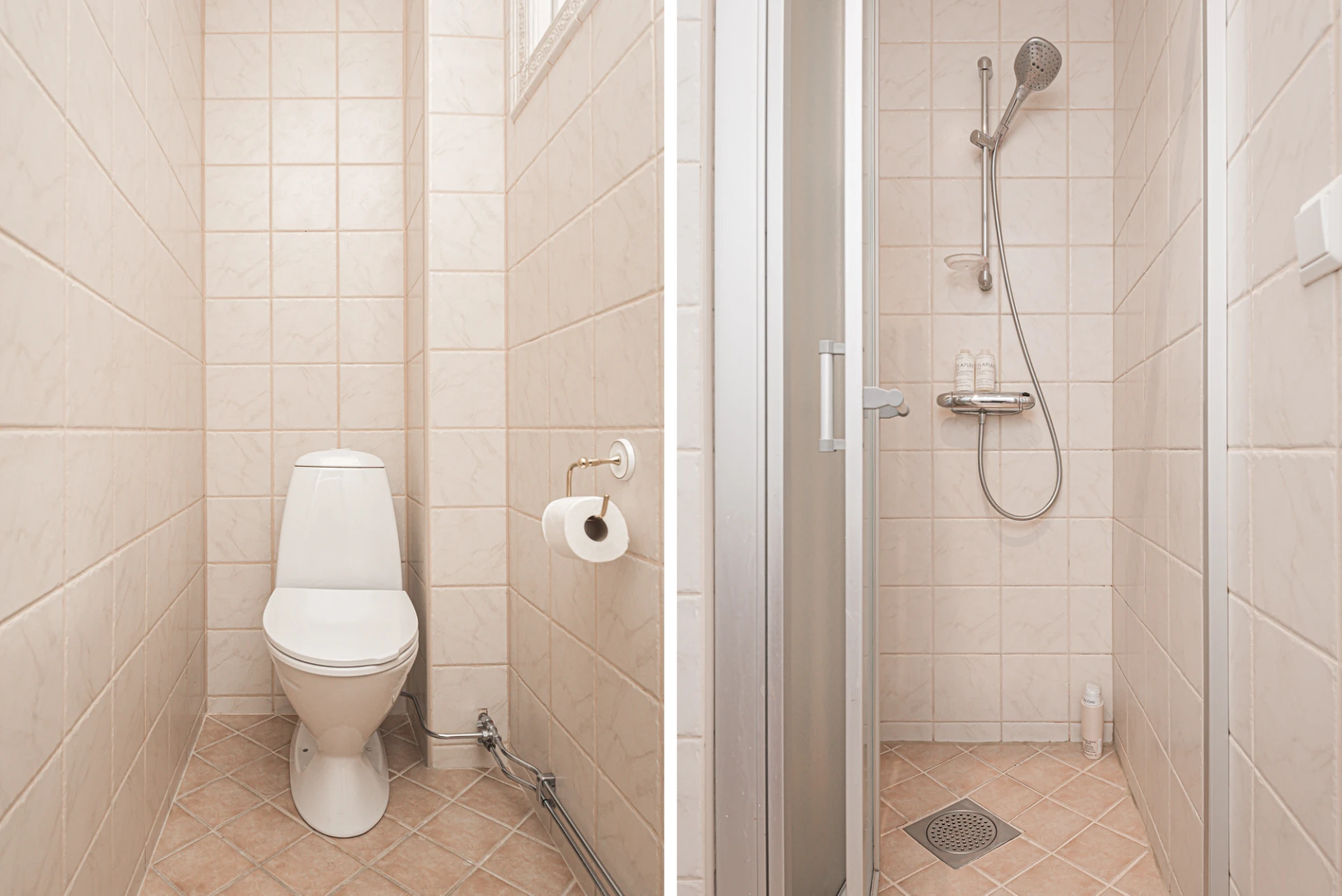 Ett helkaklat badrum med dusch, wc och handfat erbjuder komfort och stil. Elgolvvärme ger extra värme och lyx till denna praktiska och eleganta miljö.