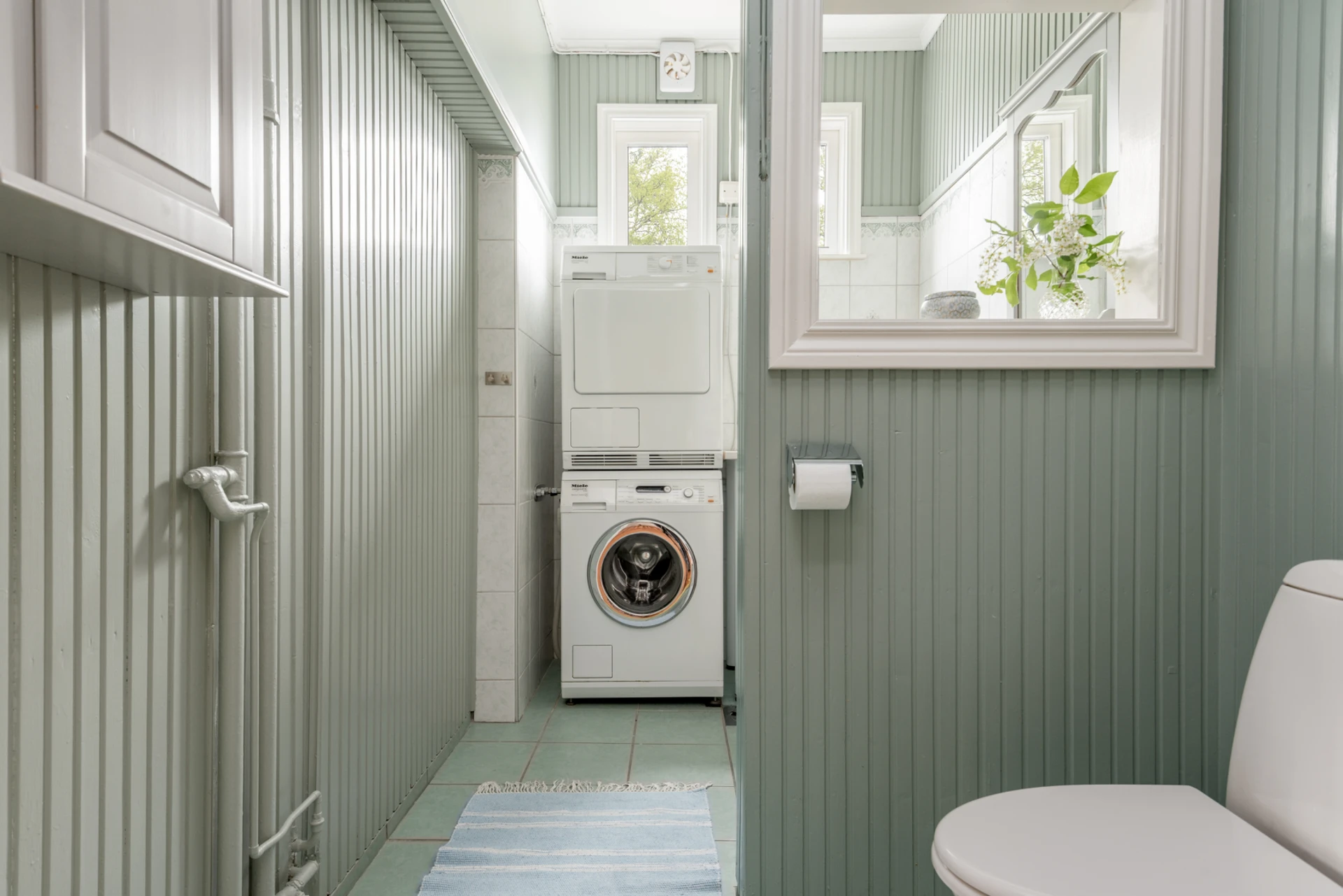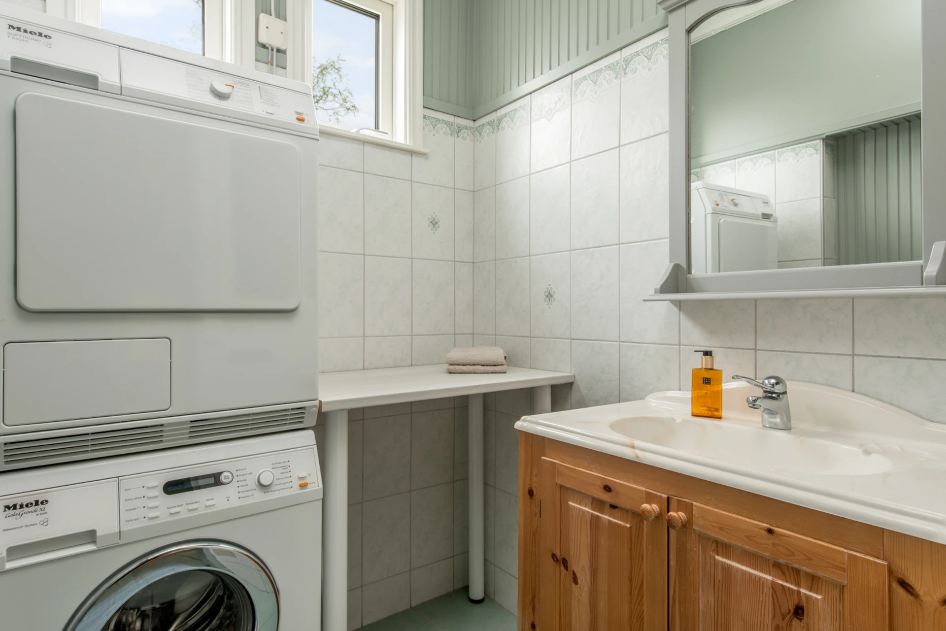 Ett Wc med både toalett och handfat, utrustat med en tvättmaskin och torktumlare, vilket ger bekväm tillgång till både hygien och tvättmöjligheter.