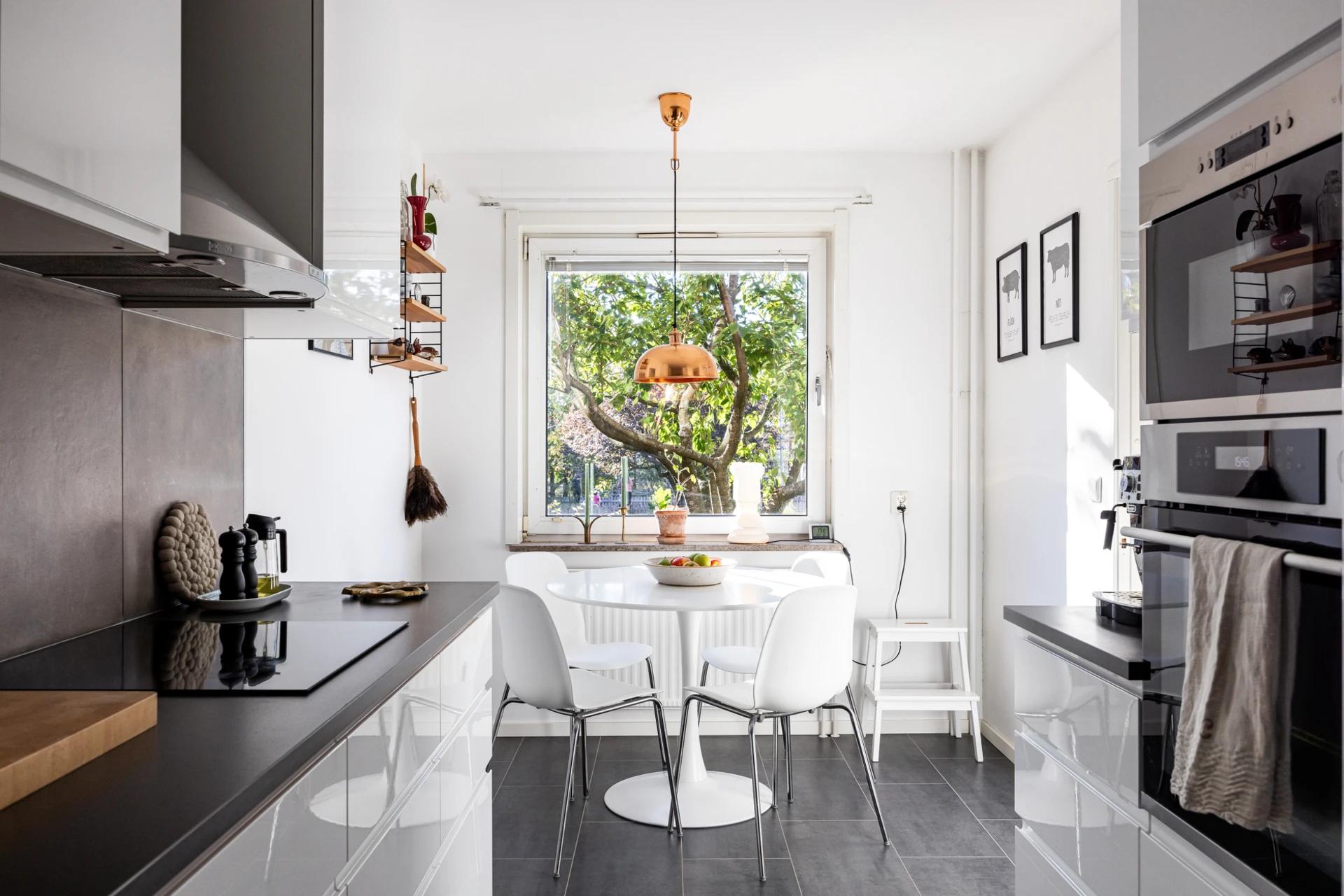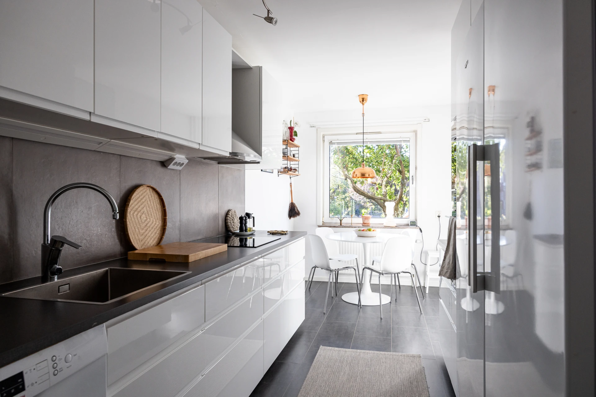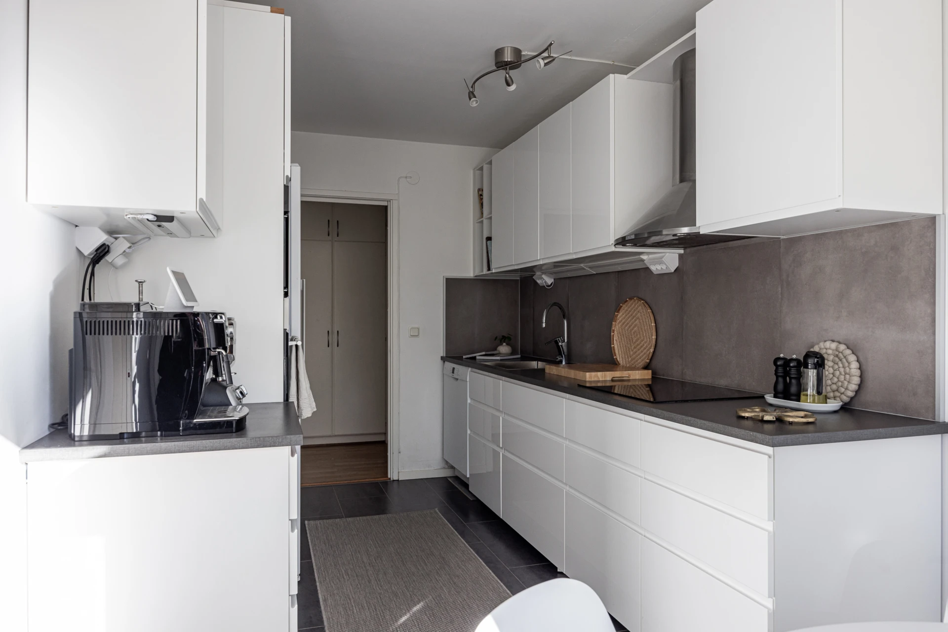 Grått laminatgolv och vita väggar med fönsterbänkar i natursten. Köksinredning i vitt från IKEA och ovan bänkskivan i grå laminat sitter grå klinker. Köket är utrustat med kyl och frys, mikrovågsugn, diskmaskin, induktionshäll, varmluftsugn samt köksfläkt. Matplats för ca fyra personer.